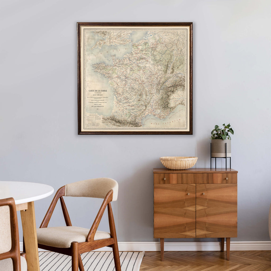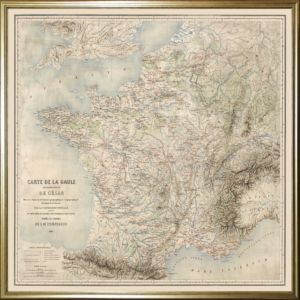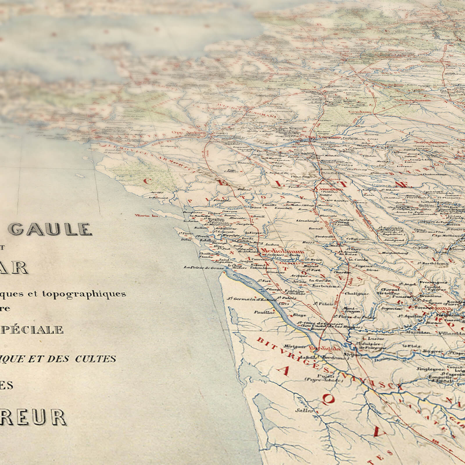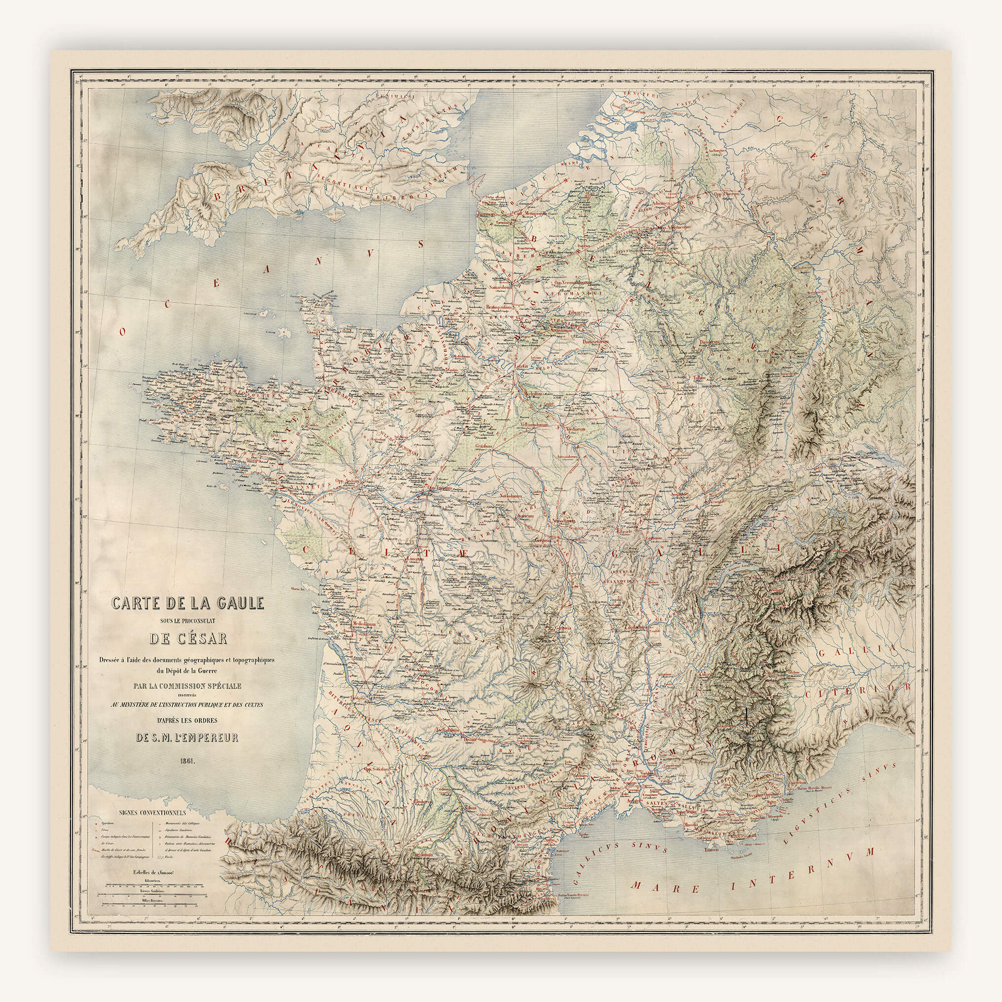 Plongez dans l’histoire antique avec cette magnifique carte de la Gaule, réalisée en 1861 sous le Second Empire. Inspirée directement des récits de Jules César dans La Guerre des Gaules, elle restitue avec précision la géographie, les peuples, les routes et les territoires tels qu’ils étaient connus à l’époque romaine.