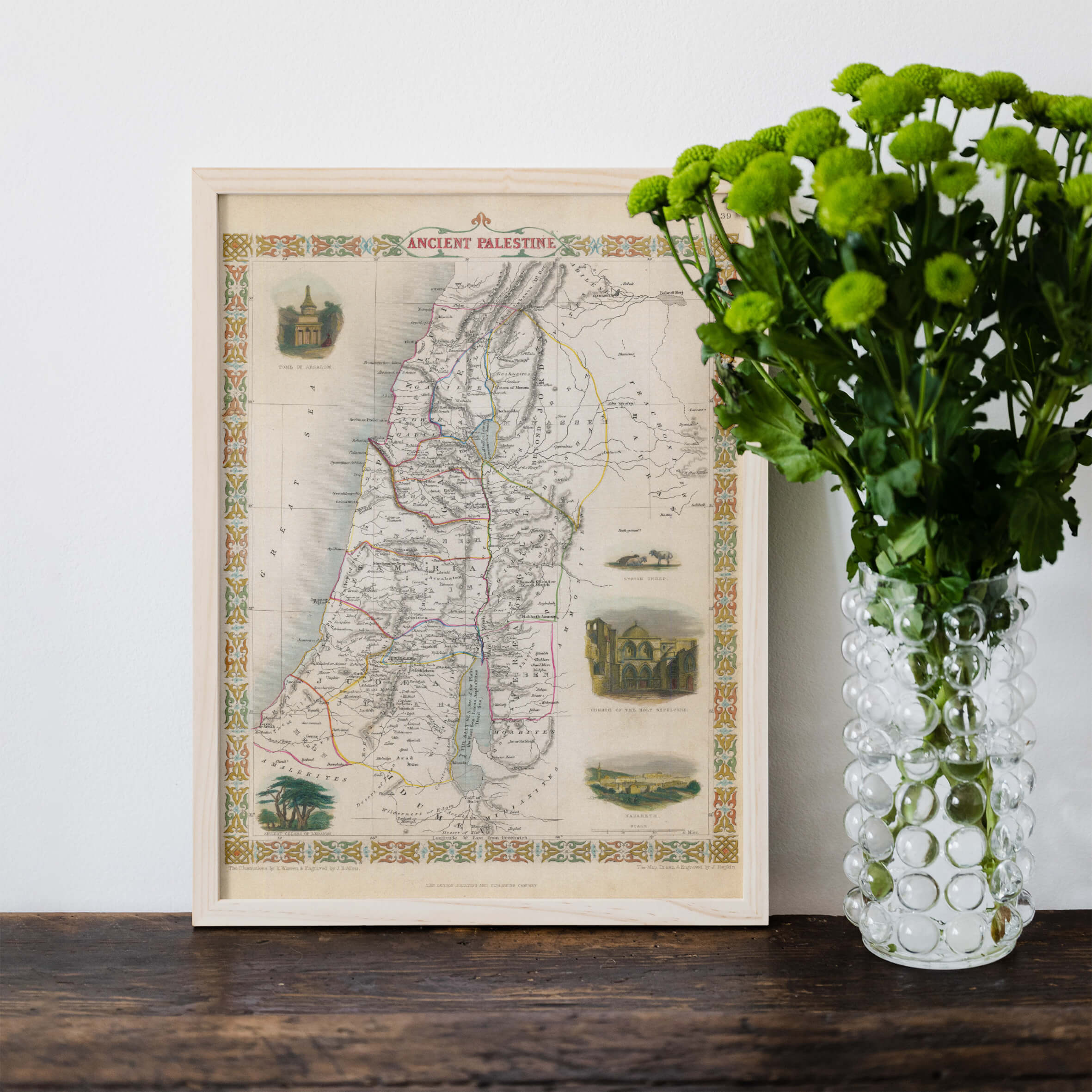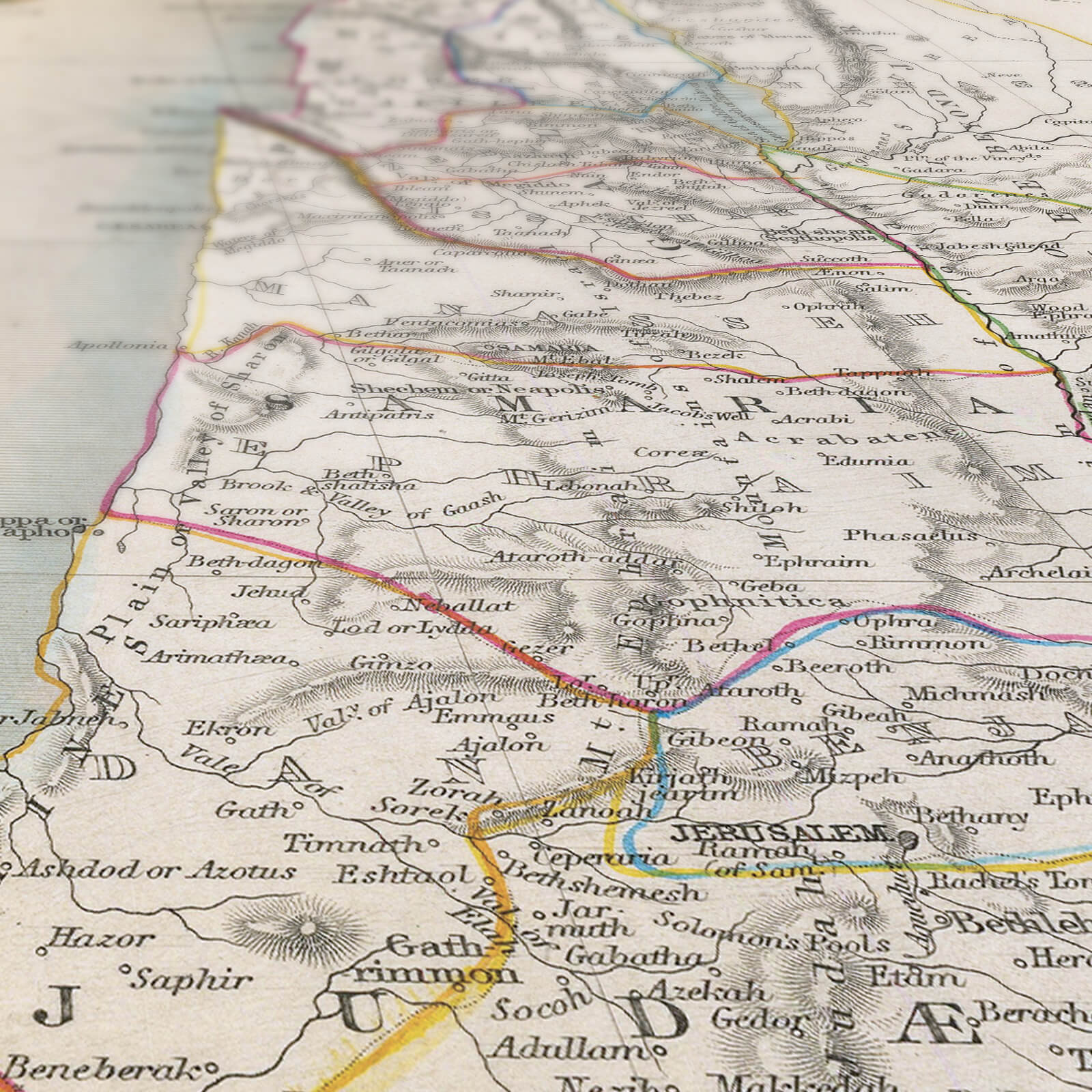 Datant du milieu du XIXe siècle, cette carte n'est pas seulement une représentation géographique ; c'est un document historique qui reflète la perception de la Terre Sainte à cette époque. Elle retrace les noms de lieux et les divisions géographiques liés aux récits bibliques et antiques (comme les tribus d'Israël), faisant le lien entre la géographie de l'époque et l'histoire religieuse. Une pièce fascinante pour les passionnés d'histoire du Moyen-Orient, de géographie ancienne et de patrimoine religieux.