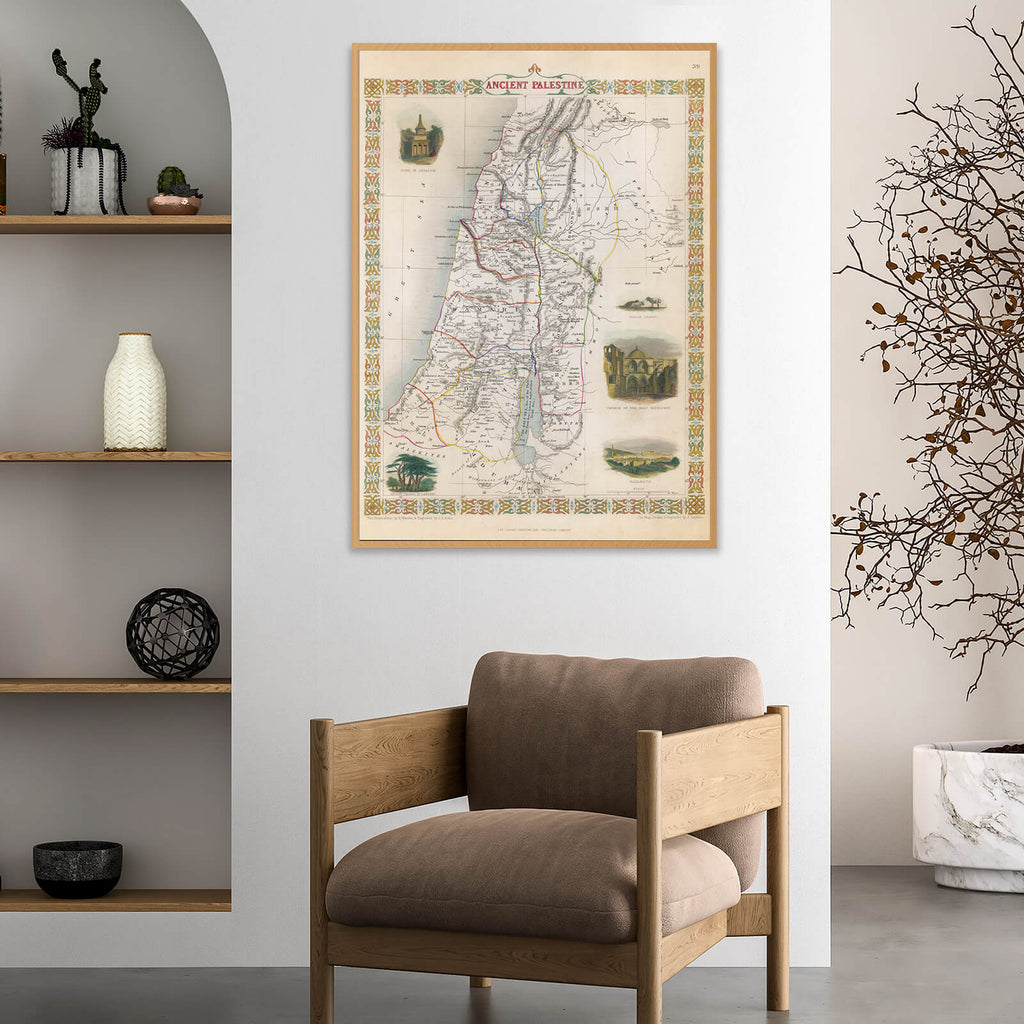 Cette carte est un véritable chef-d'œuvre décoratif. Elle se distingue par ses bordures richement ornées (bordures chromolithographiques typiques de l'époque) et ses médaillons illustrés représentant des sites emblématiques comme l'Église du Saint-Sépulcre ou Nazareth. Les teintes douces et patinées du territoire, contrastant avec les illustrations colorées, lui confèrent une élégance classique et un charme muséal.