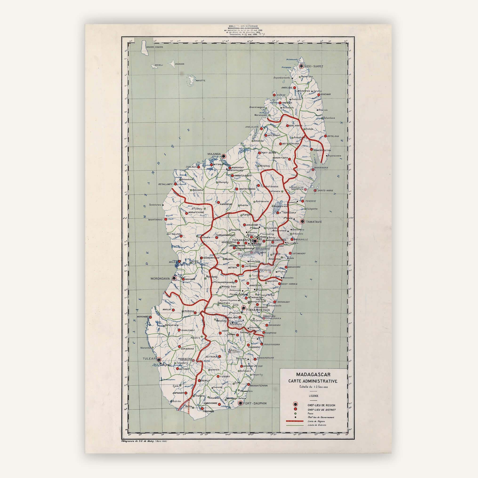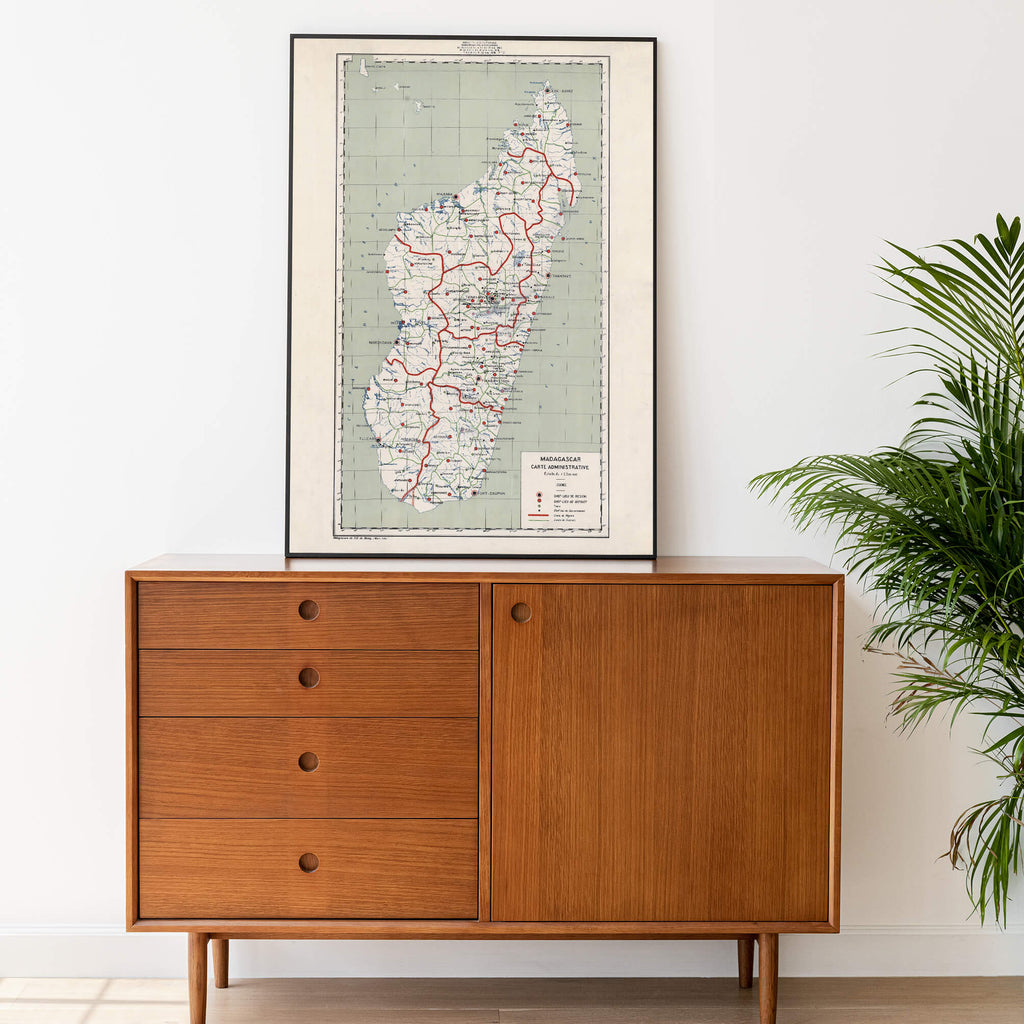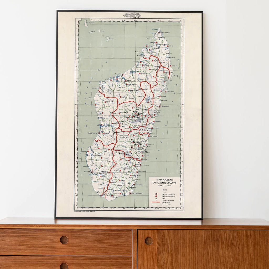 En 1936, cette carte géographique de Madagascar révèle une île en pleine transformation, où les traces de son passé colonial se mêlent à une culture riche et diversifiée. Les villes côtières, telles que Tananarive (aujourd'hui Antananarivo) et Majunga (Mahajanga), témoignent de l'influence française avec leur architecture coloniale et leur activité portuaire animée. Les vastes étendues de forêts tropicales du nord-est abritent une flore et une faune uniques au monde, tandis que les hauts plateaux centraux sont parsemés de rizières en terrasses et de villages traditionnels malgaches.