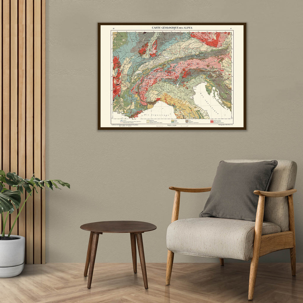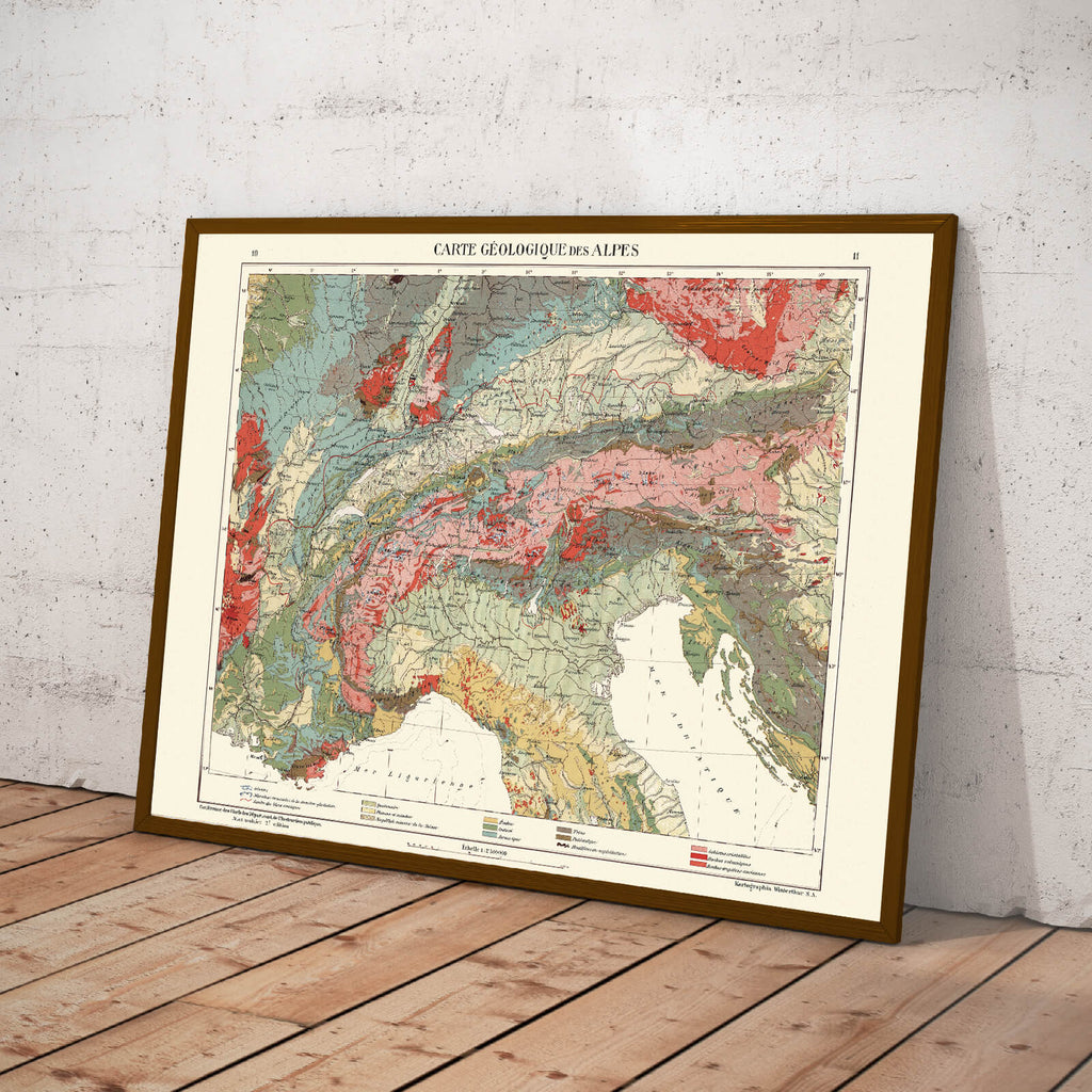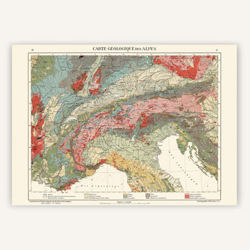 Explorez les profondeurs géologiques des Alpes avec cette carte géographique décorative datant de 1921. Cette pièce unique offre un regard fascinant sur la composition et l'histoire de l'une des chaînes de montagnes les plus spectaculaires du monde.