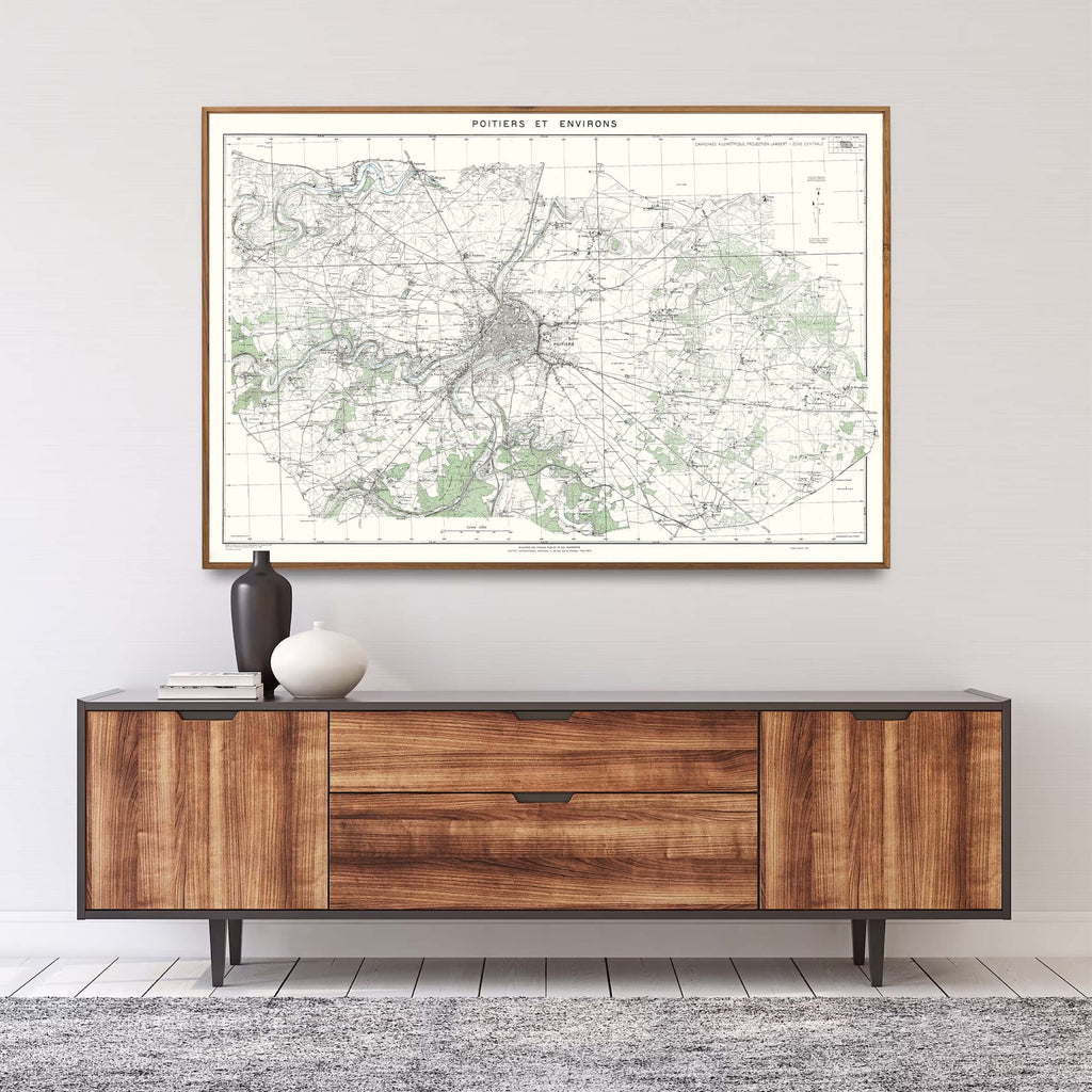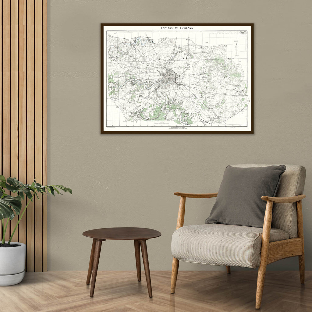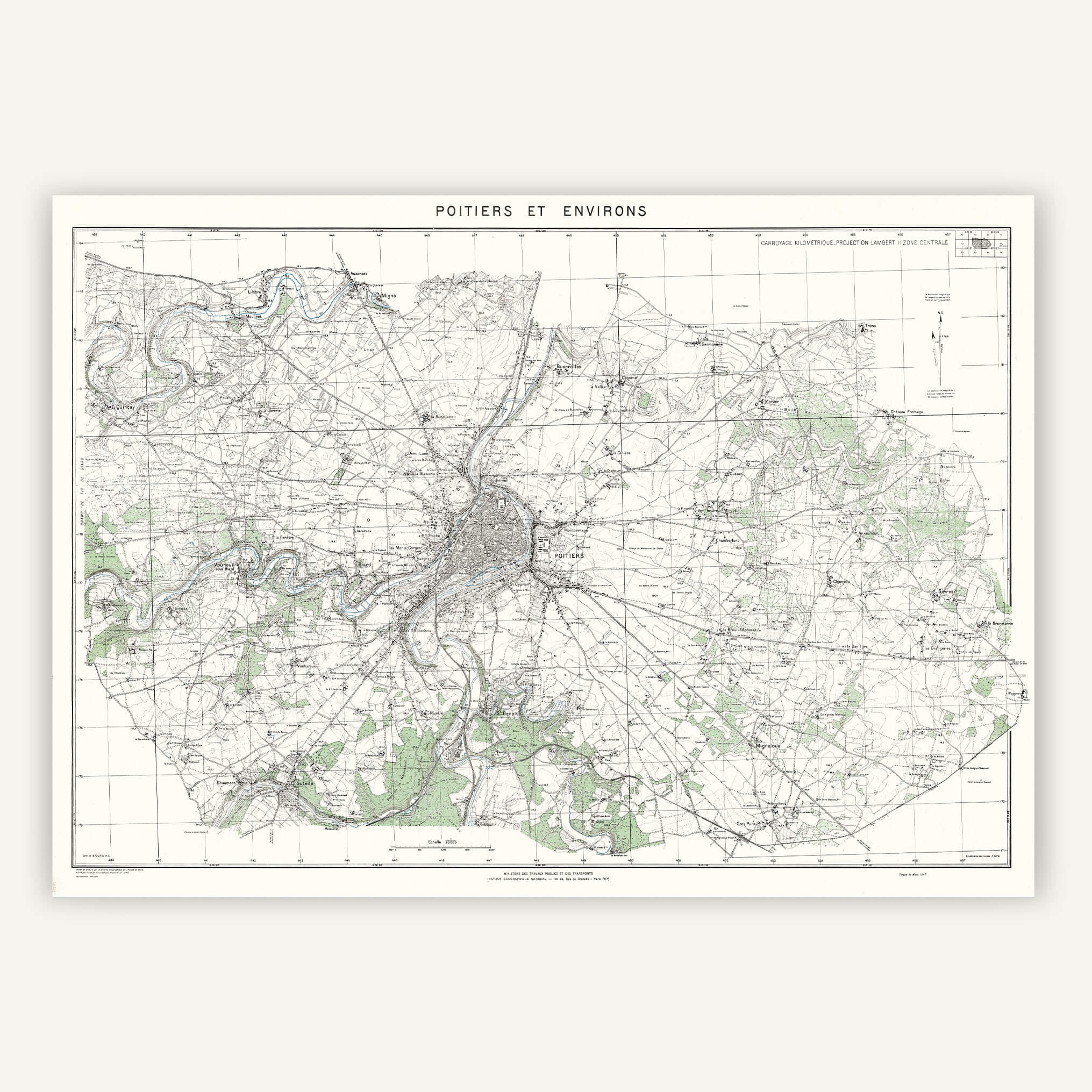 En 1947, cette carte géographique détaillée de Poitiers capturait l'essence historique et architecturale de cette ville emblématique du centre-ouest de la France. Tracée avec précision, elle mettait en lumière les rues sinueuses de la vieille ville, les places animées et les monuments imposants qui témoignaient du riche héritage de Poitiers.