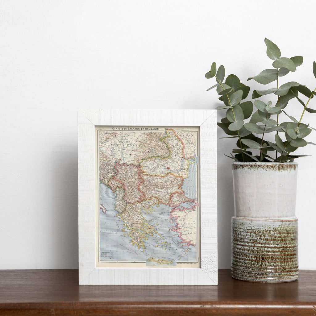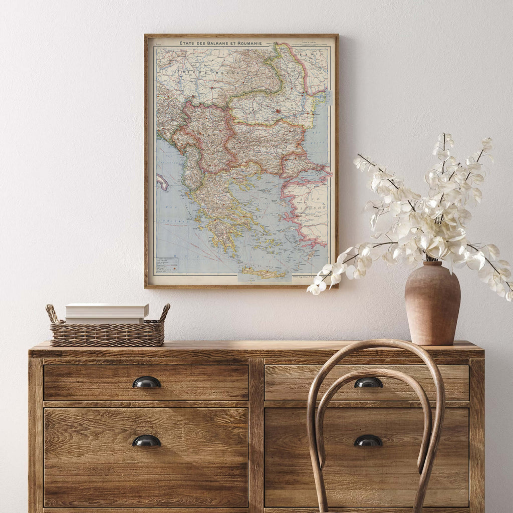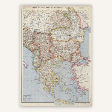 Cette reproduction d'une carte originale datant d'environ 1915 offre un aperçu remarquable de la situation géopolitique complexe des Balkans et de la Roumanie au début de la Première Guerre mondiale. Elle dépeint une région dont les frontières étaient en constante redéfinition après les guerres balkaniques et avant l'éclatement des grands empires.