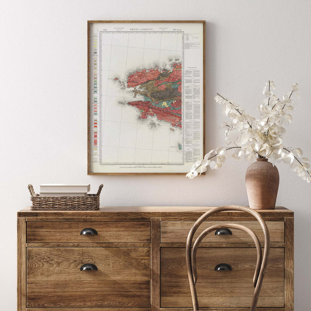 Cette ancienne carte géographique topographique des départements du Finistère et du Morbihan datant de 1943 est un véritable trésor décoratif. Imprimée sur un papier italien de qualité, elle transporte les observateurs dans une ère révolue avec son charme vintage et ancien. Ses reliefs et ses couleurs nous font voyager au coeur des terres bretonnes !