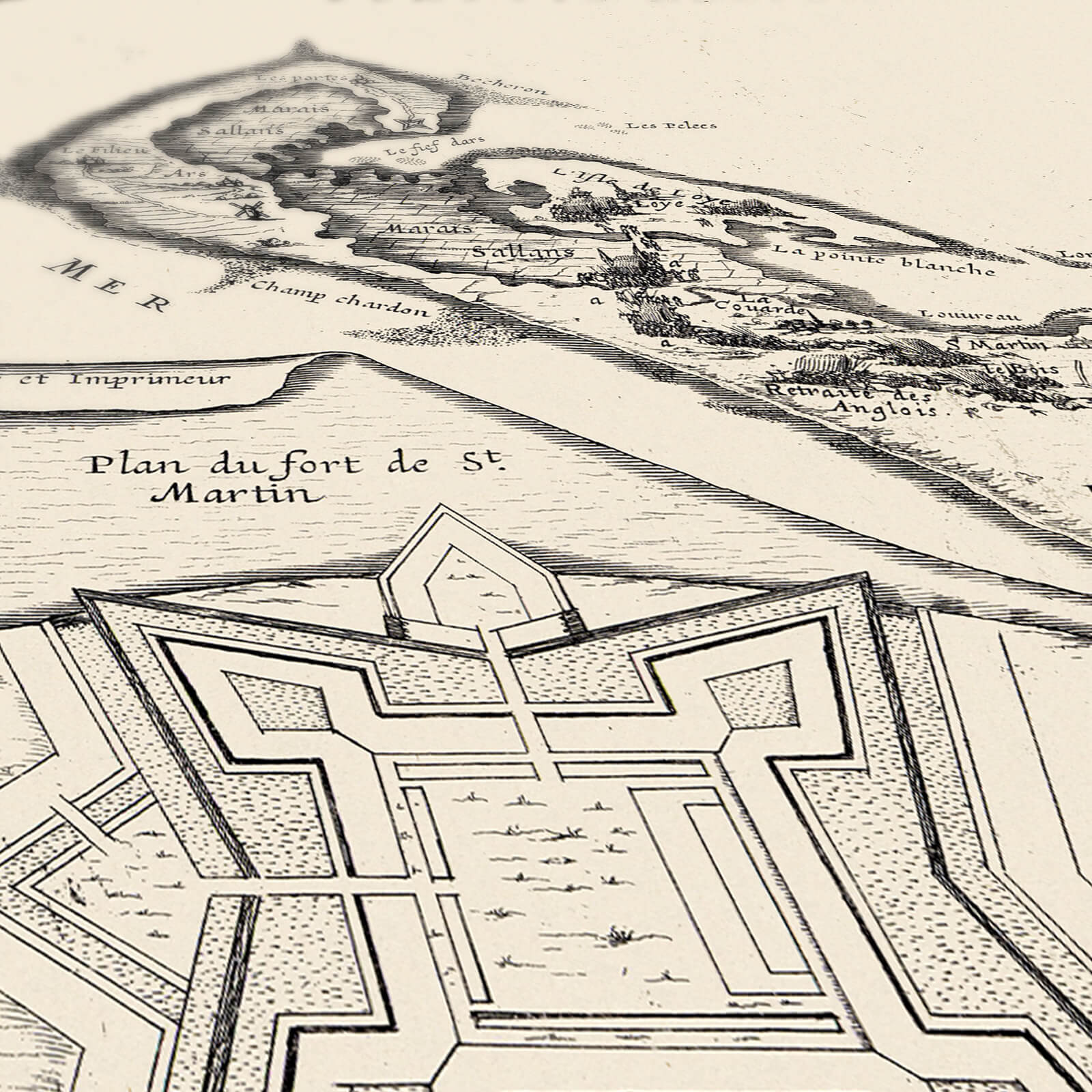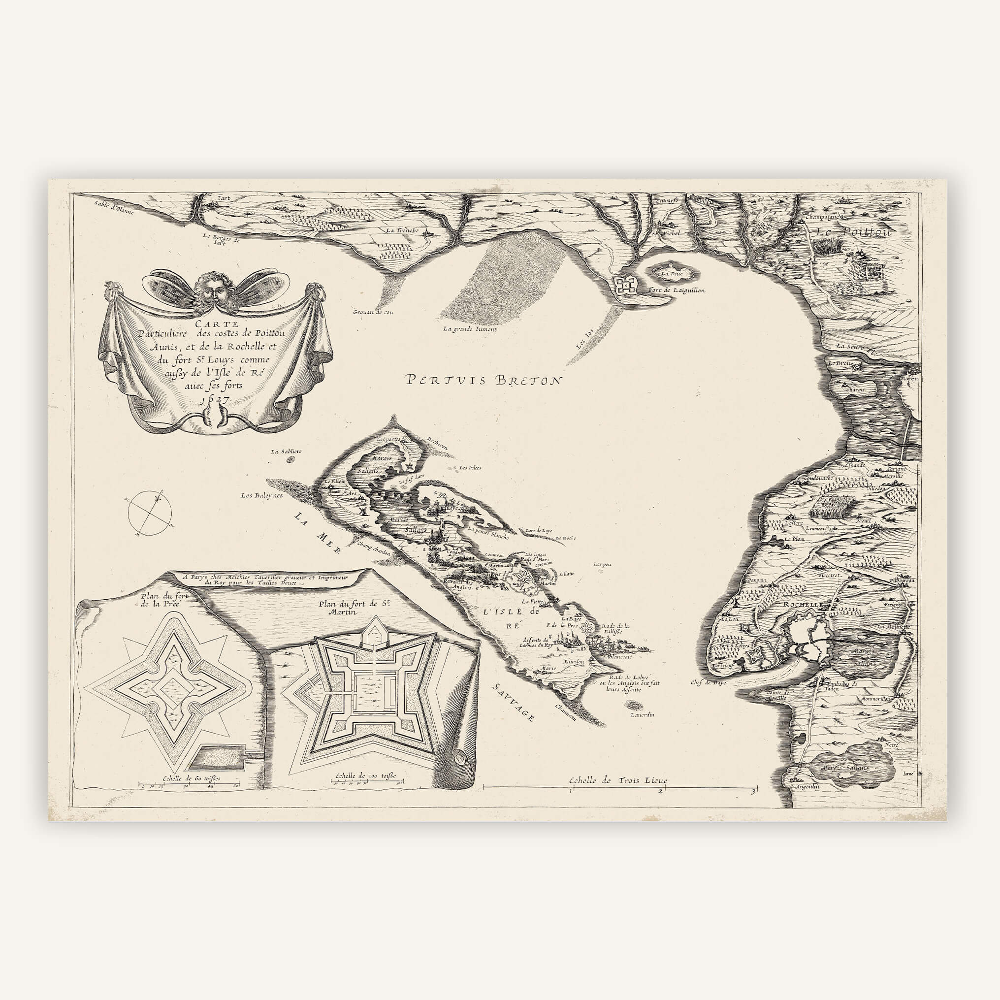 Cette carte géographique de l'île de Ré datant de 1627 offre un regard fascinant sur cette île emblématique de la côte atlantique française à une époque où elle était encore peu explorée et souvent sujette aux assauts des marées et des intempéries.