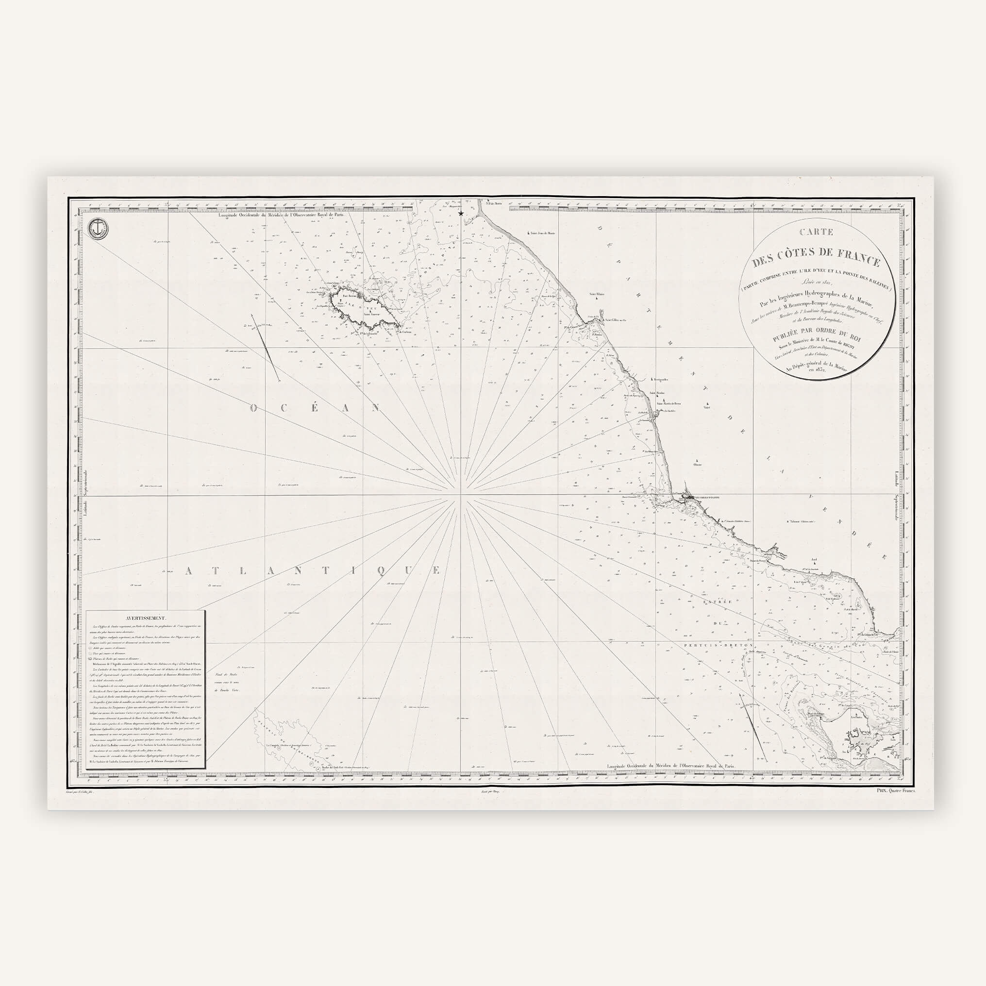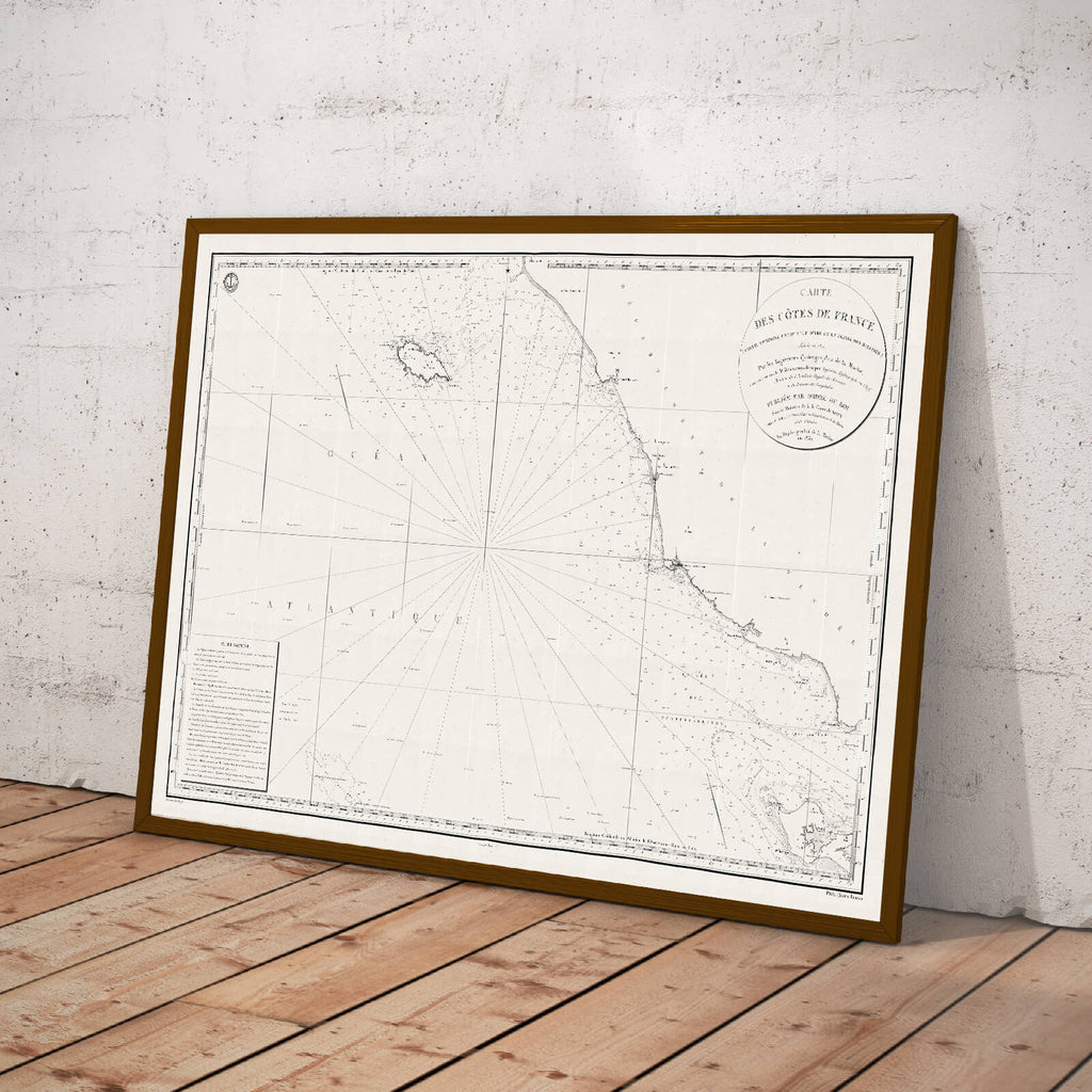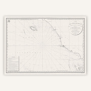La carte géographique de la côte vendéenne et de l'Île d'Yeu, datant de 1832, dépeint un paysage marin envoûtant et préservé. Avec une minutie remarquable, elle révèle les contours tourmentés de cette île insulaire, où la nature règne en maître et où l'histoire se mêle intimement au quotidien des habitants.