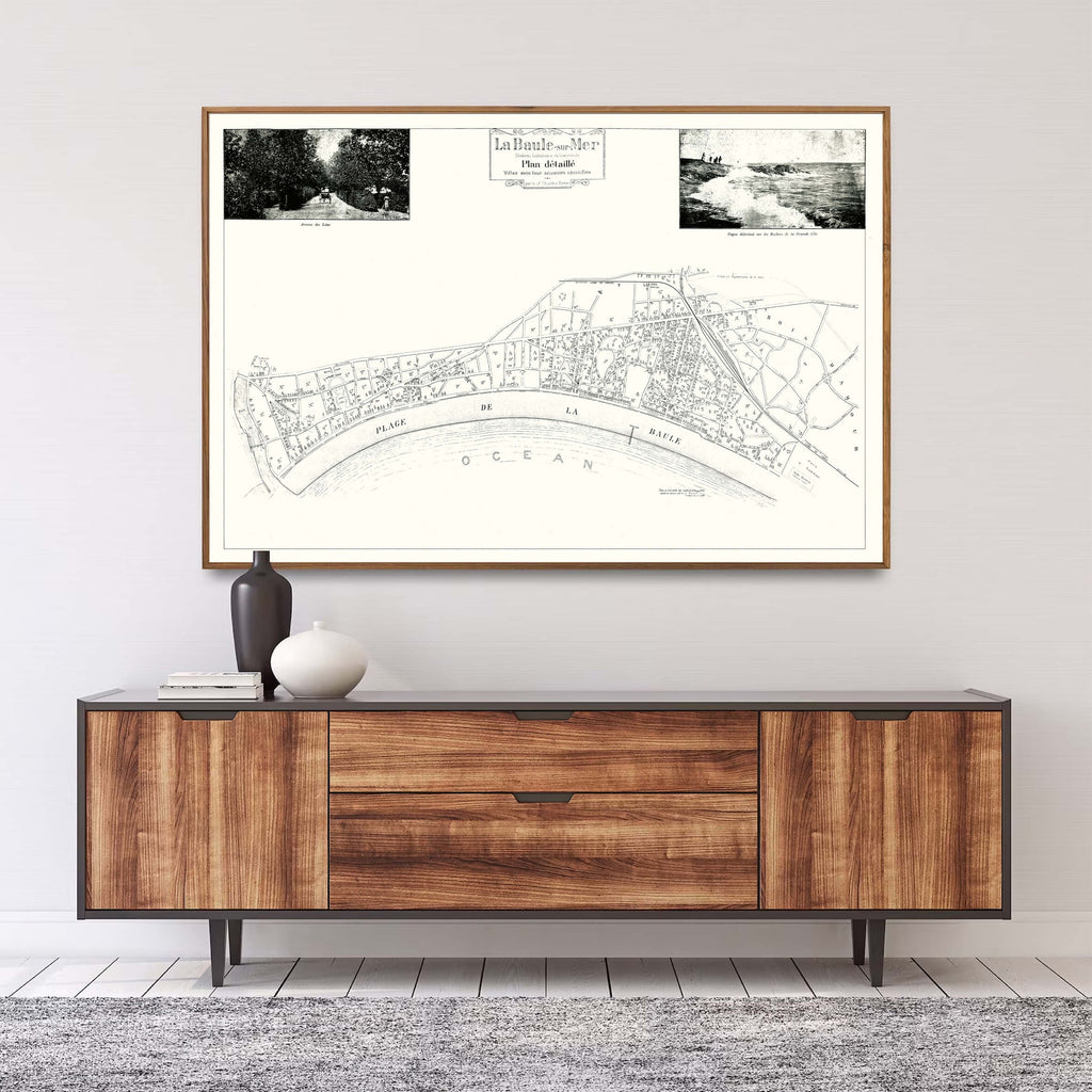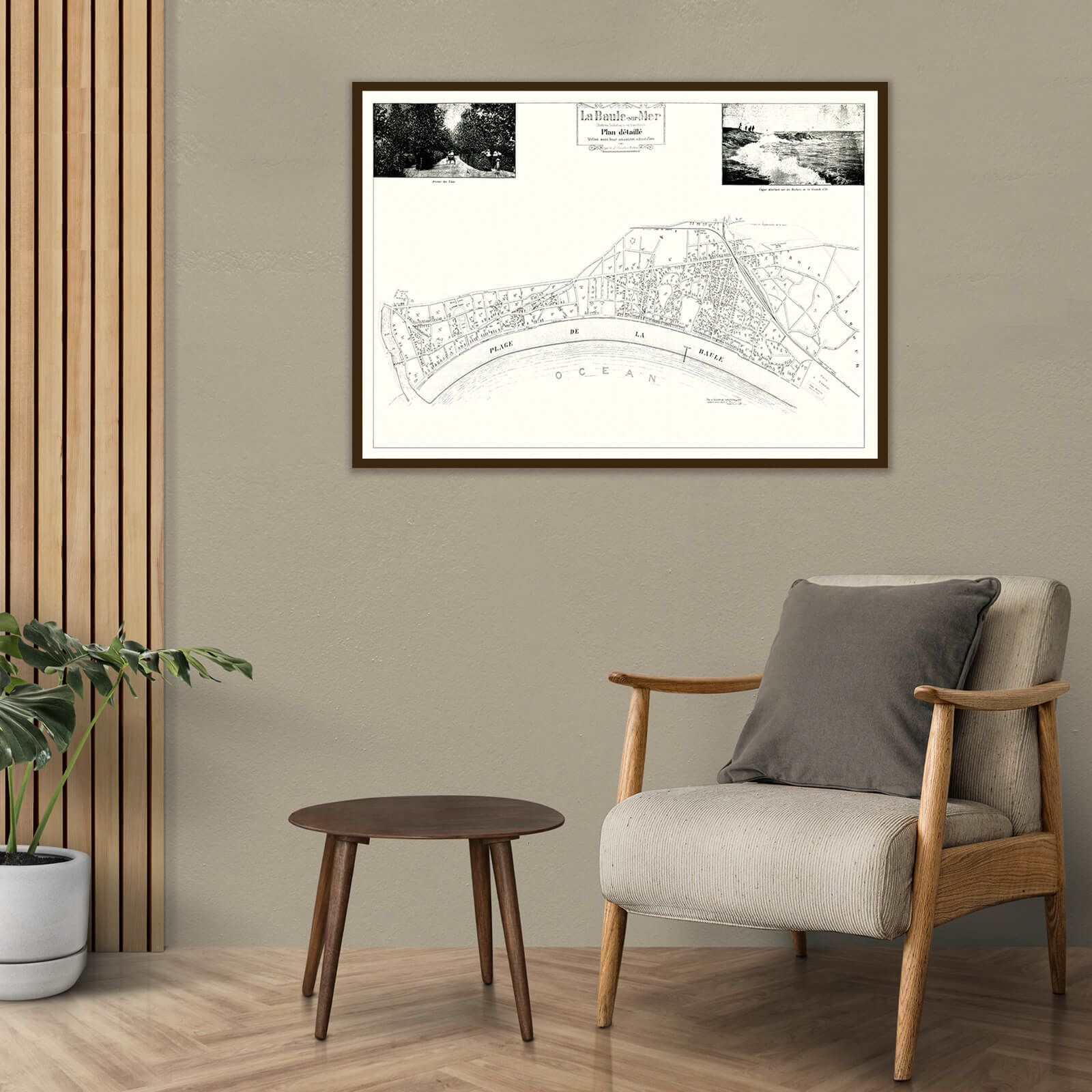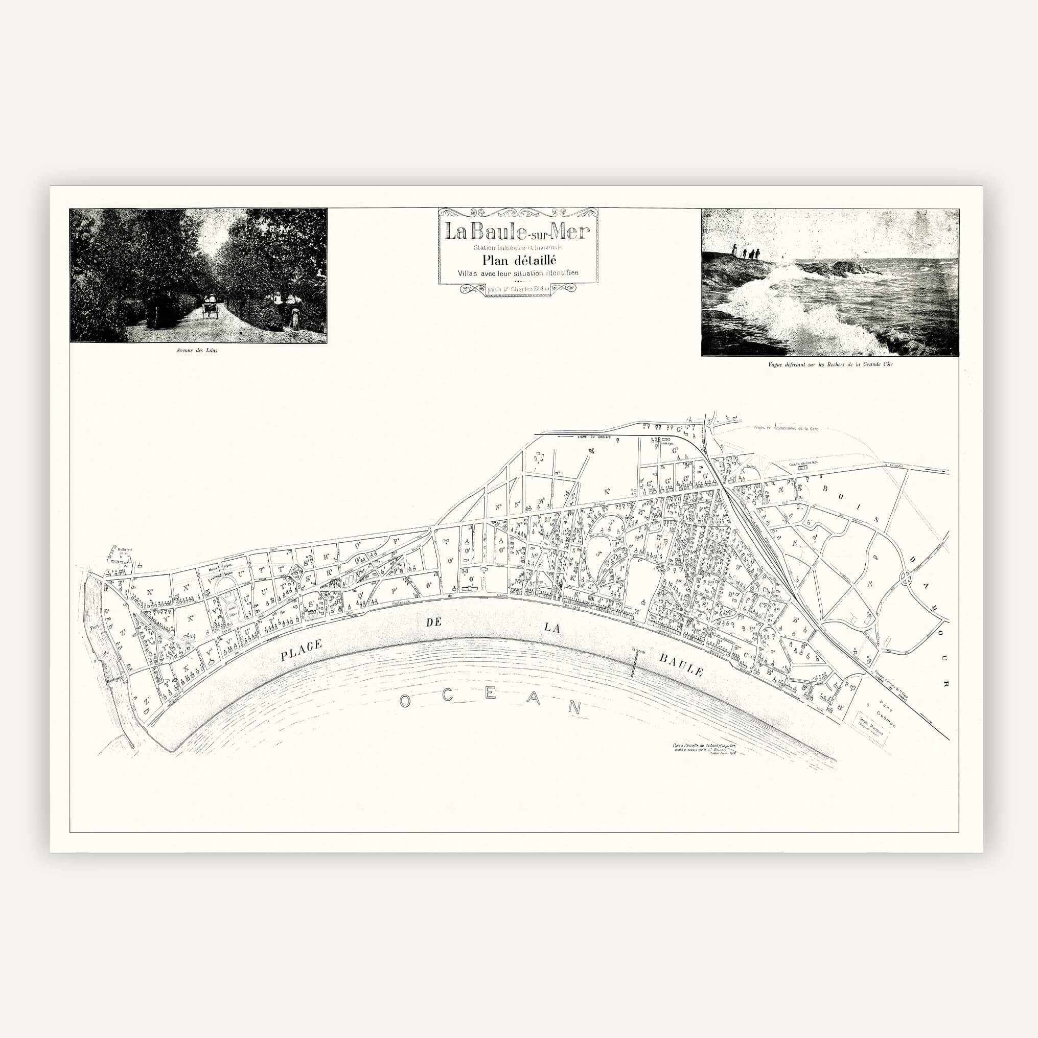 Promenez-vous le long de la Baie de la Baule (la Baule-Escoublac) sur la Côte d'Amour avec cette carte géographie originale composée de photographies en noir et blanc et de traits minimaliste !