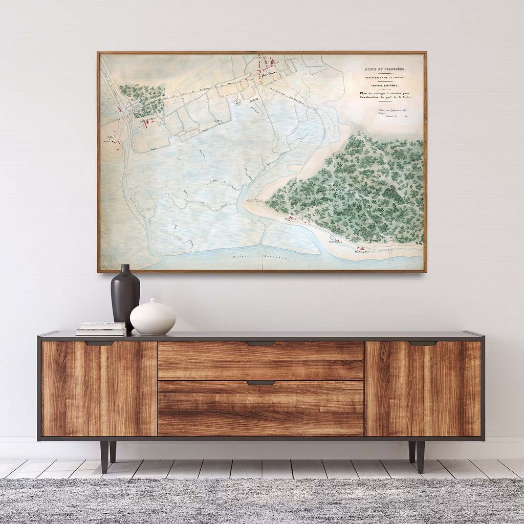 Plongez au cœur de l’histoire du Bassin d’Arcachon avec cette superbe carte ancienne représentant La Teste-de-Buch et ses environs. Datée du XVIIe siècle, elle illustre avec une précision remarquable les aménagements maritimes, les zones boisées ainsi que les cours d’eau qui dessinaient déjà le paysage unique de cette région.