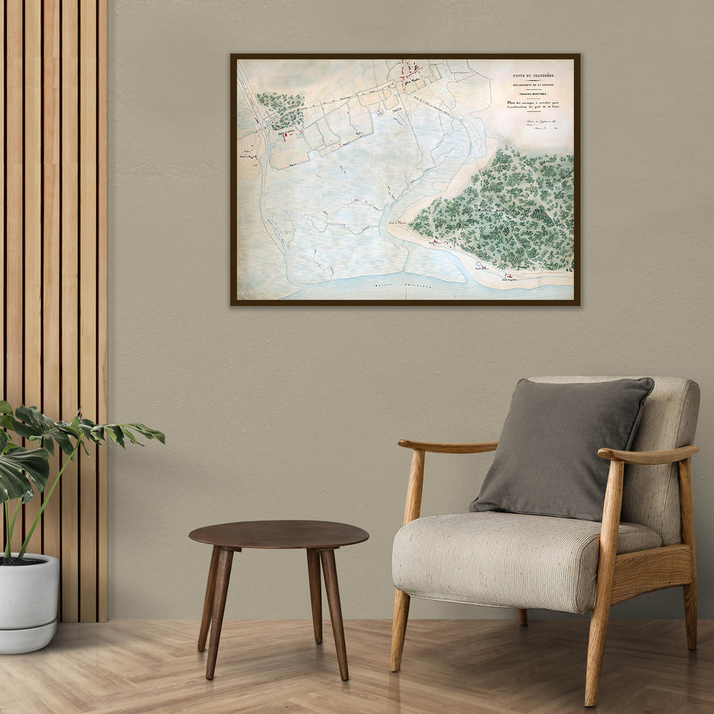 Au-delà de sa valeur documentaire, cette carte séduit par son esthétique singulière : tracés délicats, aplats aquarellés aux tons doux, et détails minutieux qui en font une véritable œuvre graphique. Sa patine et son style d’époque apportent un charme authentique qui saura sublimer un intérieur, que ce soit dans une bibliothèque, un bureau ou un salon.