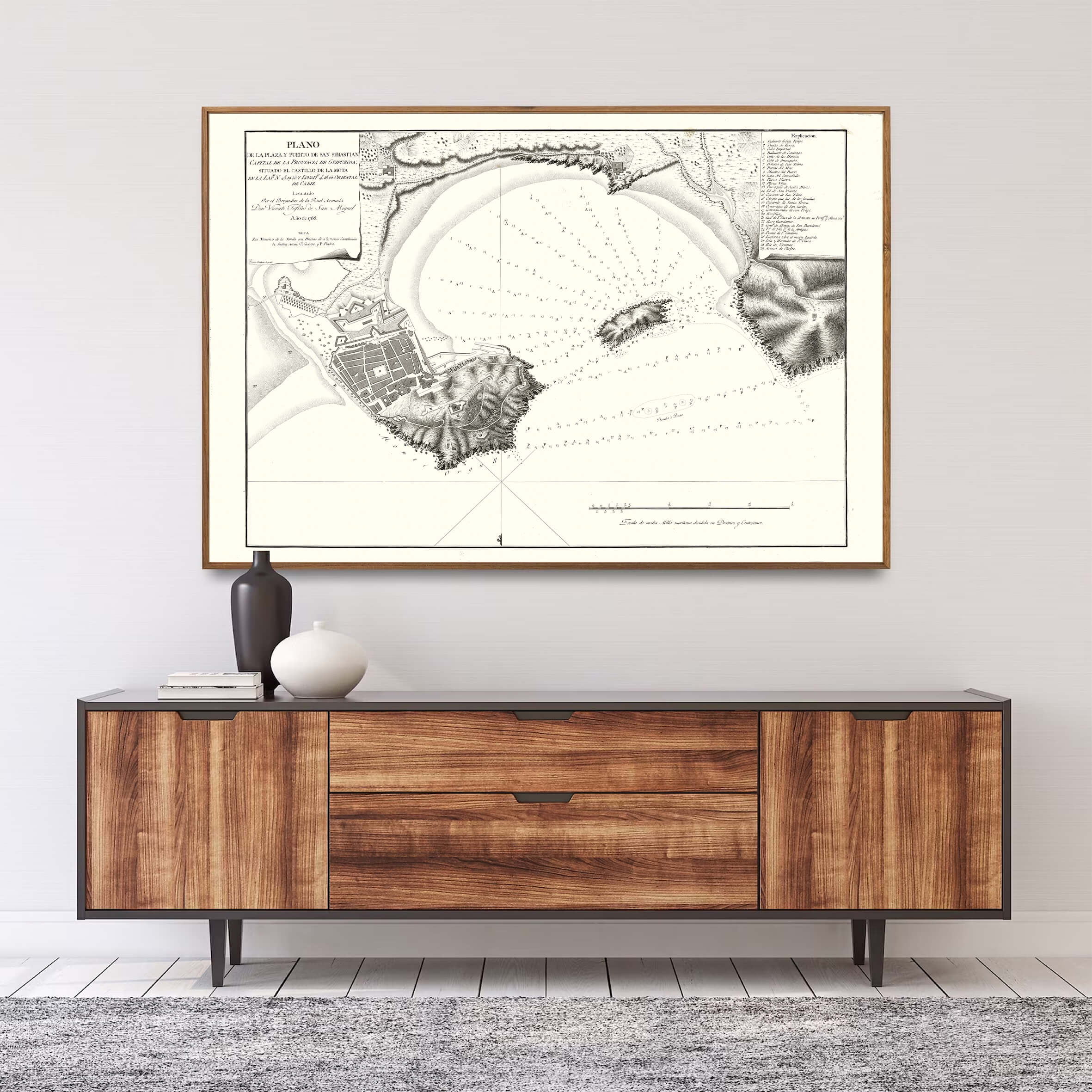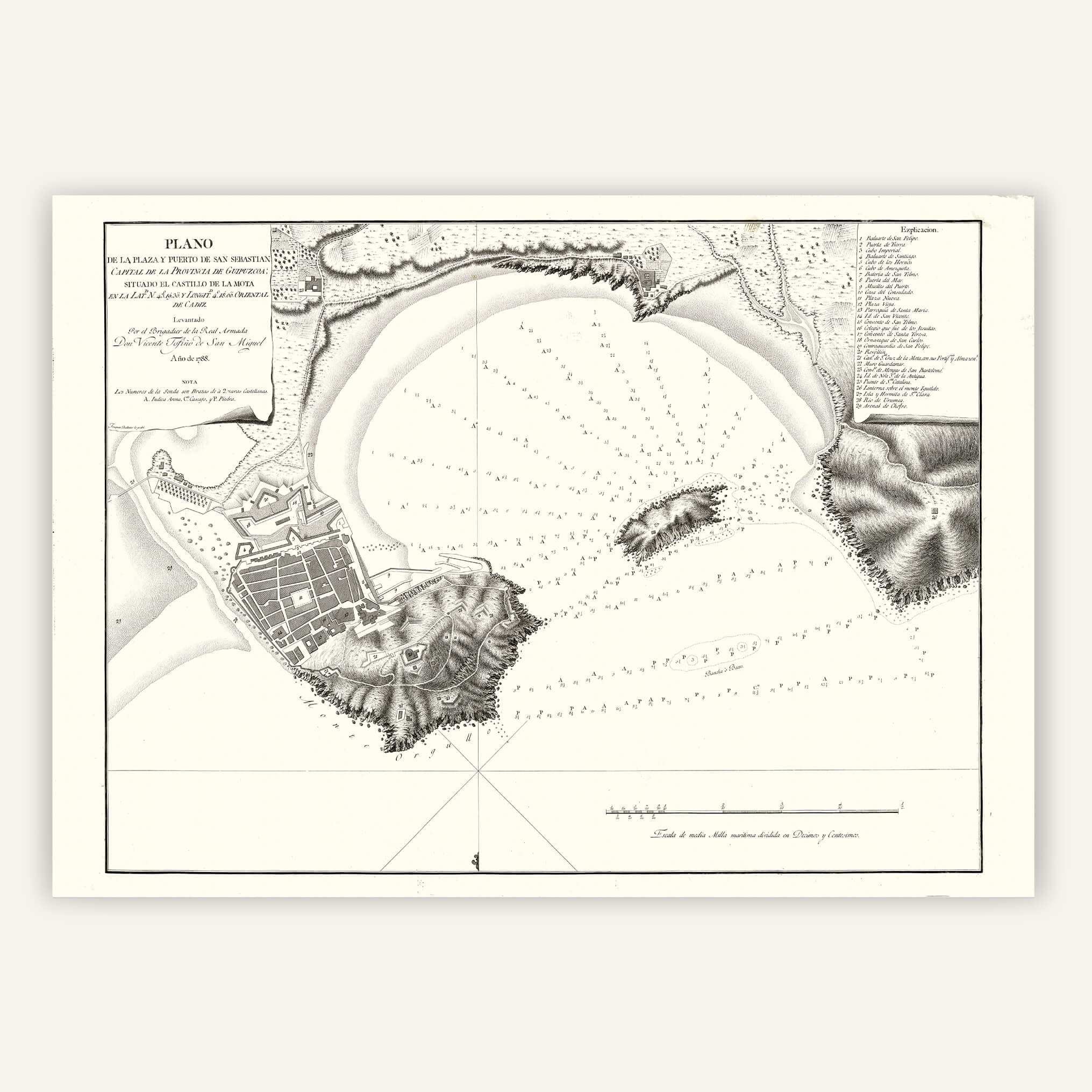 En 1788, cette carte géographique de Saint-Sébastien, ville portuaire espagnole nichée sur la côte nord de l'Espagne, aurait dévoilé un panorama urbain qui reflétait l'empreinte de l'histoire et du commerce maritime. Les contours de la vieille ville, avec ses ruelles sinueuses et ses places animées, étaient minutieusement représentés, offrant un aperçu de l'architecture caractéristique de l'époque.