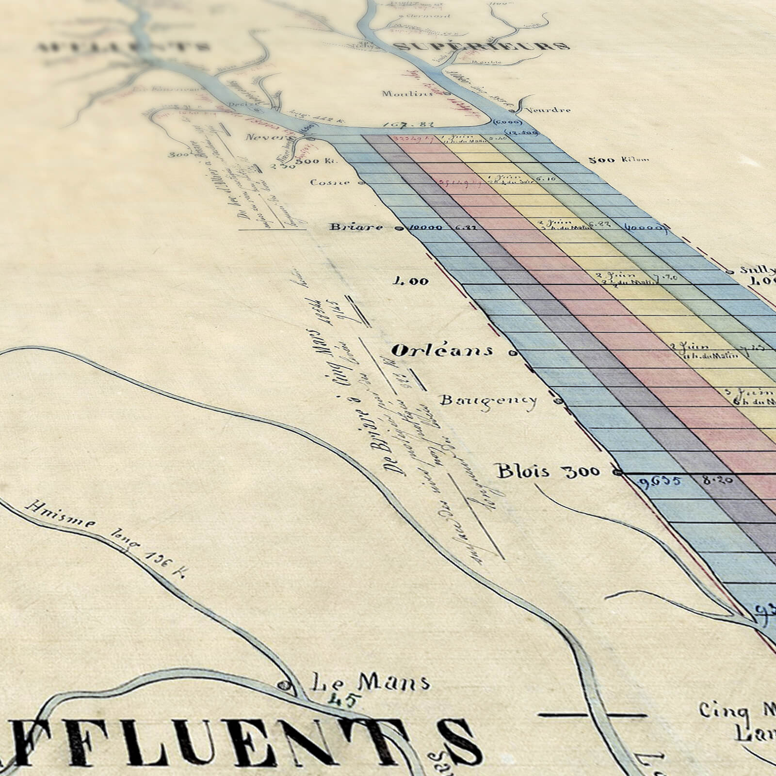 En 1856, ce tableau synoptique de la Loire se révélait comme une précieuse source d'informations géographiques. Sur ce papier, chaque méandre du fleuve, chaque ville riveraine, étaient méticuleusement tracés, offrant une vue d'ensemble détaillée de cette voie navigable emblématique.