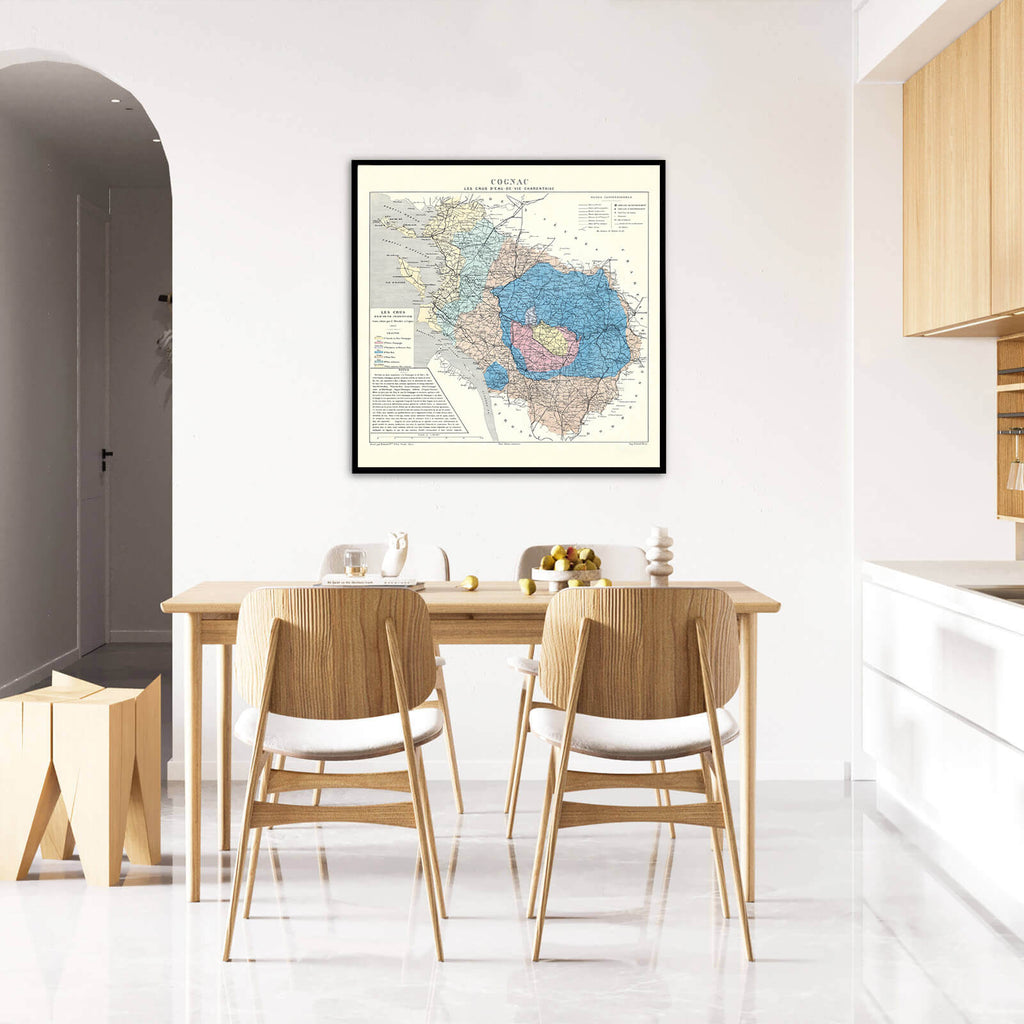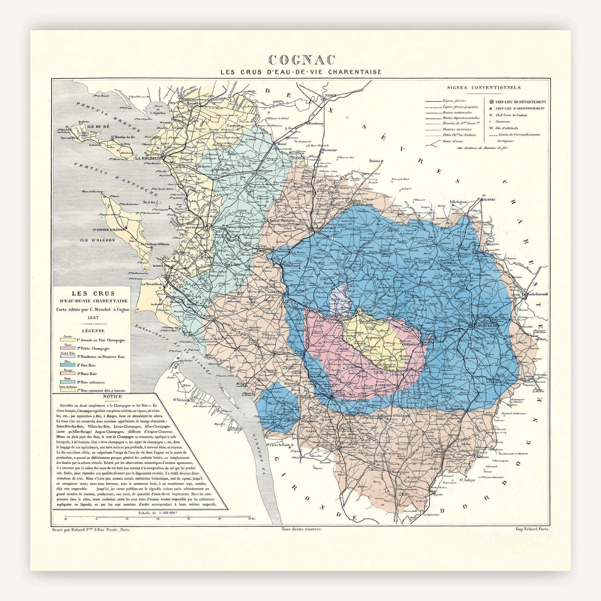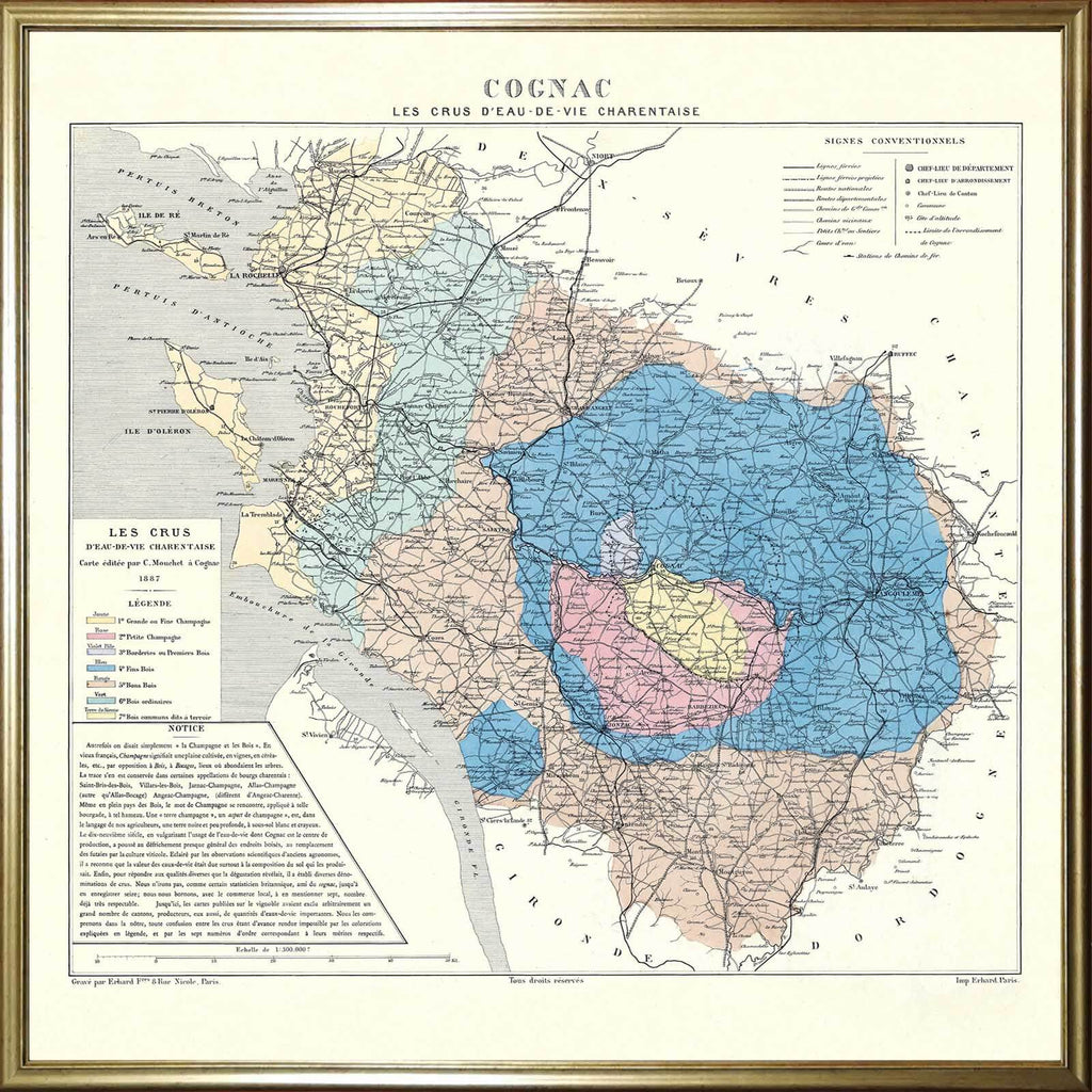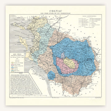 En 1887, cette carte géographique des vignobles de Cognac aurait tracé méticuleusement les contours des terres viticoles qui donnent naissance à l'un des spiritueux les plus prestigieux au monde. Les collines douces de la région de Charente, en France, seraient ponctuées de vignobles luxuriants, où les ceps de raisin destinés à la production du célèbre cognac s'épanouiraient.