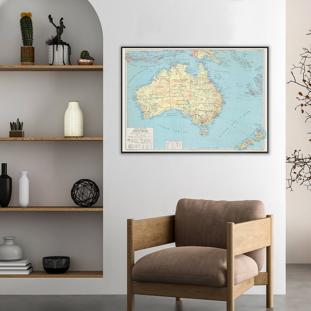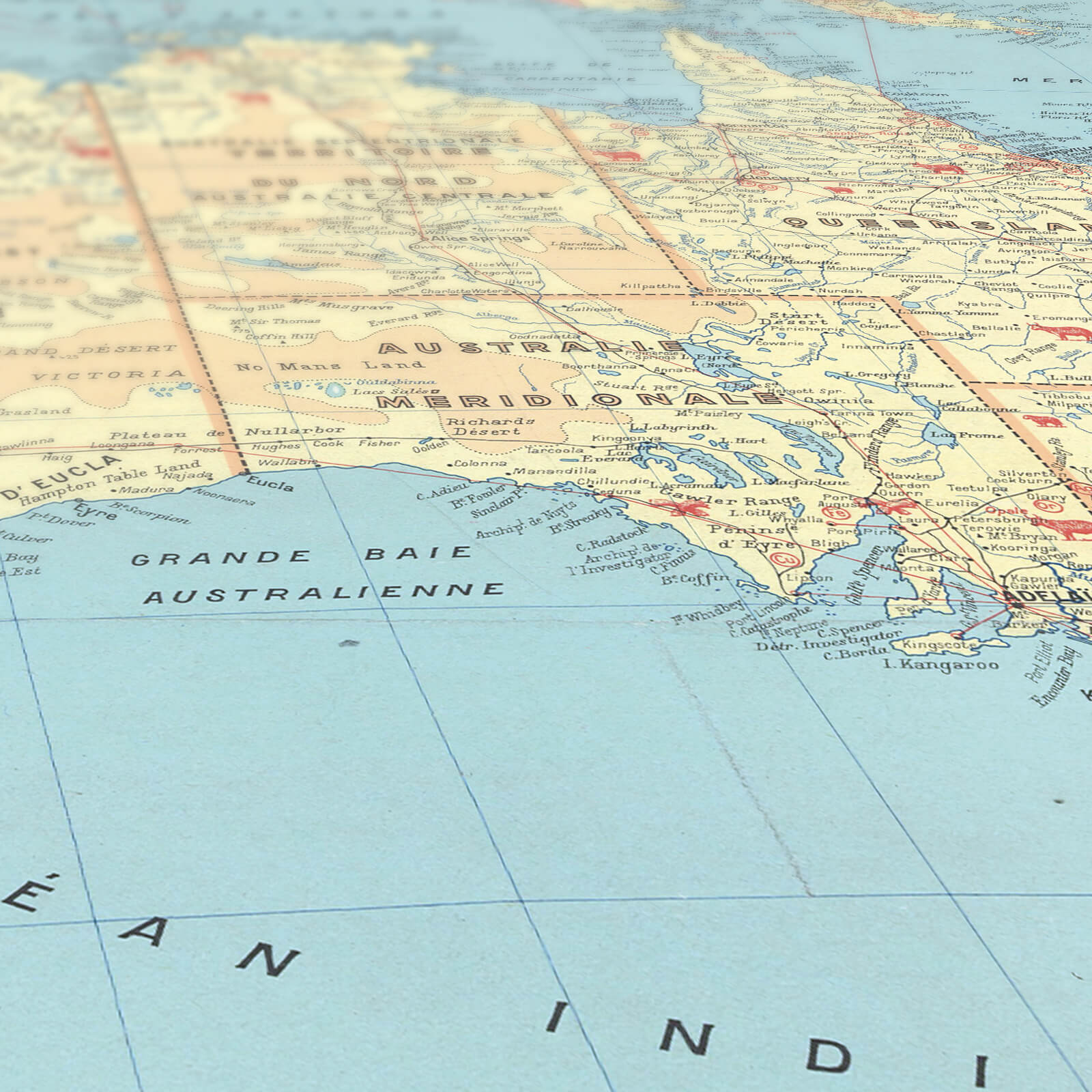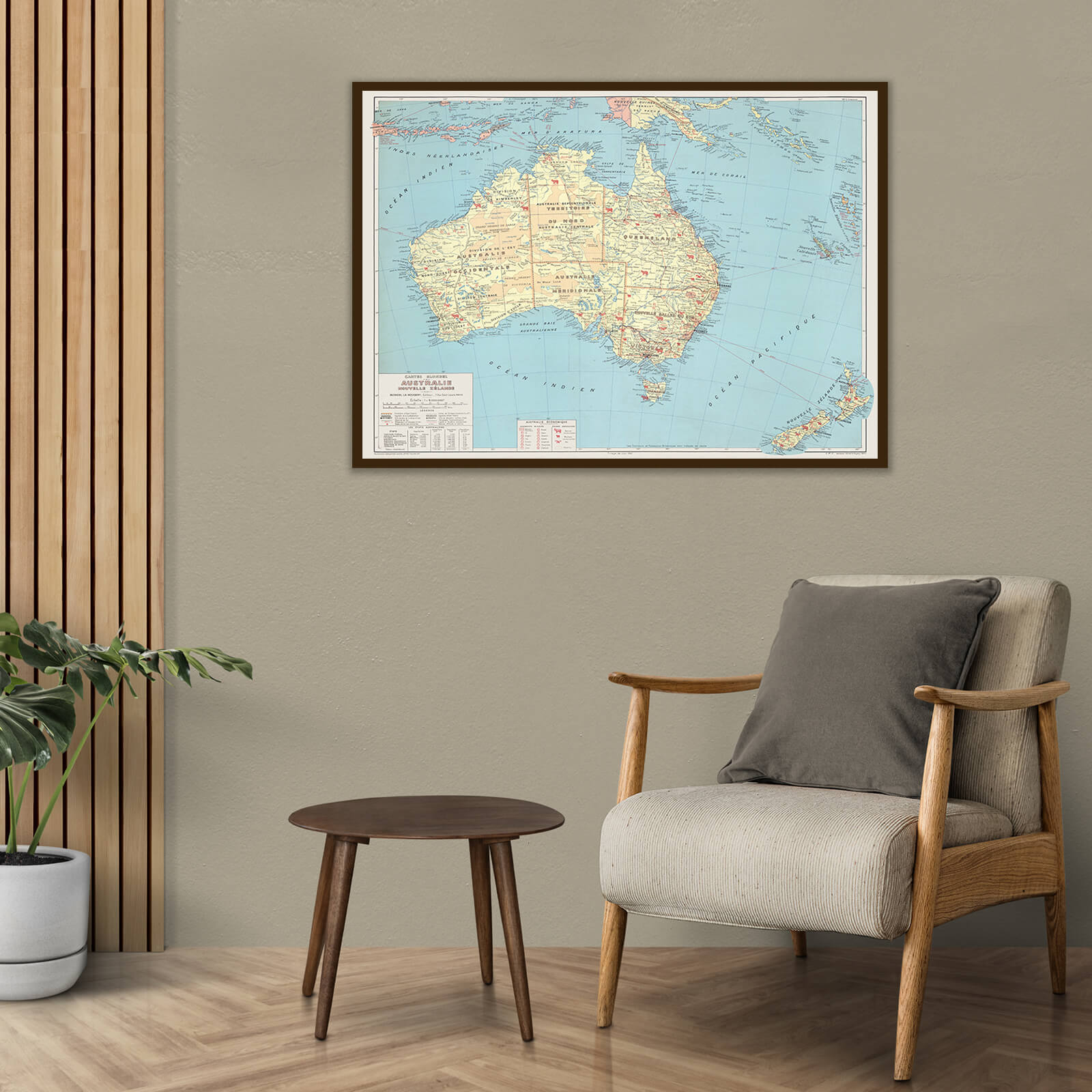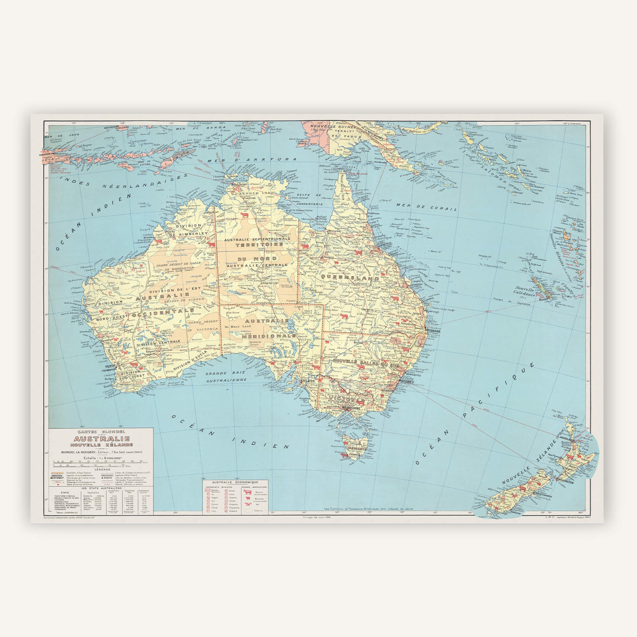 Illuminez vos murs avec cette carte géographique vintage de l'Australie, dont la Nouvelle Zélande se détache subtilement du reste.