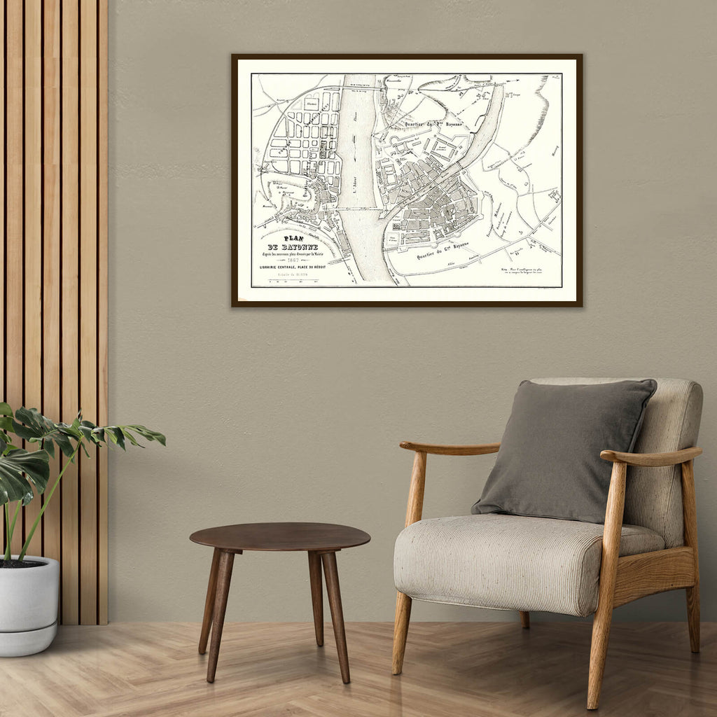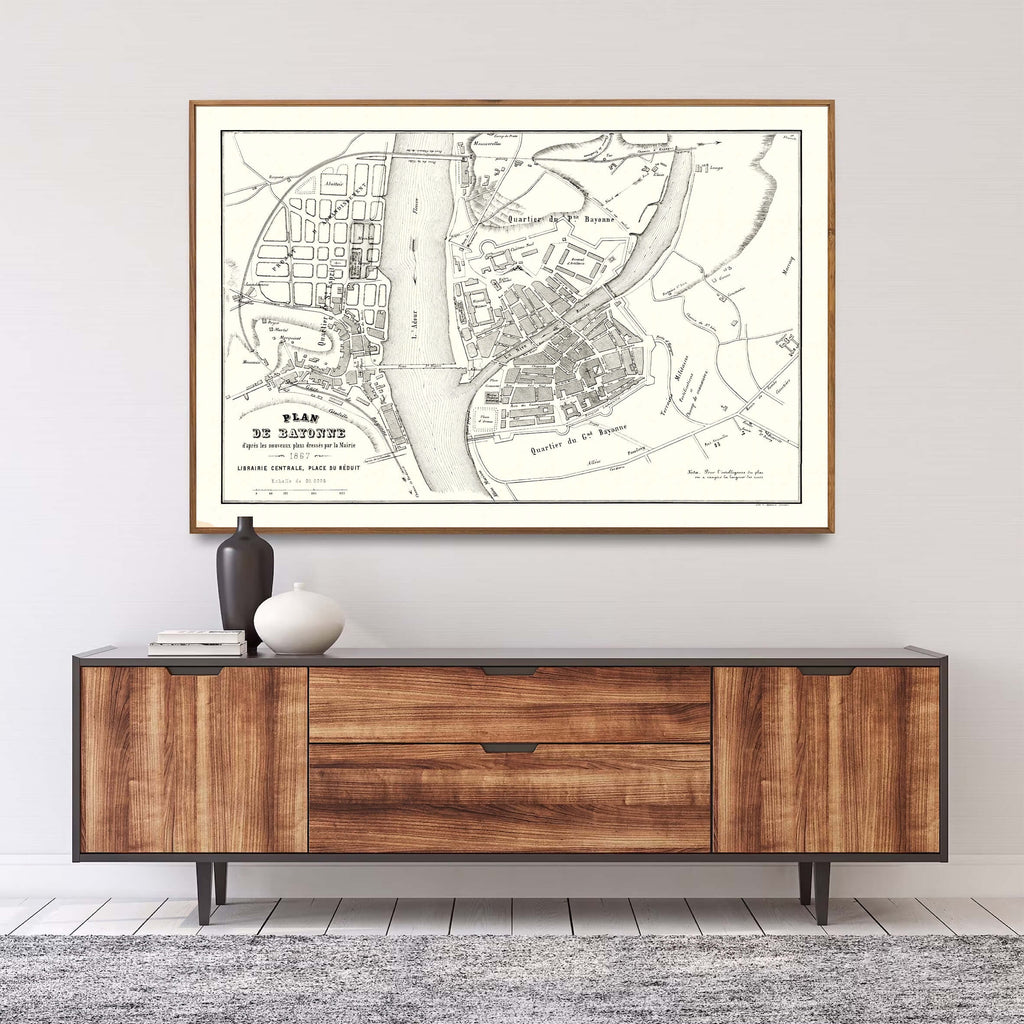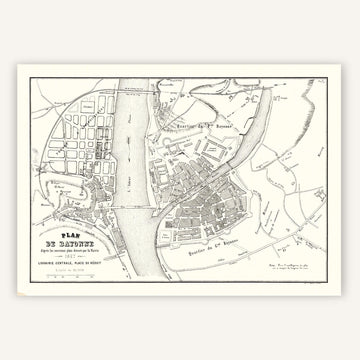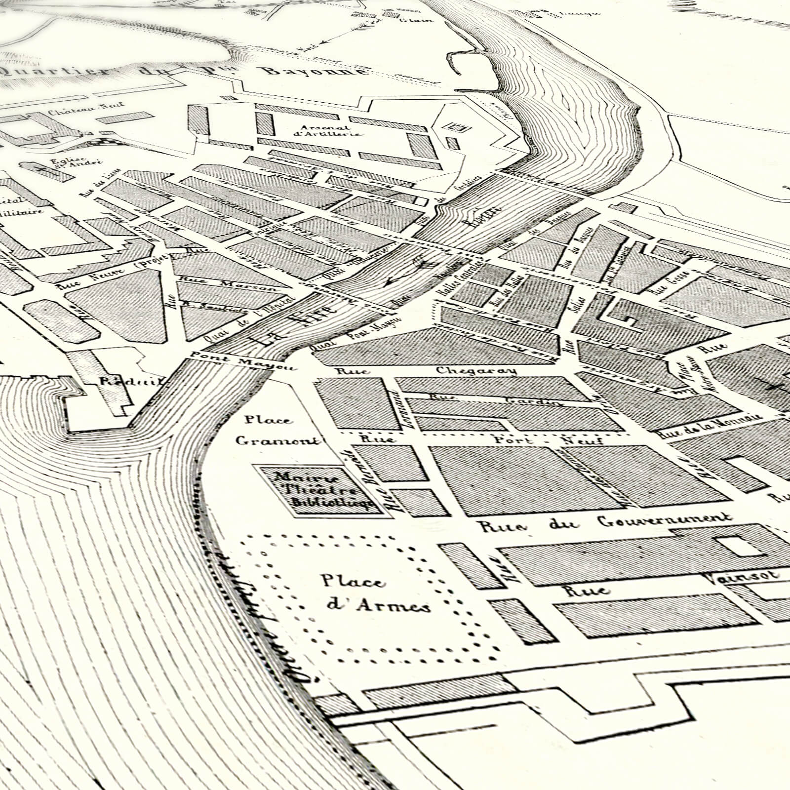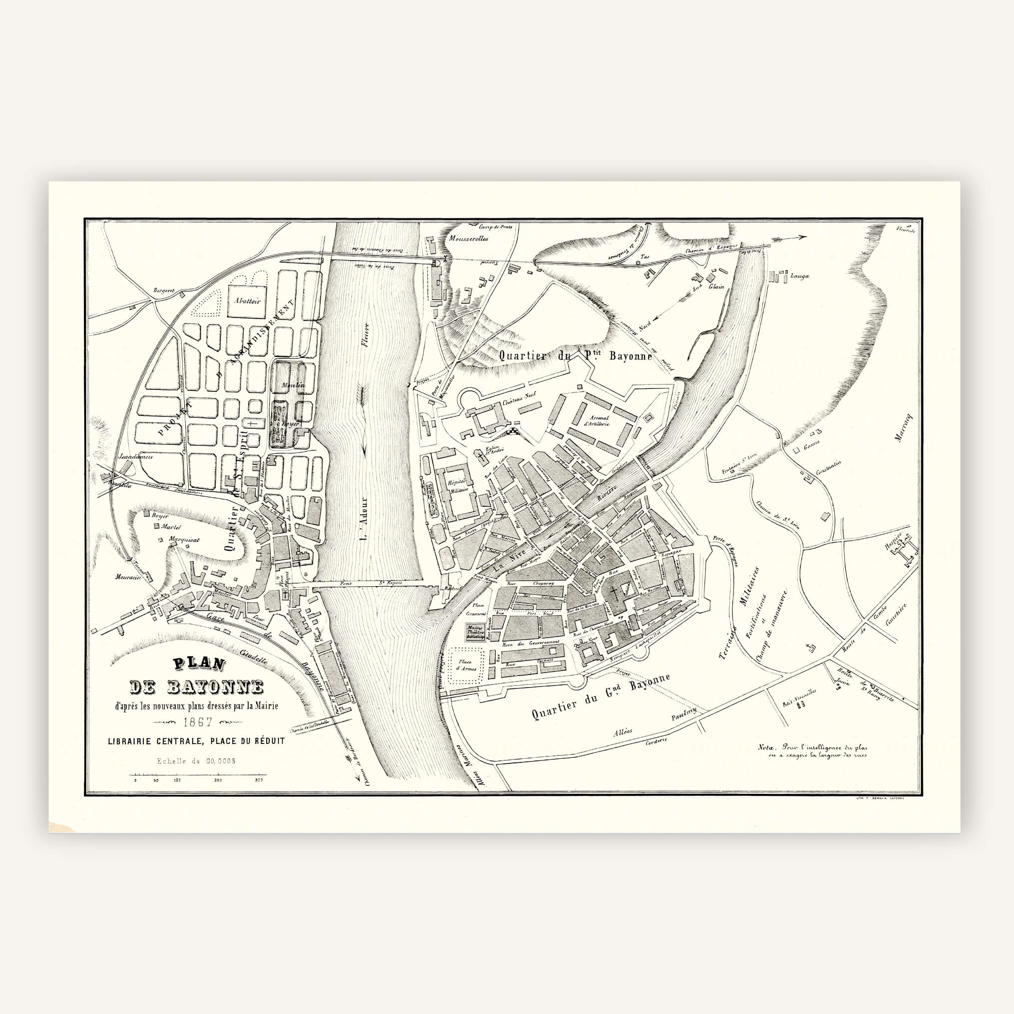 Ville de France située au confluent de la Nive et de l'Adour, cette carte géographique ancienne de Bayonne date de 1867 et conserve son aspect vieilli qui lui va si bien.