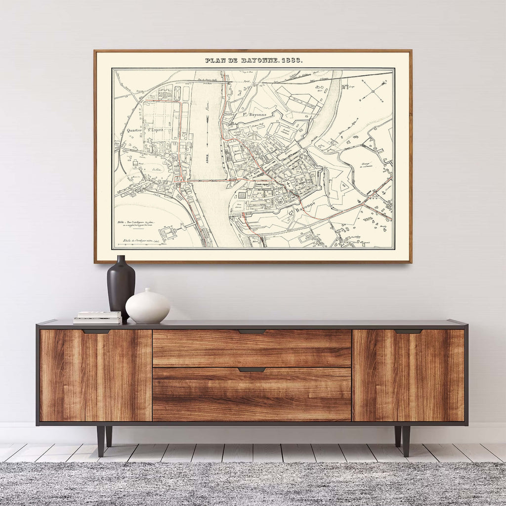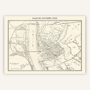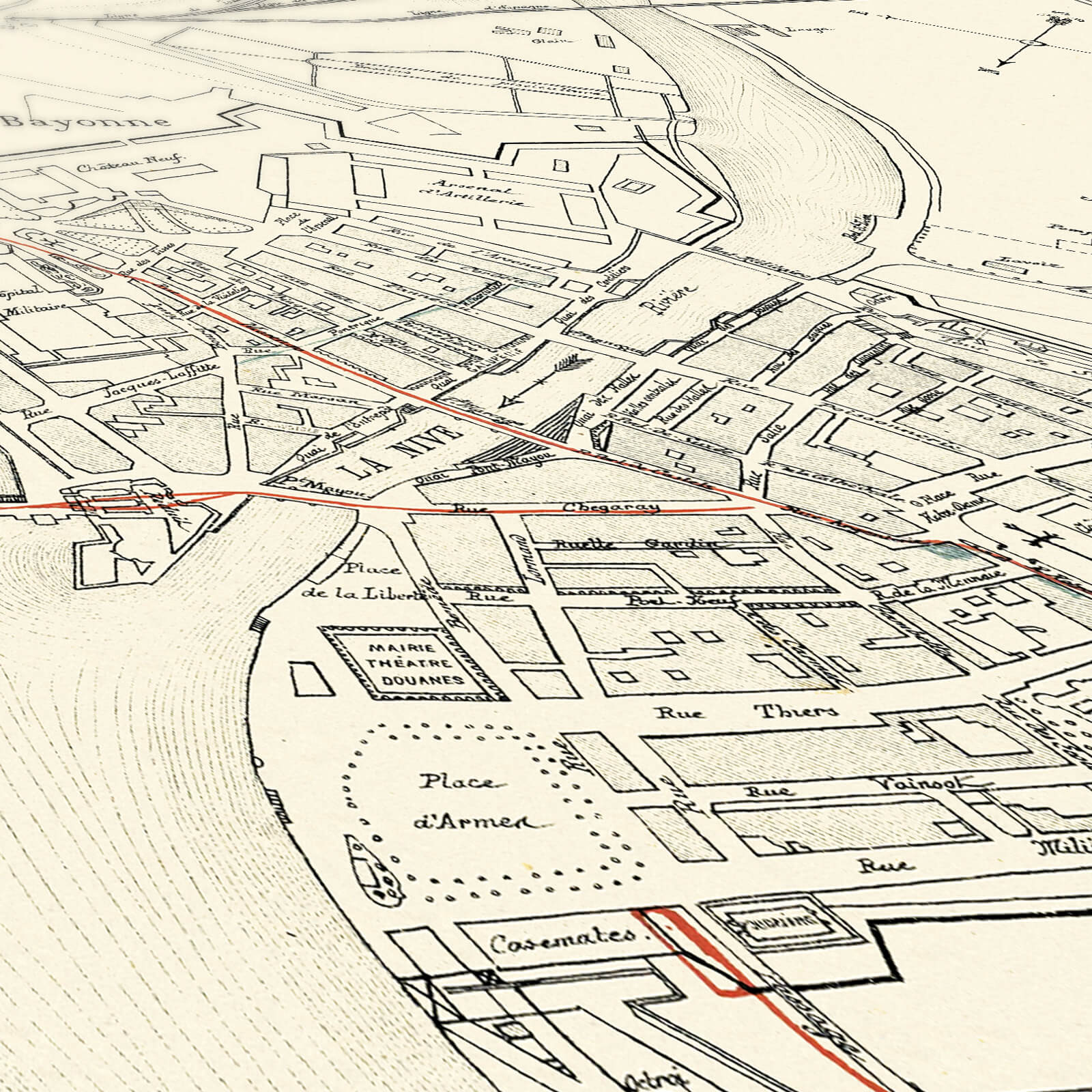 Les détails méticuleux de cette carte géographique au design vintage nous raconte l'histoire de la ville française de Bayonne.