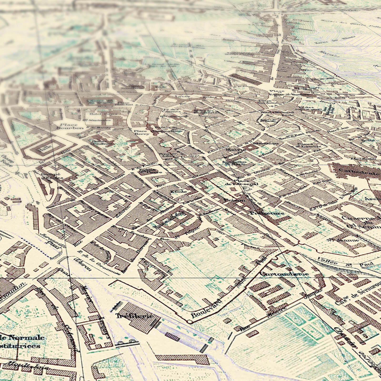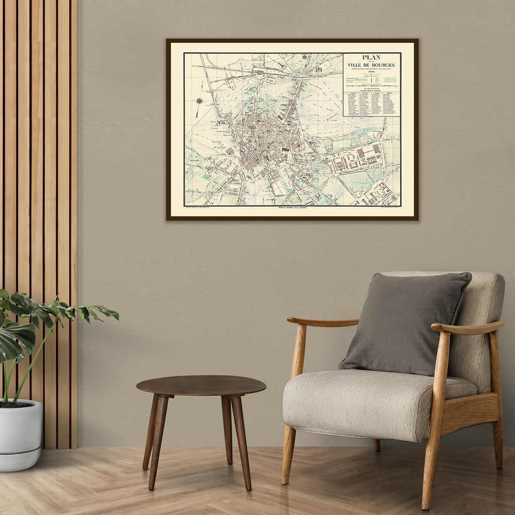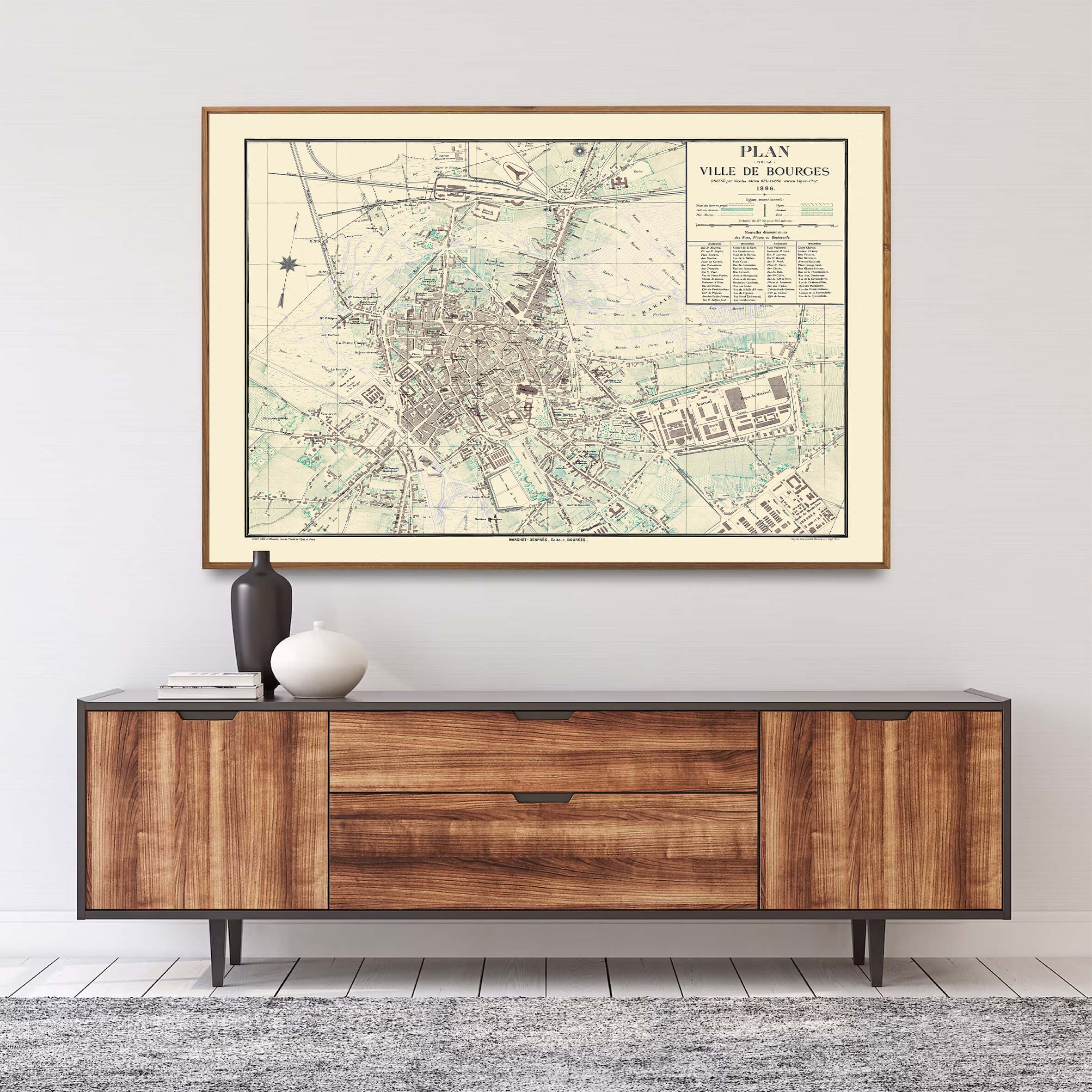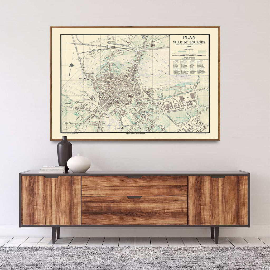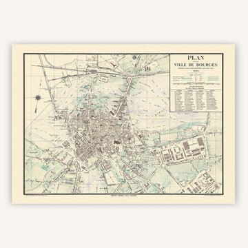 Découvrez ce joli plan de la ville de Bourges contrastant entre tons froids et tons chauds et orné de détails illustrés.
