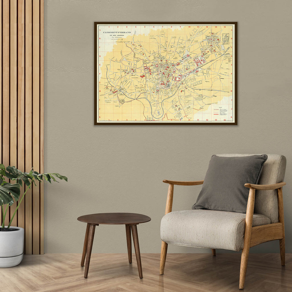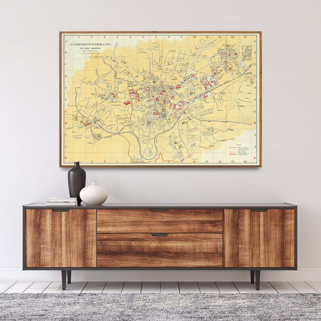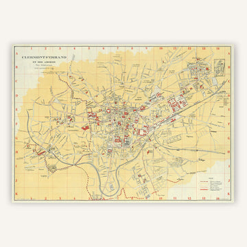 Cette carte géographique décorative est un plan schématique de la ville française de Clermont-Ferrand et de ses abords. Son design vintage est, à nos yeux, tout à fait harmonieux et haut en couleur !