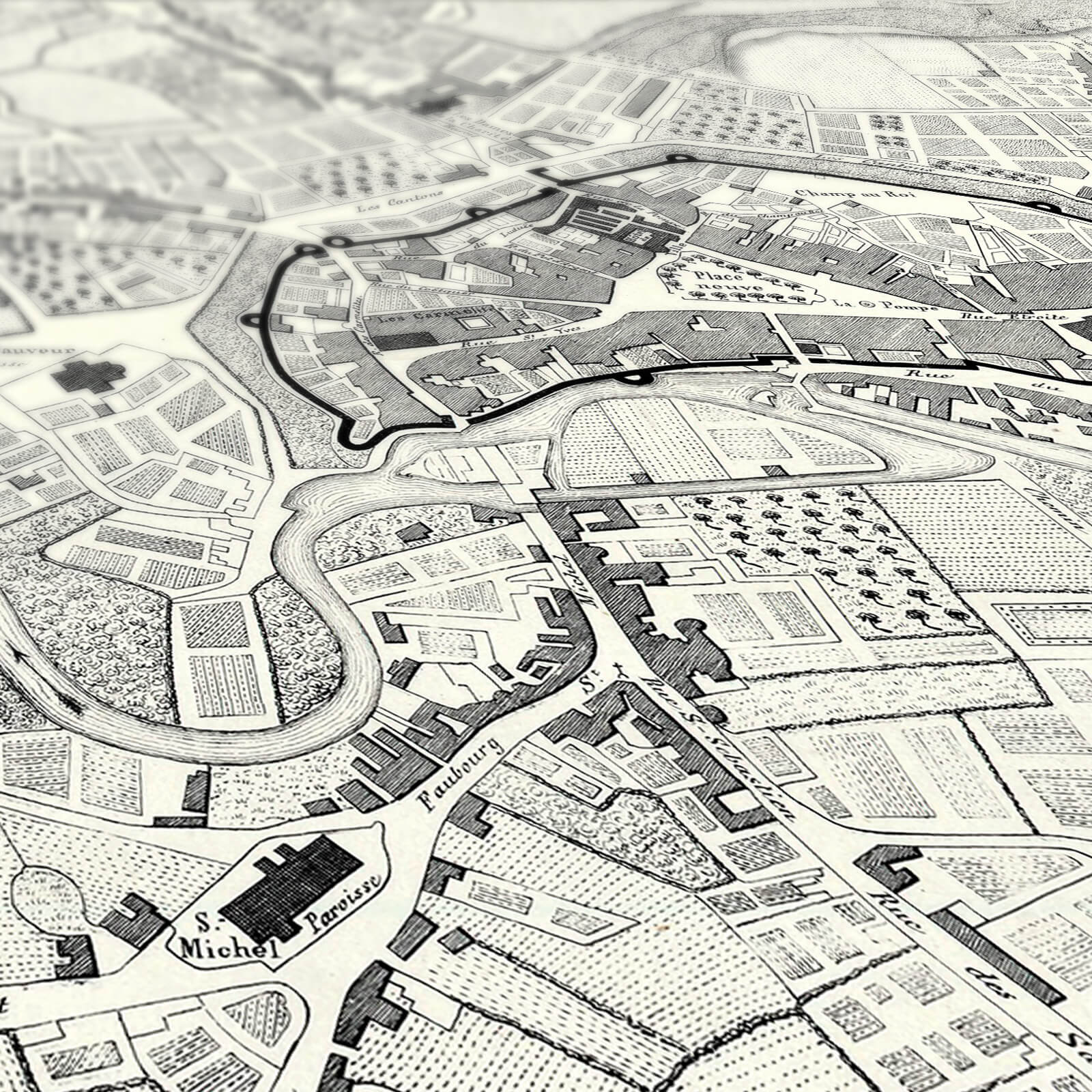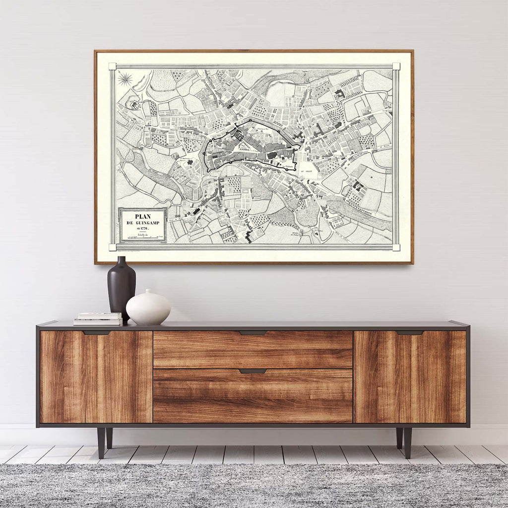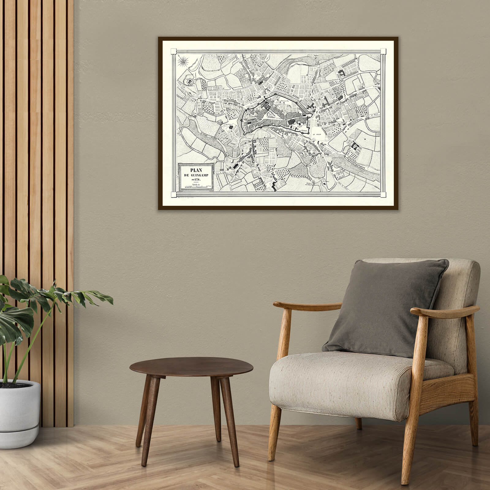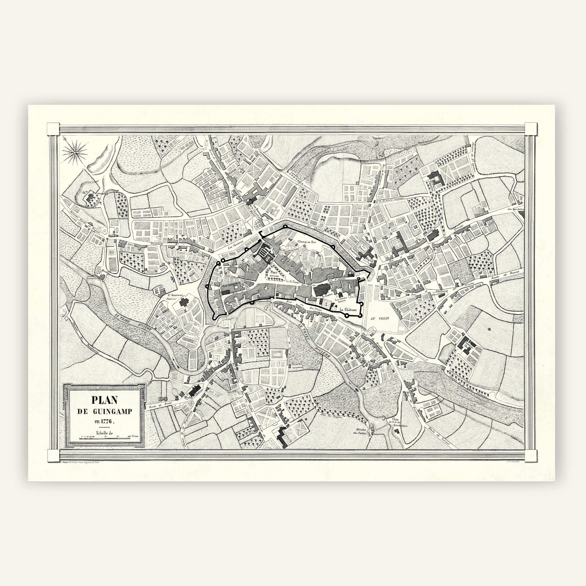 Cette ancienne carte géographique du plan de Guingamp, ville bretonne homologuée « Petite cité de caractère » nous surprend de par ses lignes très contrastées qui lui apportent une réelle qualité graphique.