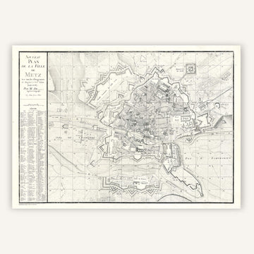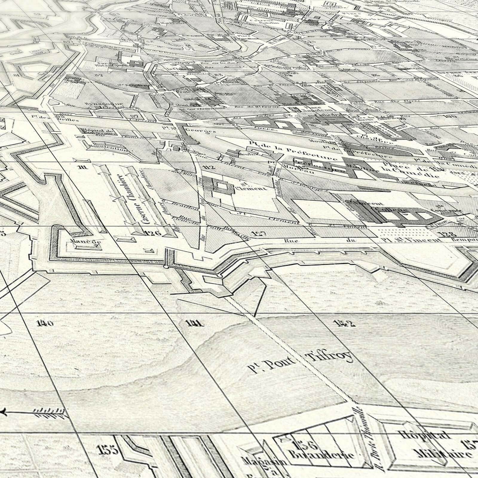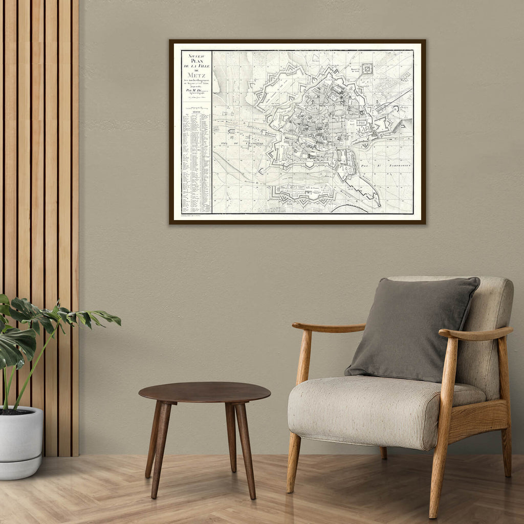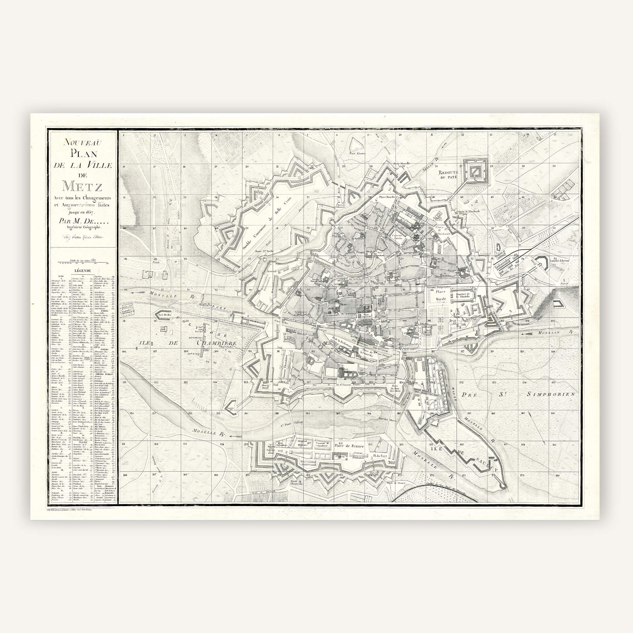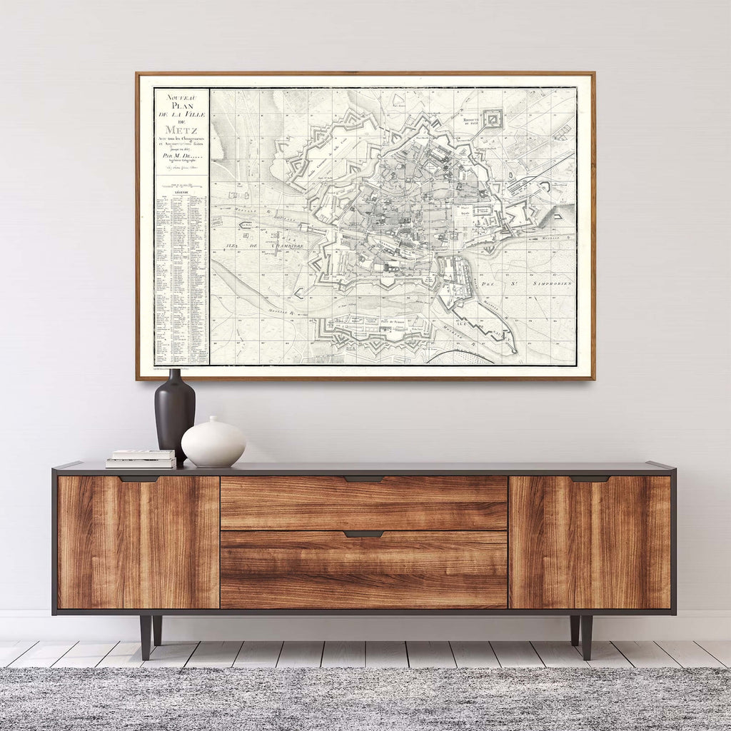 Décorez vos murs avec cette carte géographique décorative de la ville de Metz au graphisme typique des cartes des années 1800.