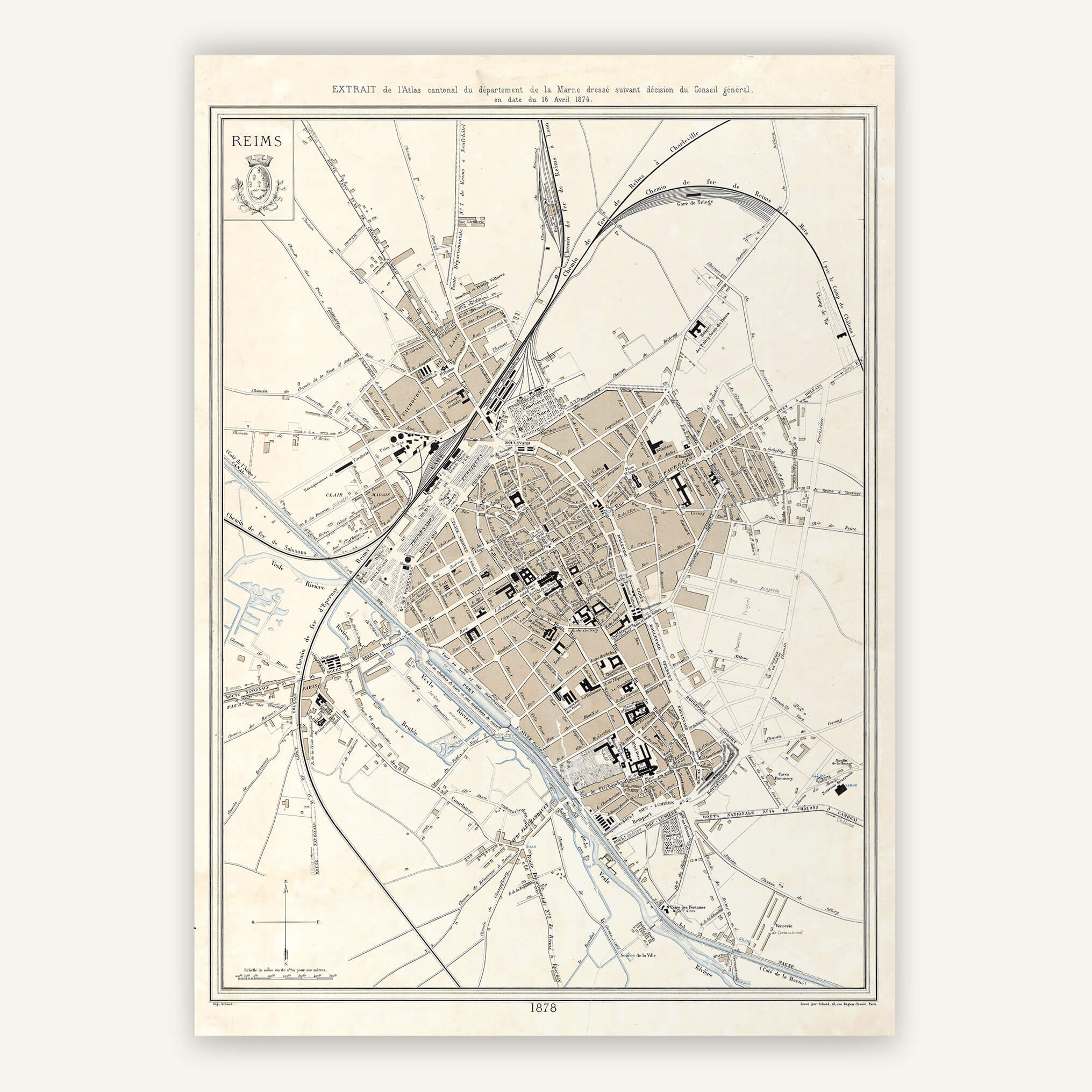 Direction la Cité des Rois sur cette ancienne carte géographique de Reims dont l'original date de 1878 ! (Re)découvrez cette Ville d'Art et d'Histoire à travers cette cartographie, dans cette version modernisée.
