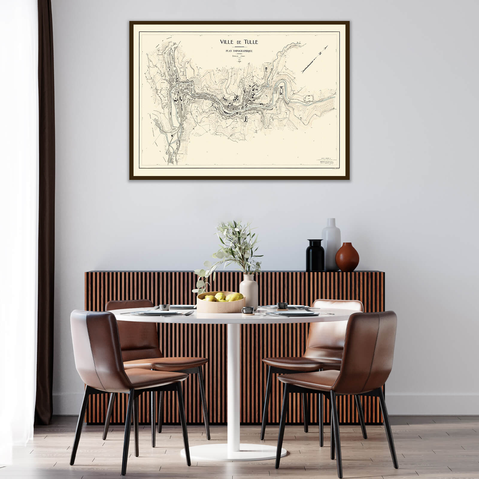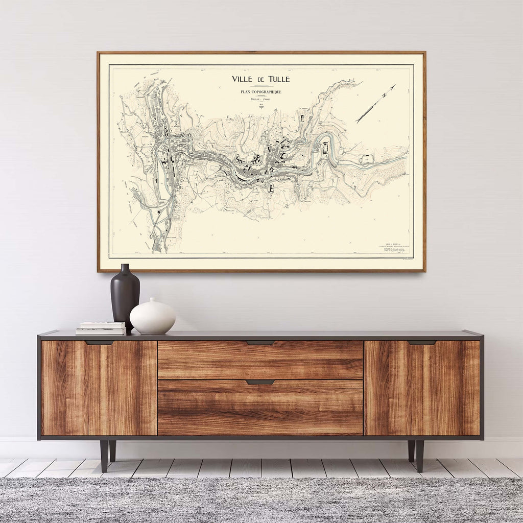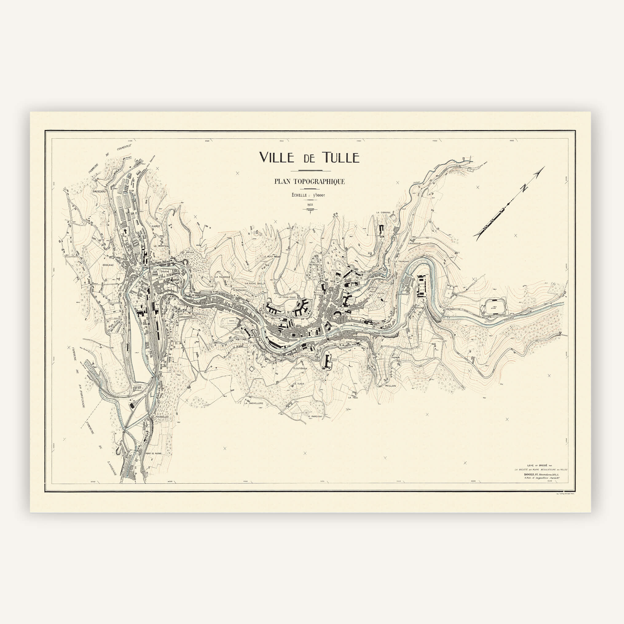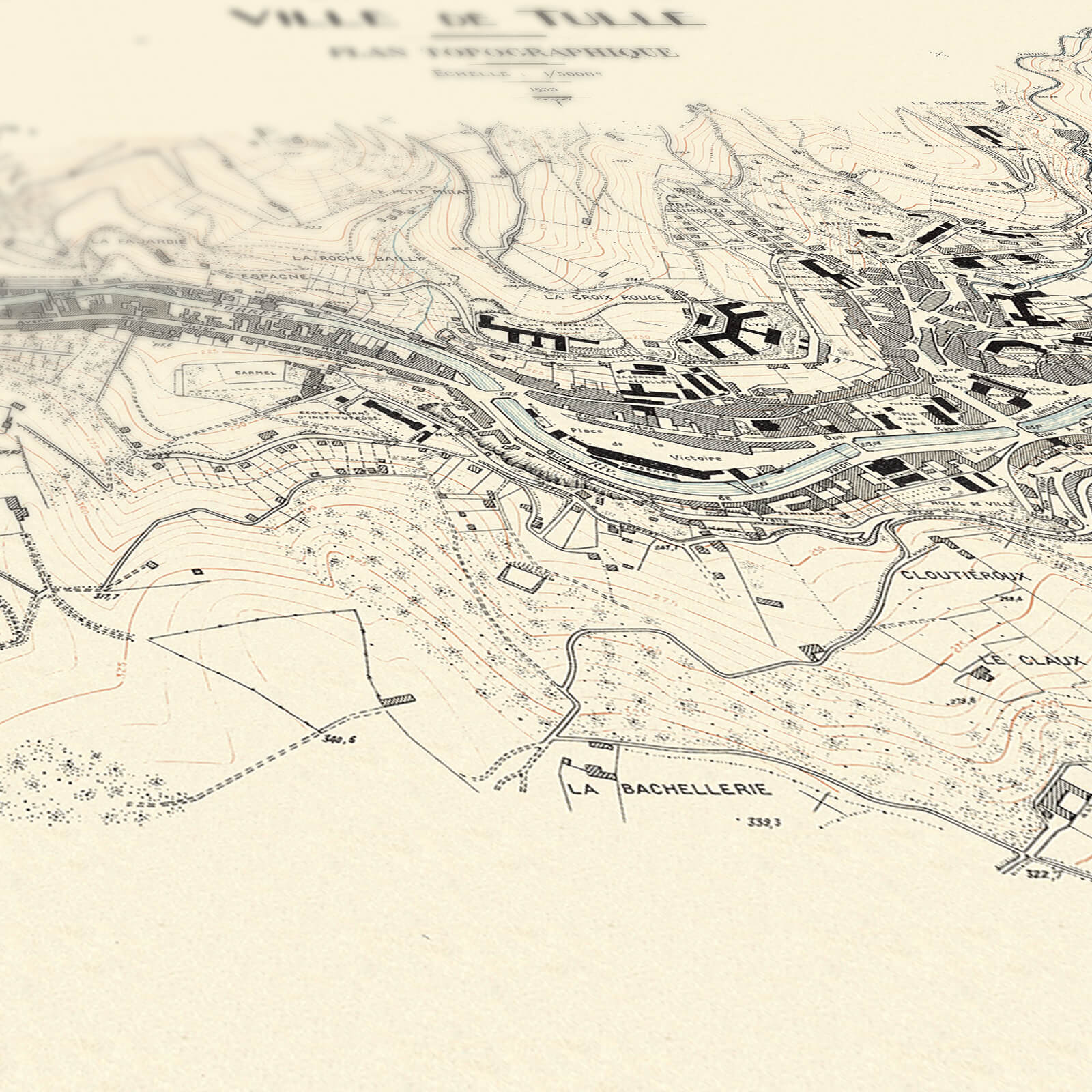 Ce plan topographique de la ville de Tulle à l'aspect vieilli est ornée de détails qui laissent tout de même place à la sobriété.