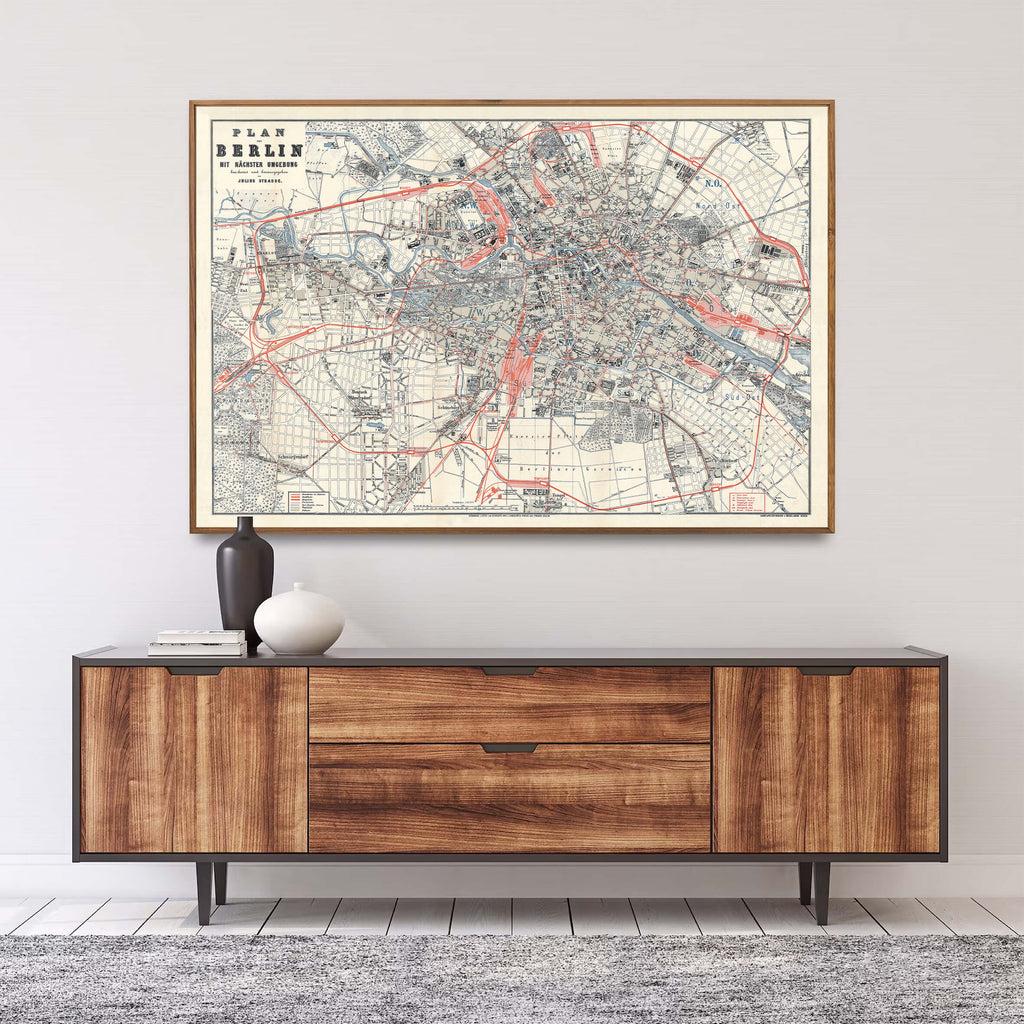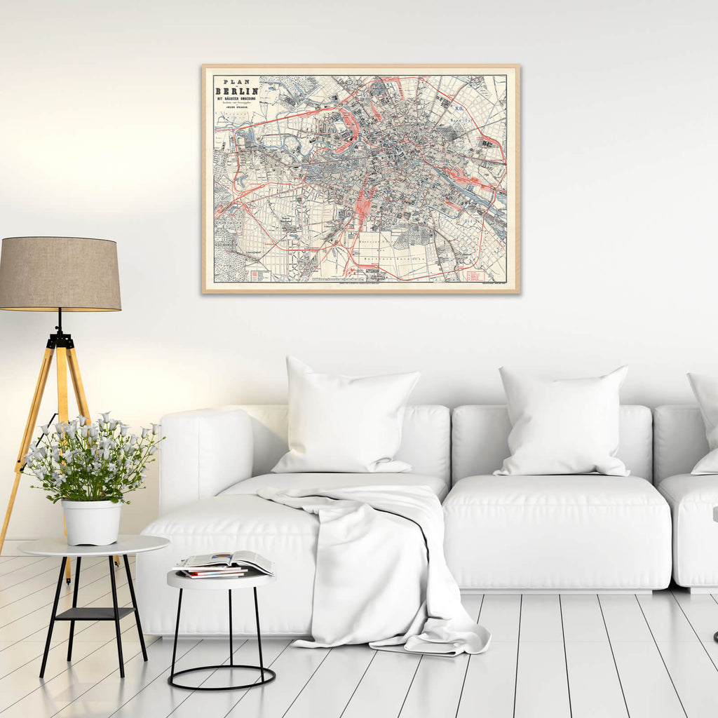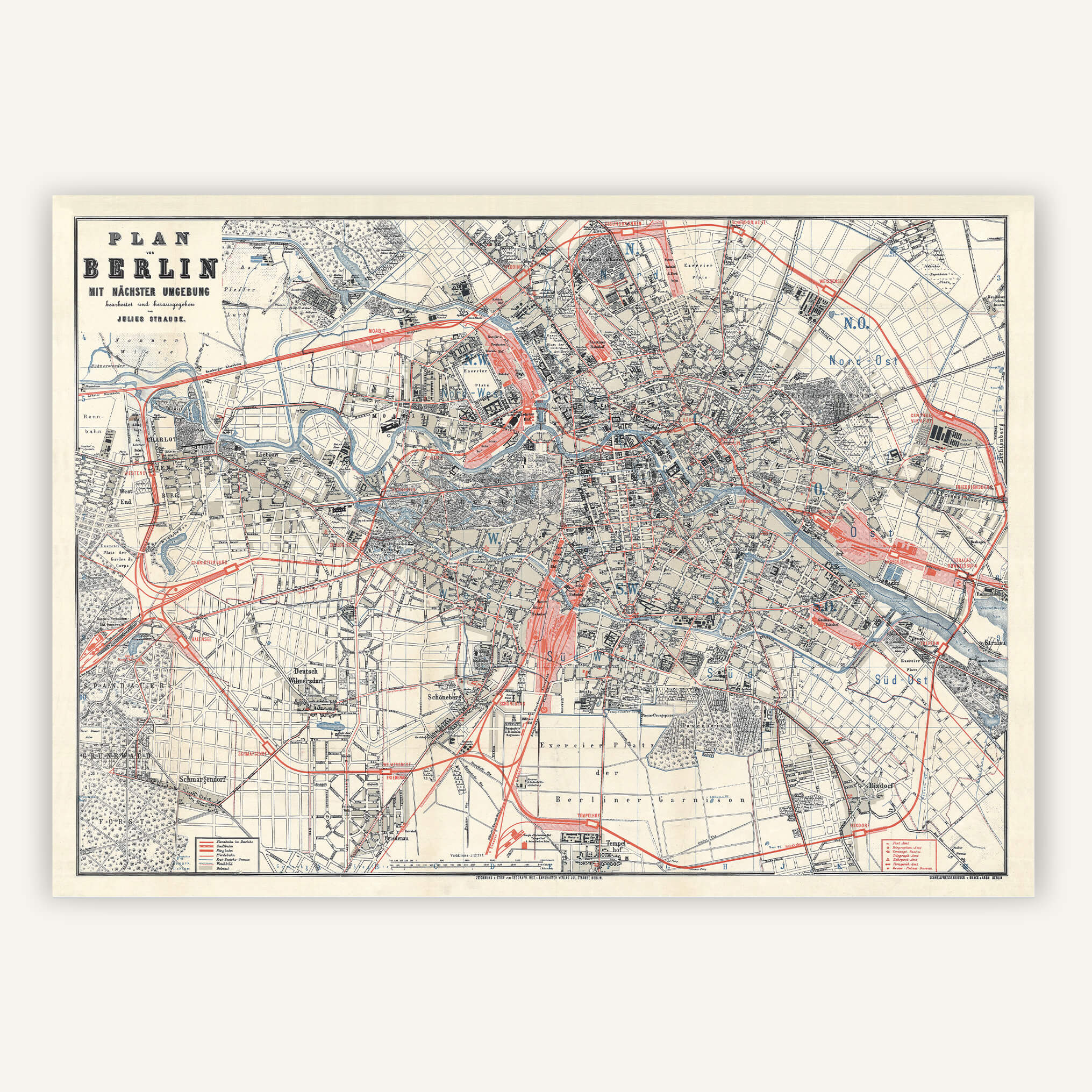 Cette carte vintage de Berlin nous livre en un coup d'oeil l'étendue de la ville et ses zones de concentration en 1890. Elle nous offre un côté très graphique de la ville, notamment à travers ses principales gares colorées en rouge.