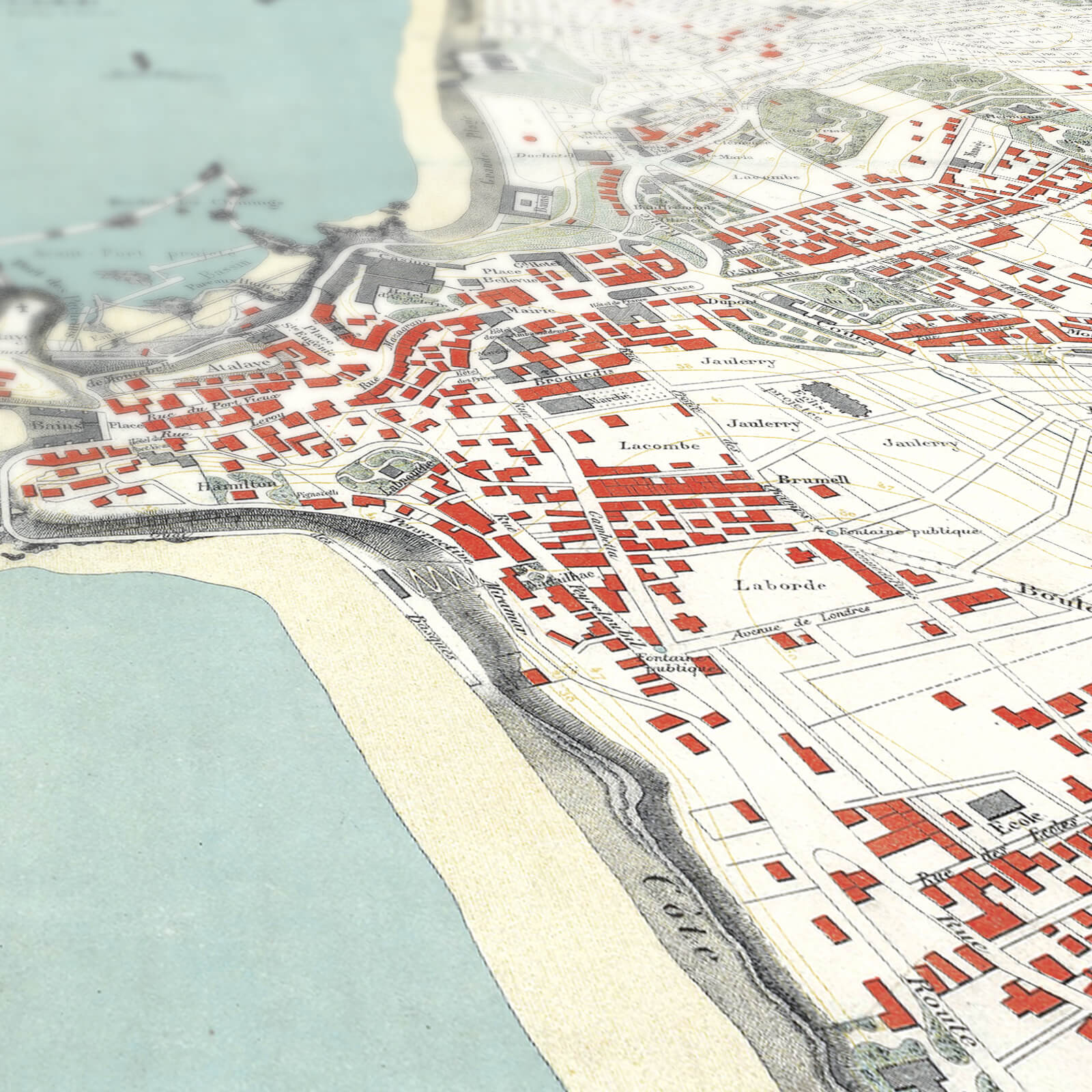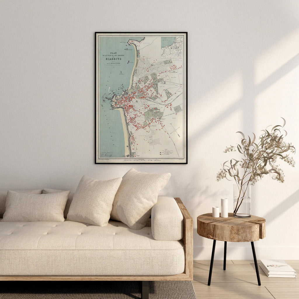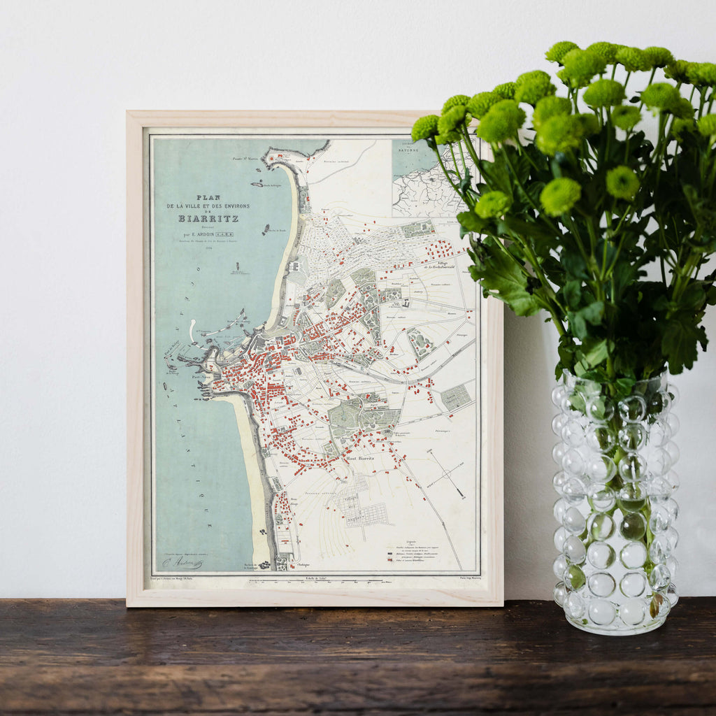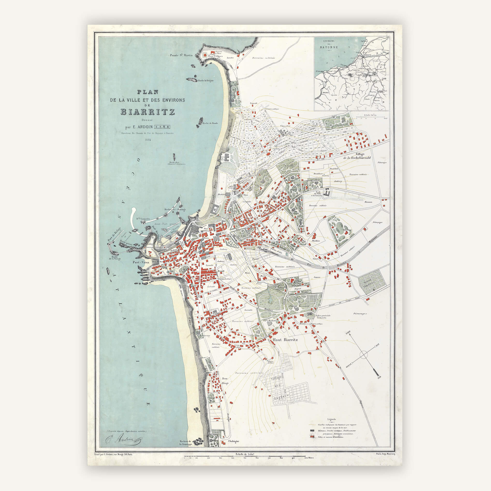 Cette carte vintage de Biarritz est une réédition d'une carte géographique de 1884. Elle est imprimée sur du papier de création recyclé et certifié FSC