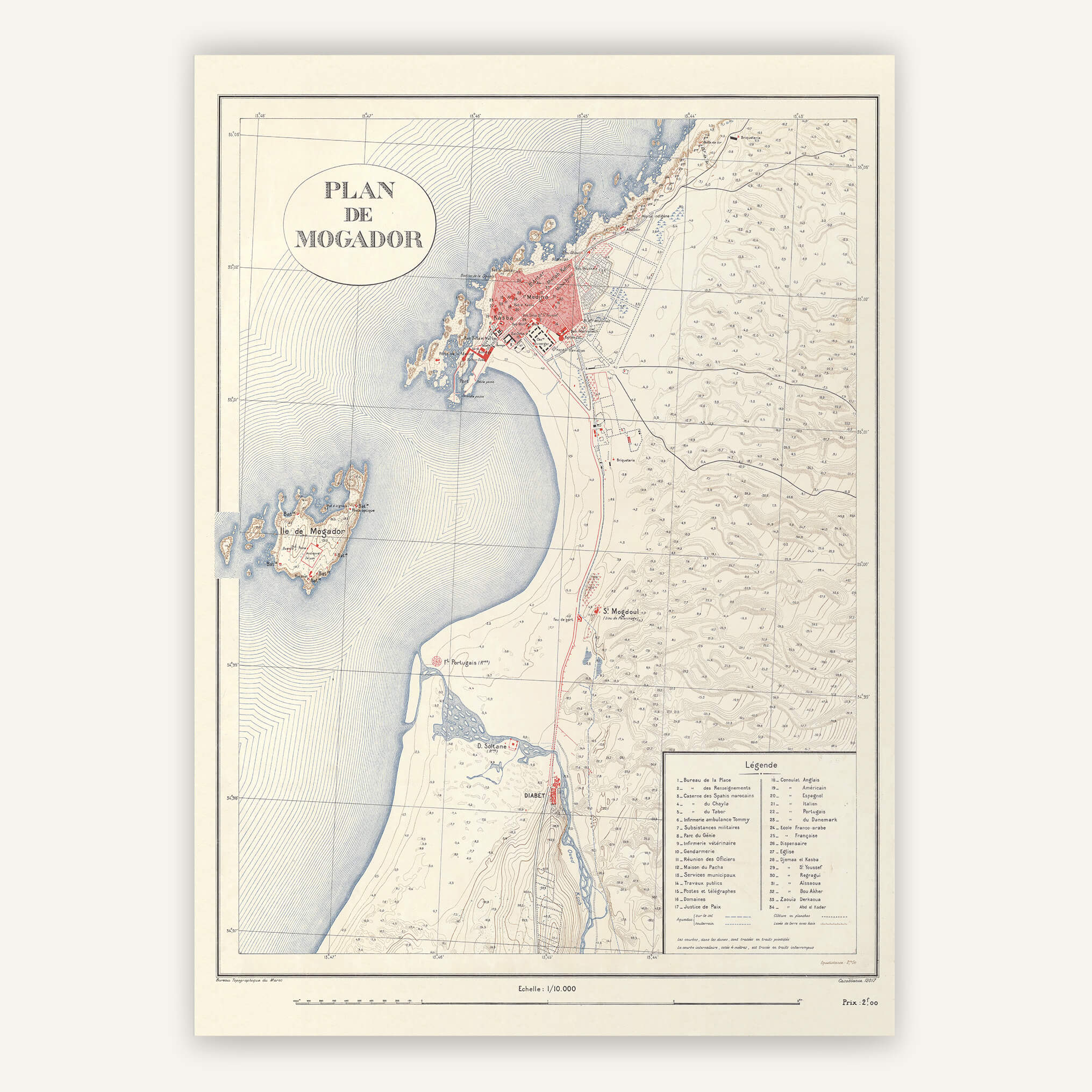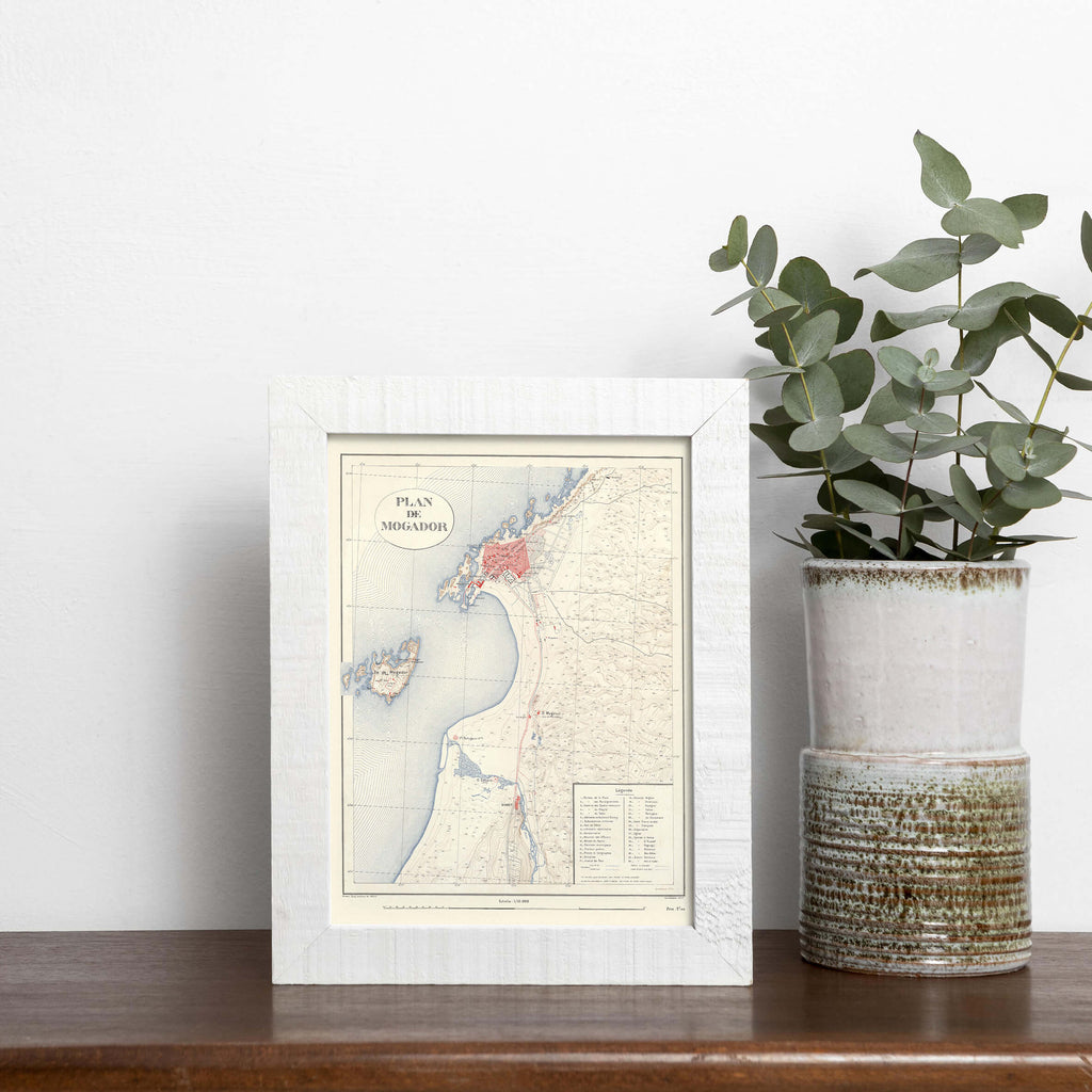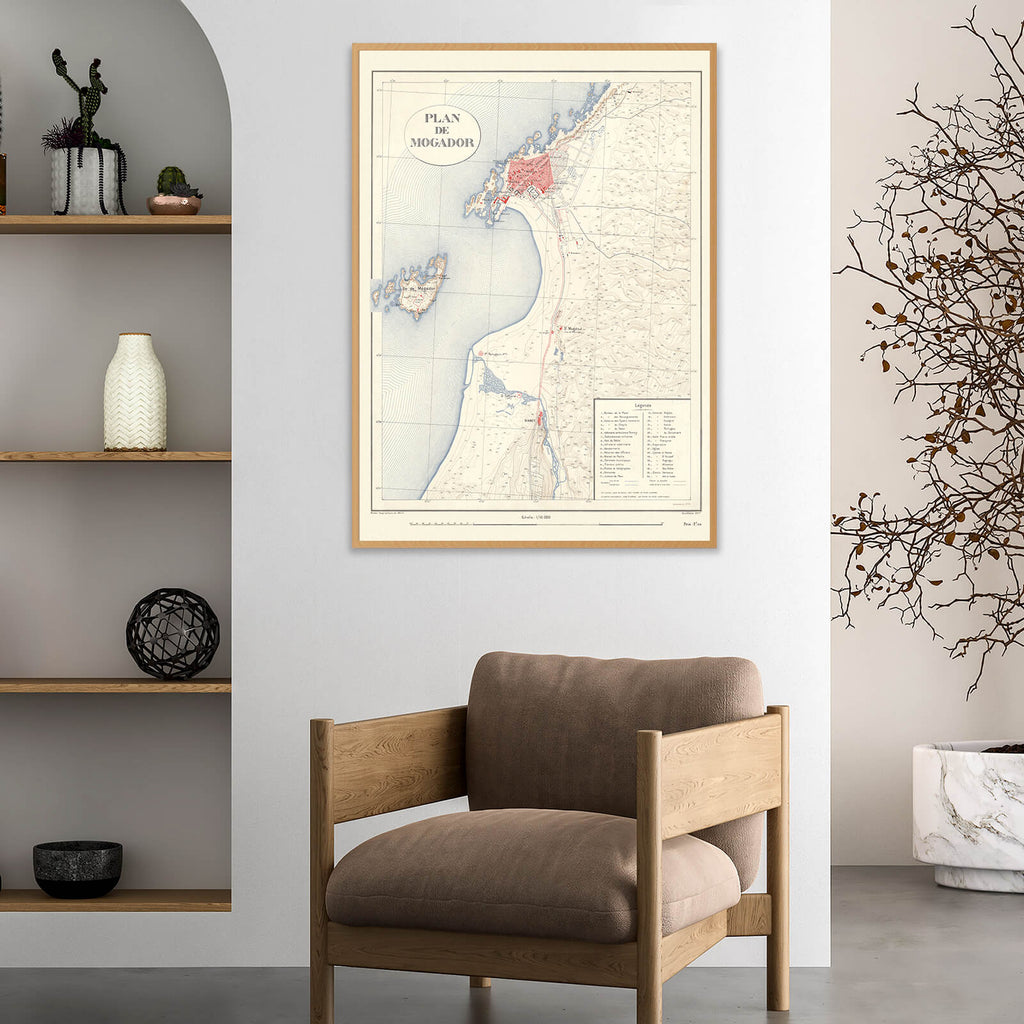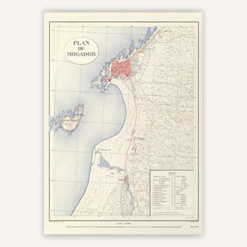 Anciennement appelée Mogador par les Portugais, cette ville portuaire se dévoile sur cette affiche murale, dans un style épuré, avec tous les détails de la topographie et de l'altimétrie des terres. La légende en bas à droit indique les bâtiments principaux.