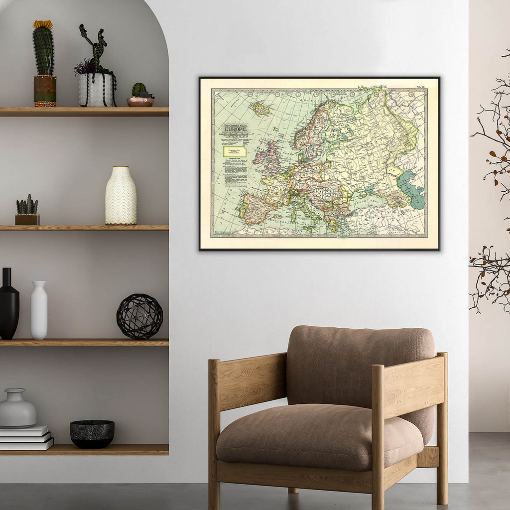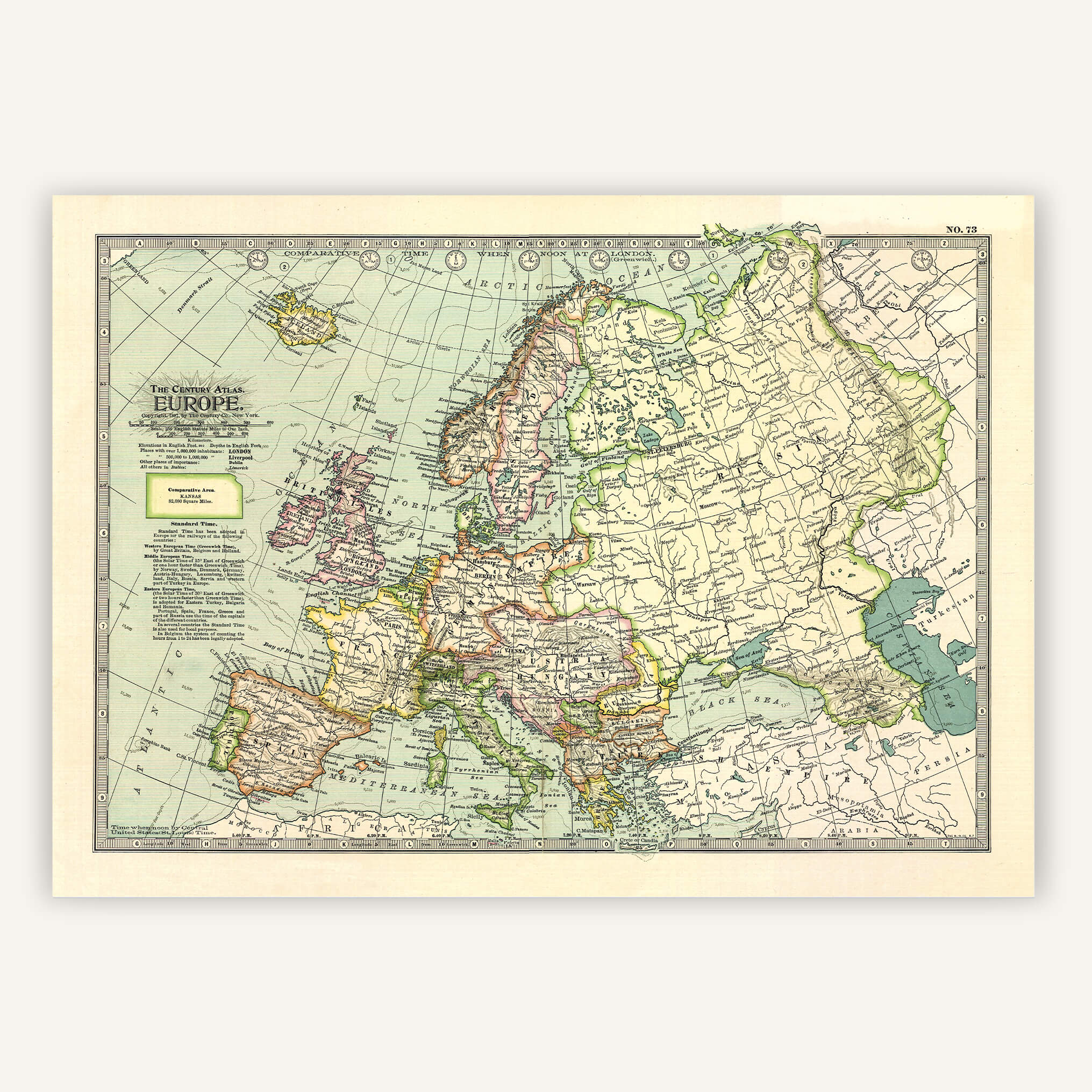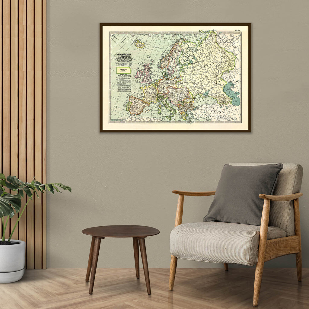 Cette carte vintage de l'Europe est une réédition d'une carte géographique de 1897. Les frontières de chaque pays de l'Europe, au sens géographique, sont soulignées en couleurs.