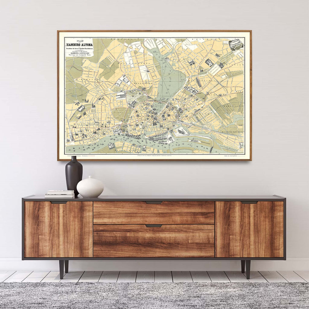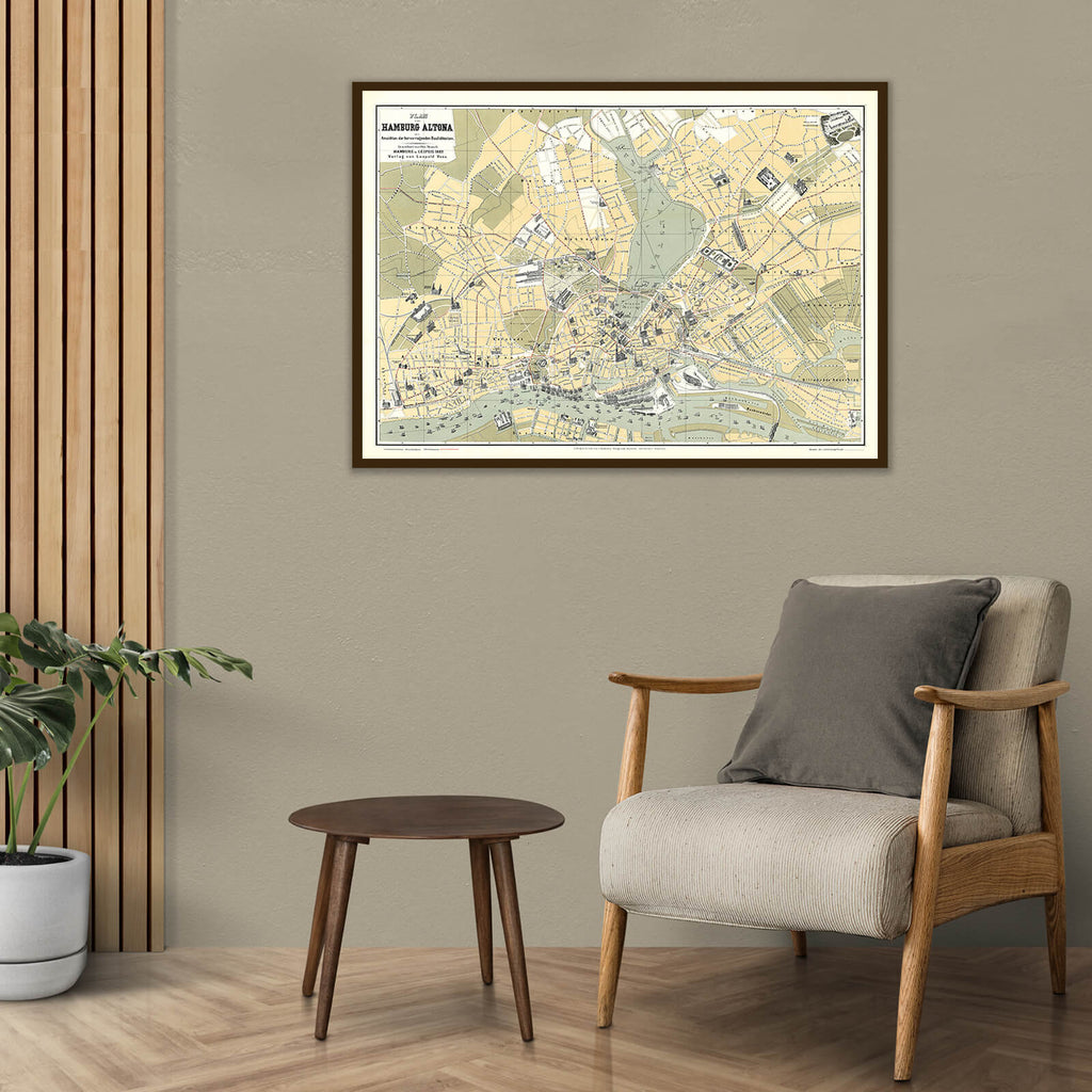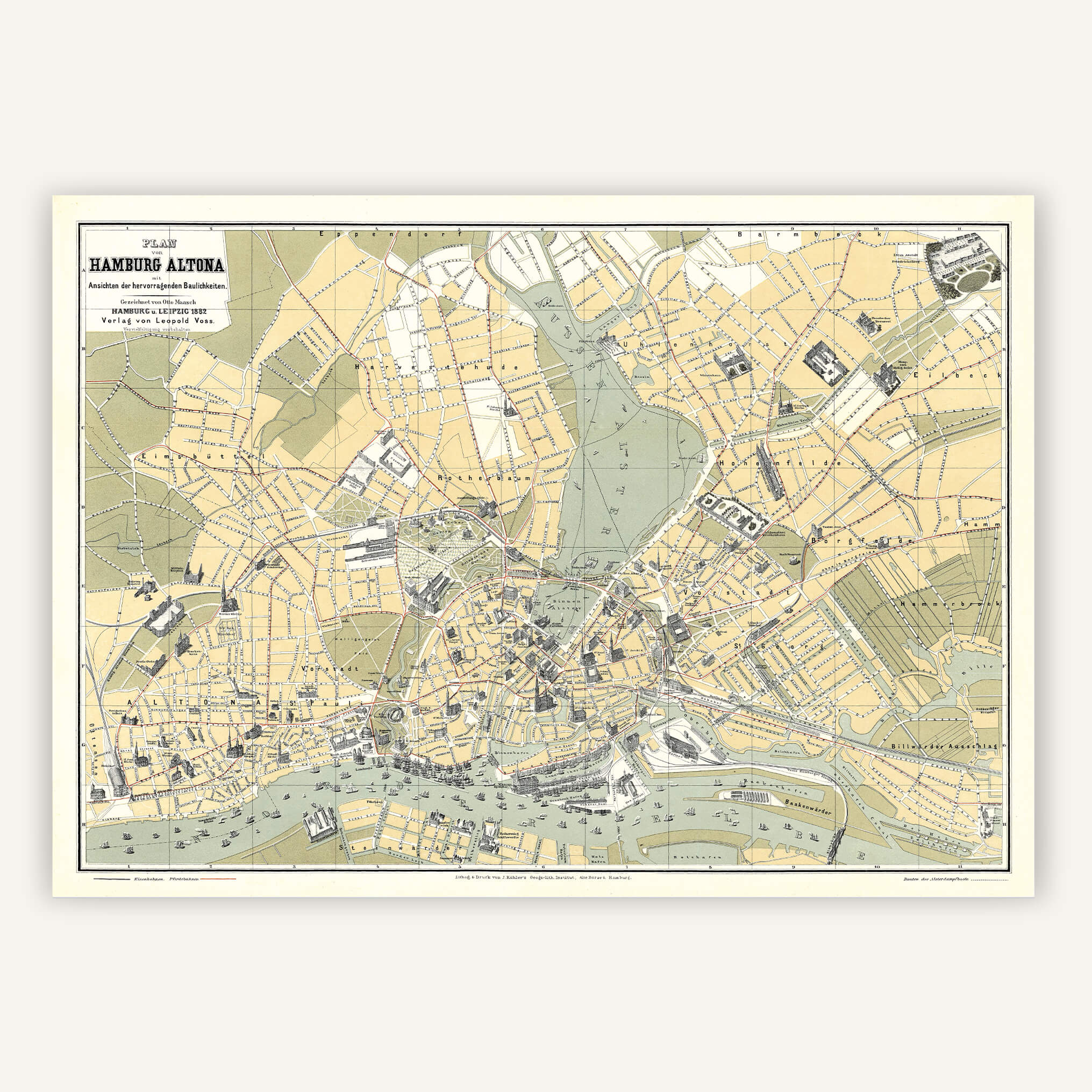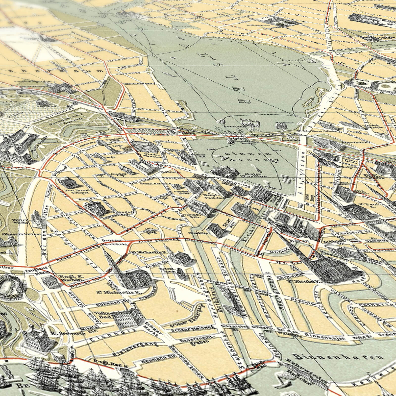 Retrouvez la ville d'Hambourg sur cette ancienne carte géographique rééditée sur papier de création. Cette grande ville portuaire d'Allemagne recèle de richesses architecturales et culturelles ! Affichez-la chez vous pour en conserver un souvenir graphique et esthétique dans votre décoration.