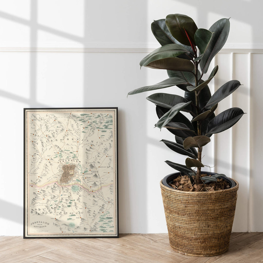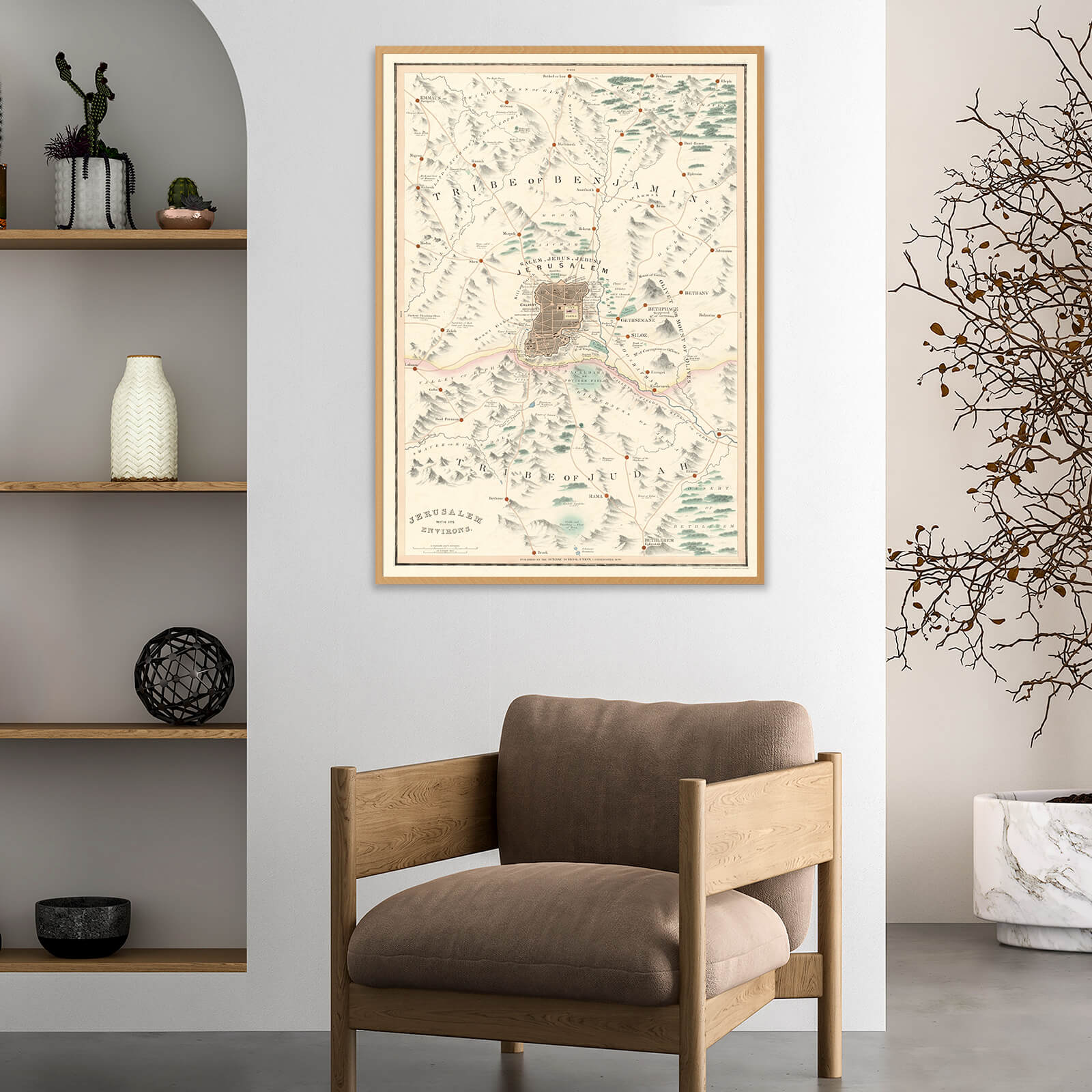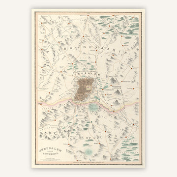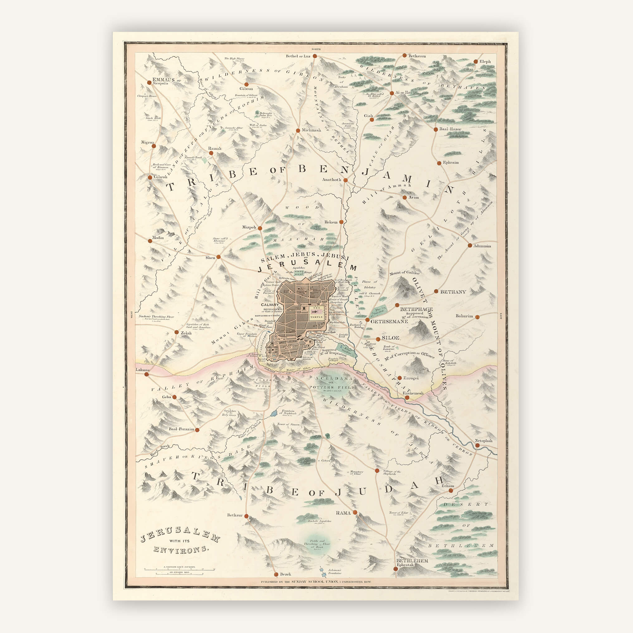 Jérusalem en 1830, entourée de ses monts et de ses vallées, dans cette réédition d'une carte géographique de la ville et de ses environs.