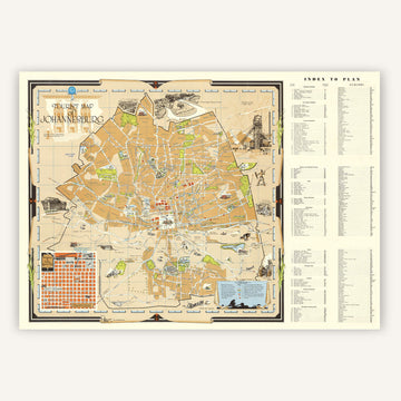 Visite guidée du Johannesbourg de 1948 ? Sur cette réédition d'une carte touristique de 1948, Johannesbourg prend forme à travers des illustrations de ses lieux de renom, de ses parcs et terrains de sports, de son réseau de tramway et de bus. Cette affiche vintage fourmille de détails, elle donne envie de se perdre dans les rues de Johannesbourg et de traverser son histoire.