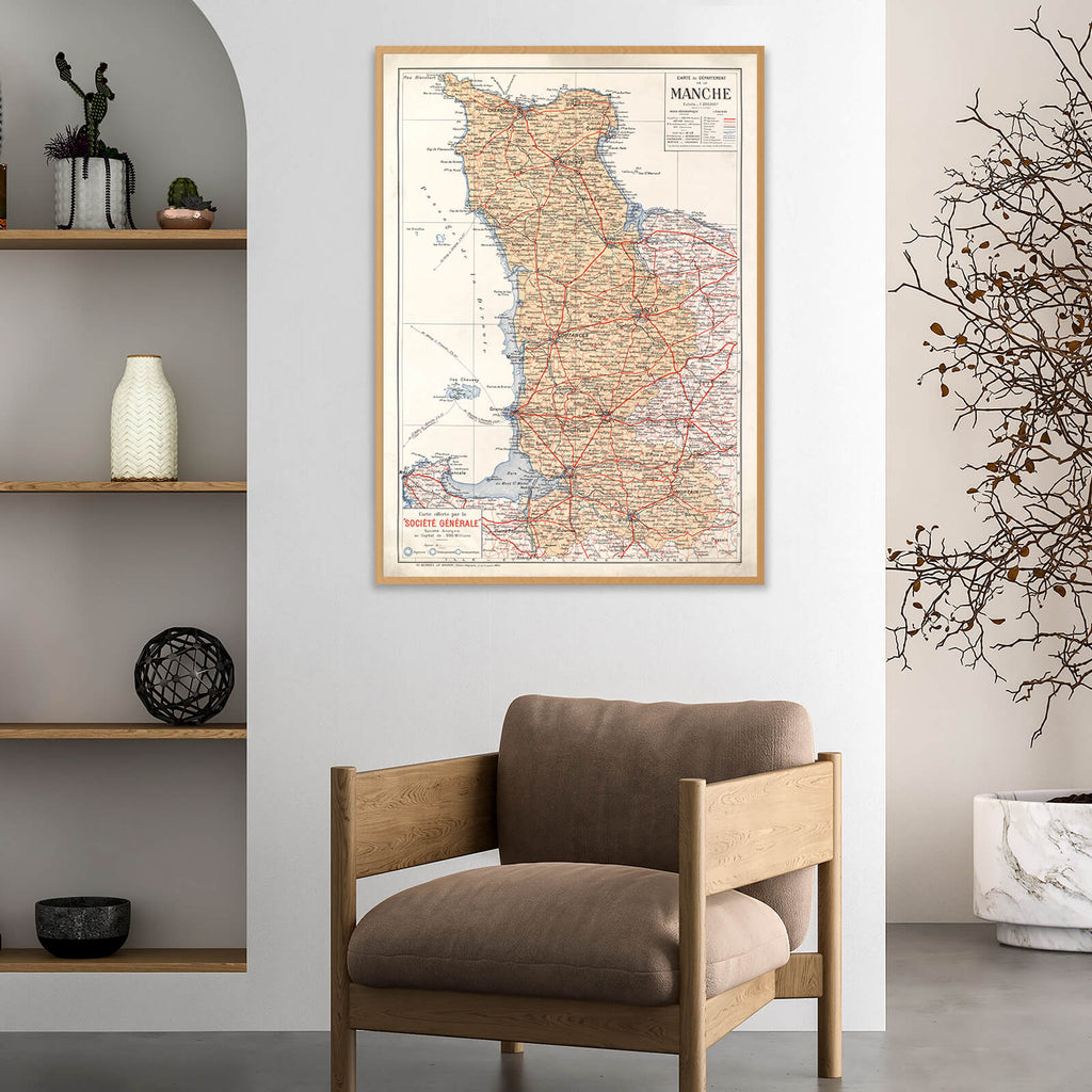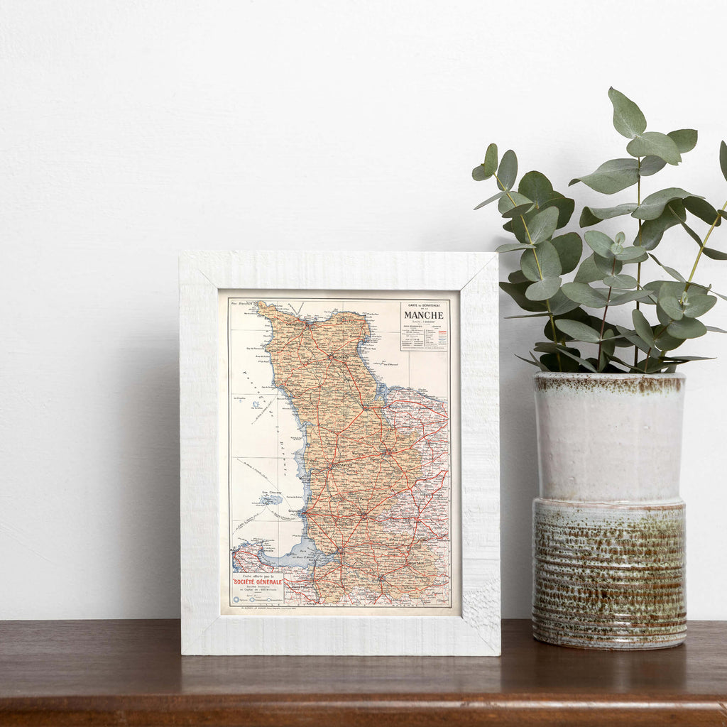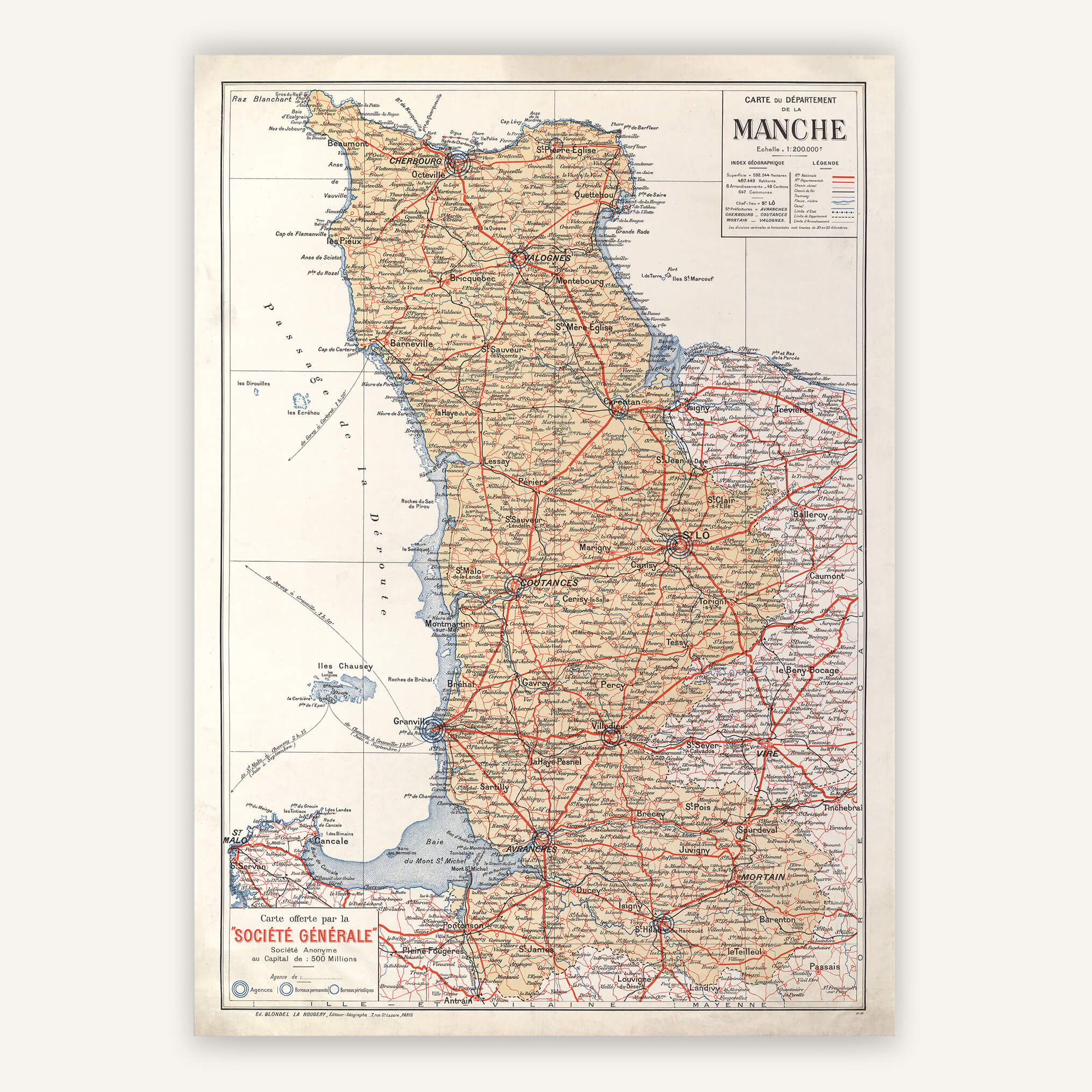Venez admirer cette carte géographique ancienne de La Manche, département français de la région de Normandie. Ses tons rosés lui donne un graphisme vintage avec une touche d'originalité, ses couleurs douces sauront parfaitement décorer votre intérieur.