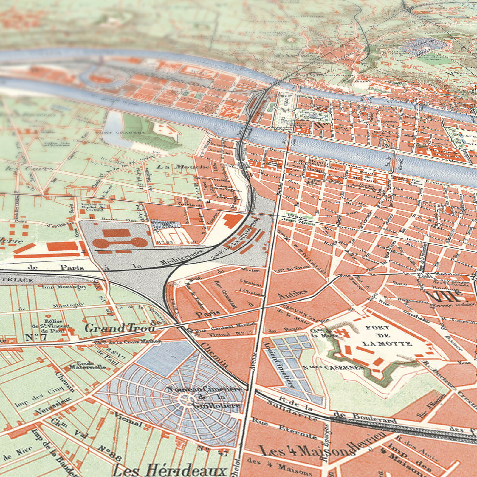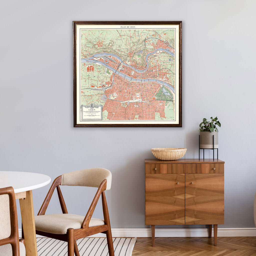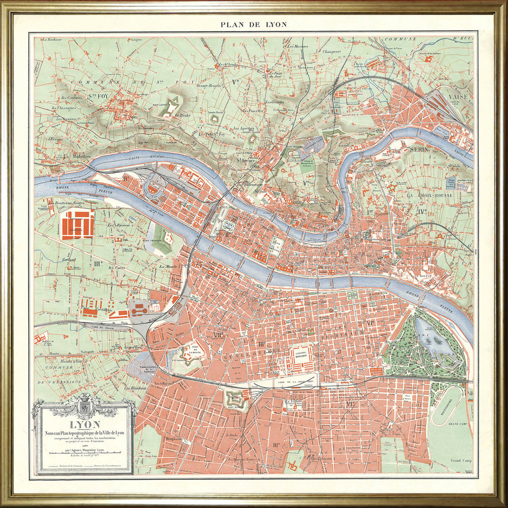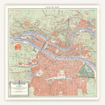 Lyon prend vie sur cette carte géographique ancienne de 1922 ! Dans des tons pastel, la ville de Lyon se dessine sur cette affiche géographique, traversée par le Rhône qui lui insuffle du mouvement.