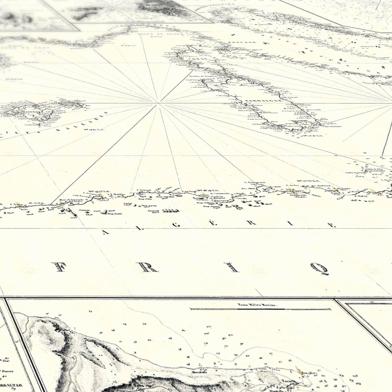 Cette affiche vintage détaillée porte son attention sur le Détroit de Gibraltar et de Messine, les îles de Malte et Gozo, le Port de Tripoli, les îles Colombrètes sur les Côtes d'Espagne, le plan de Marseille et le Détroit des Bouches de Bonifacio.