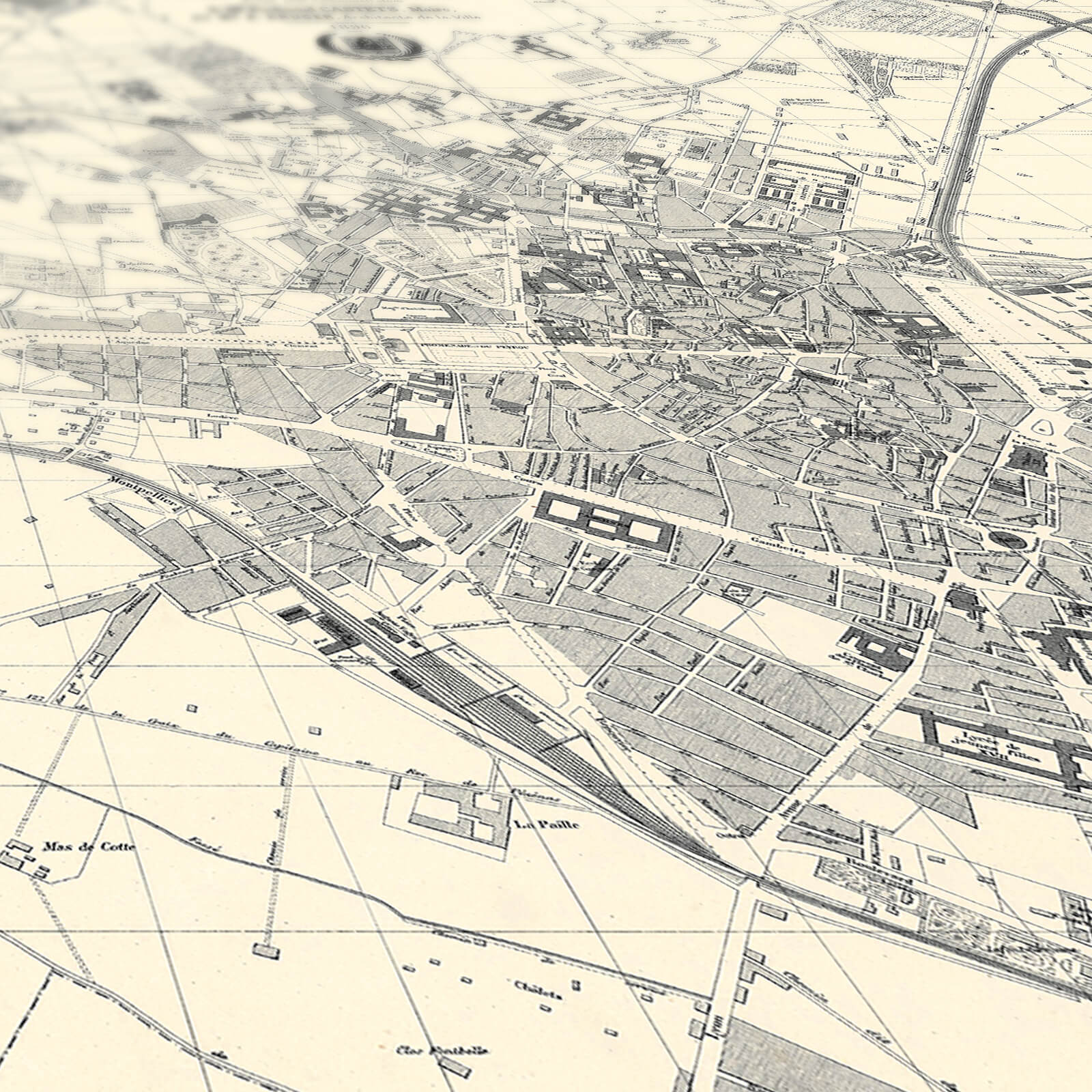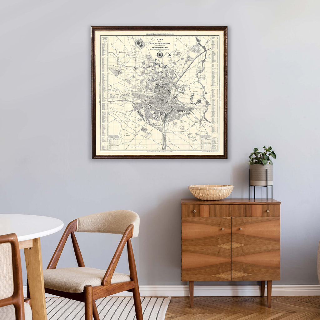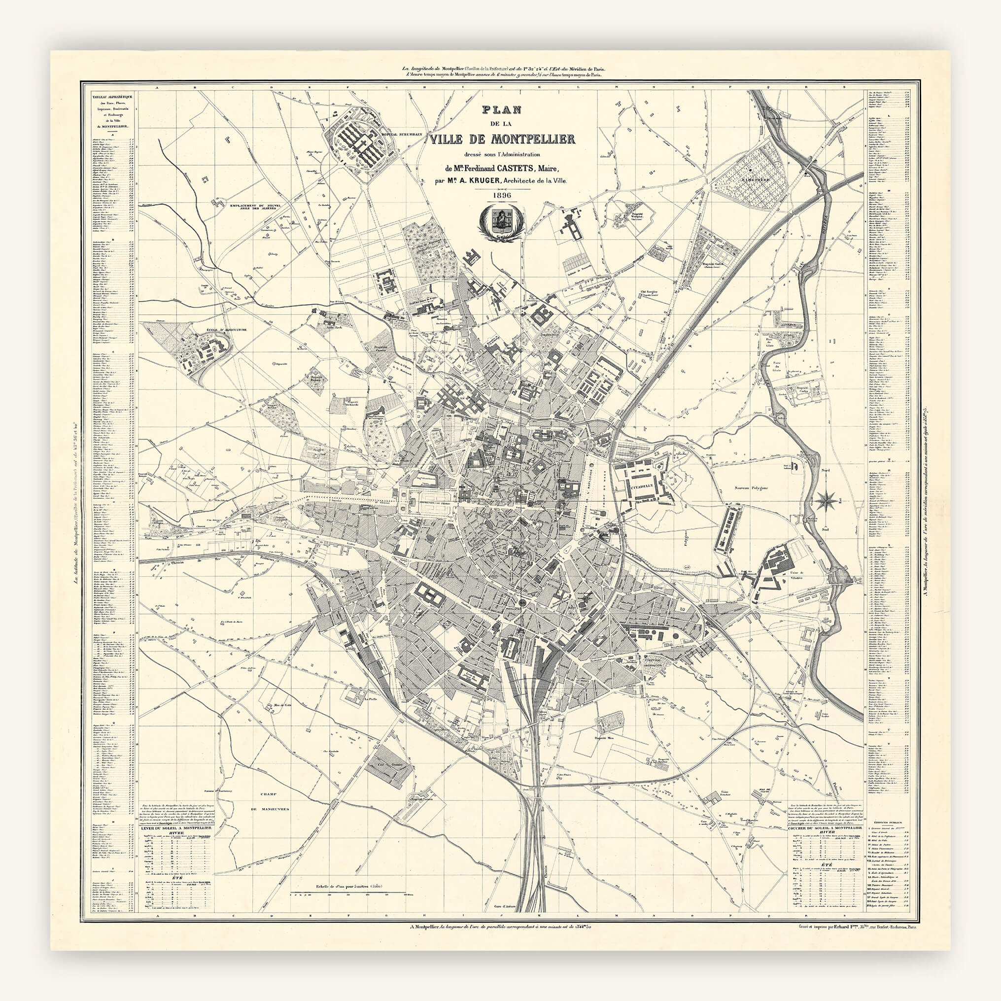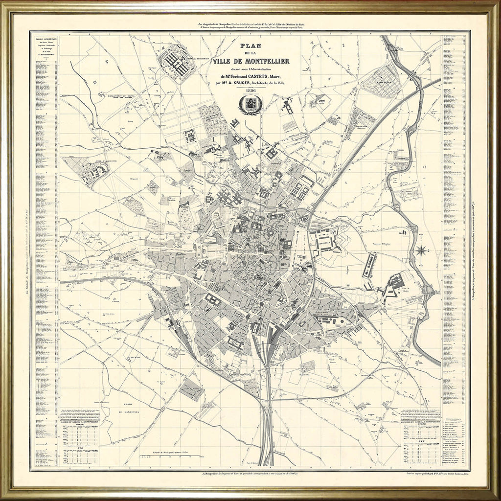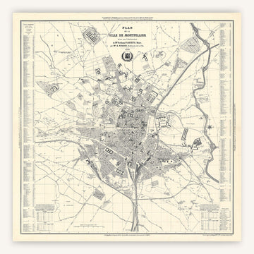 Destination Montpellier et sa géographie de 1896 sur cette réédition de carte ancienne ! Vous pourrez arpenter les rues de cette ville du sud-est grâce au tableau alphabétique des rues, places, impasses, boulevards et faubourgs, qui y figure en légende. Ce plan de la ville de Montpellier offre une vision graphique de la ville, dans un style épuré et moderne, tout en conservant un cachet vintage.