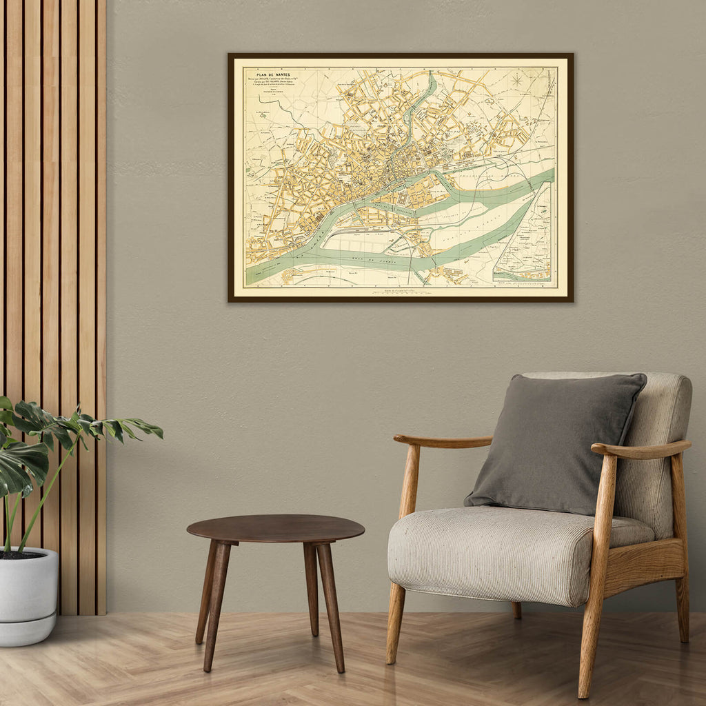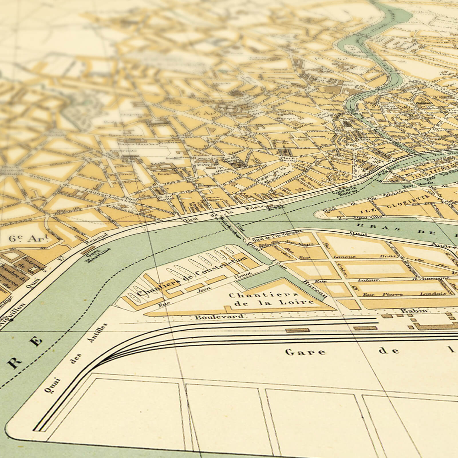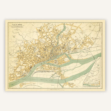 Et si on déambulait dans les rues du Nantes de 1908 ? Sur ce plan réédité, (re)découvrez les tracés, les quartiers de la cité des ducs de Bretagne ! Portée par ses cours d'eau, la ville de Nantes apparaît dans un style vintage et épuré sur cette carte géographique ancienne.