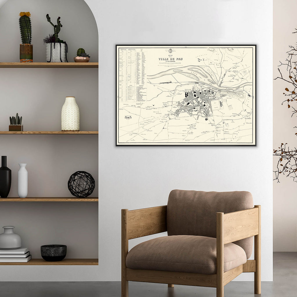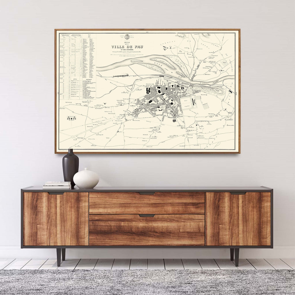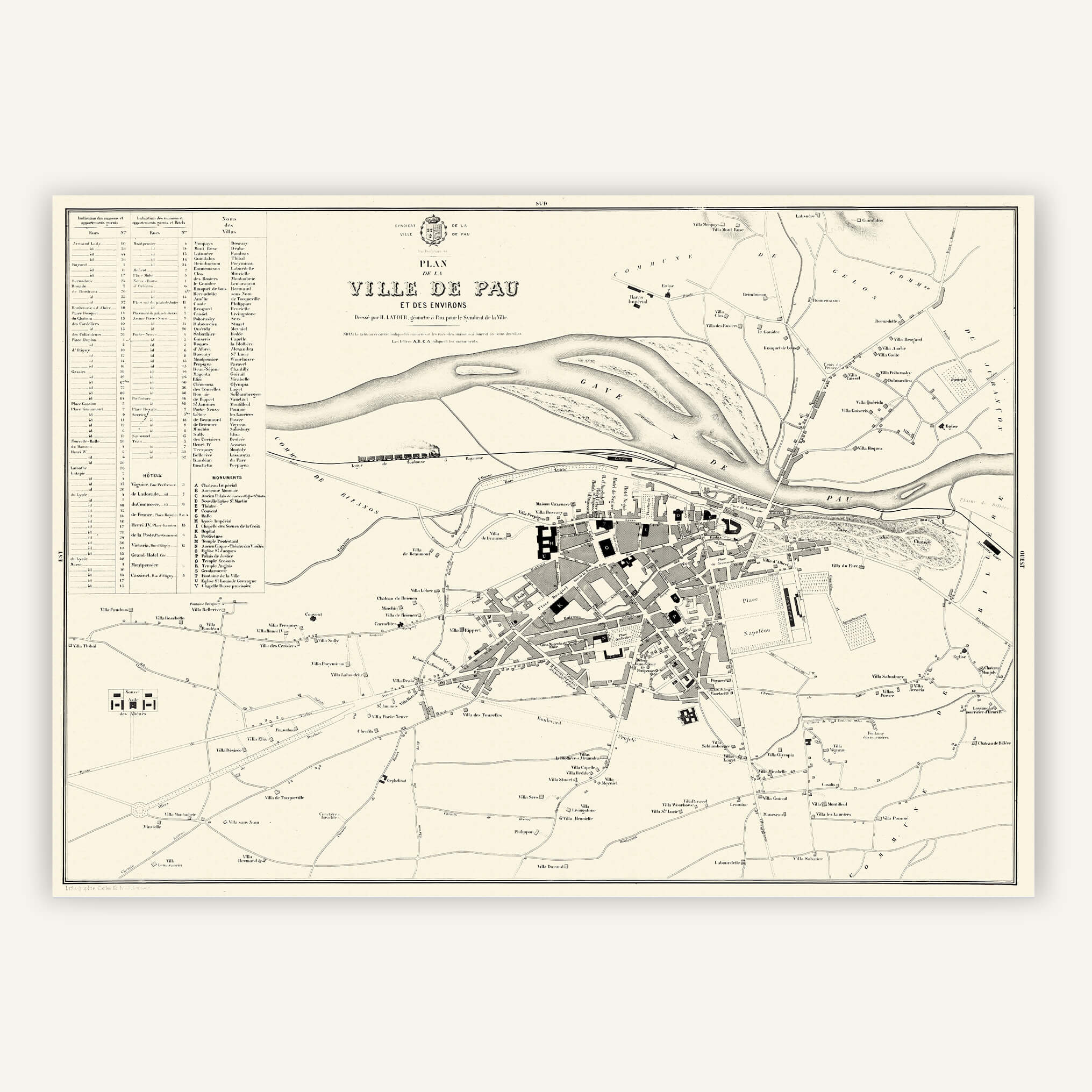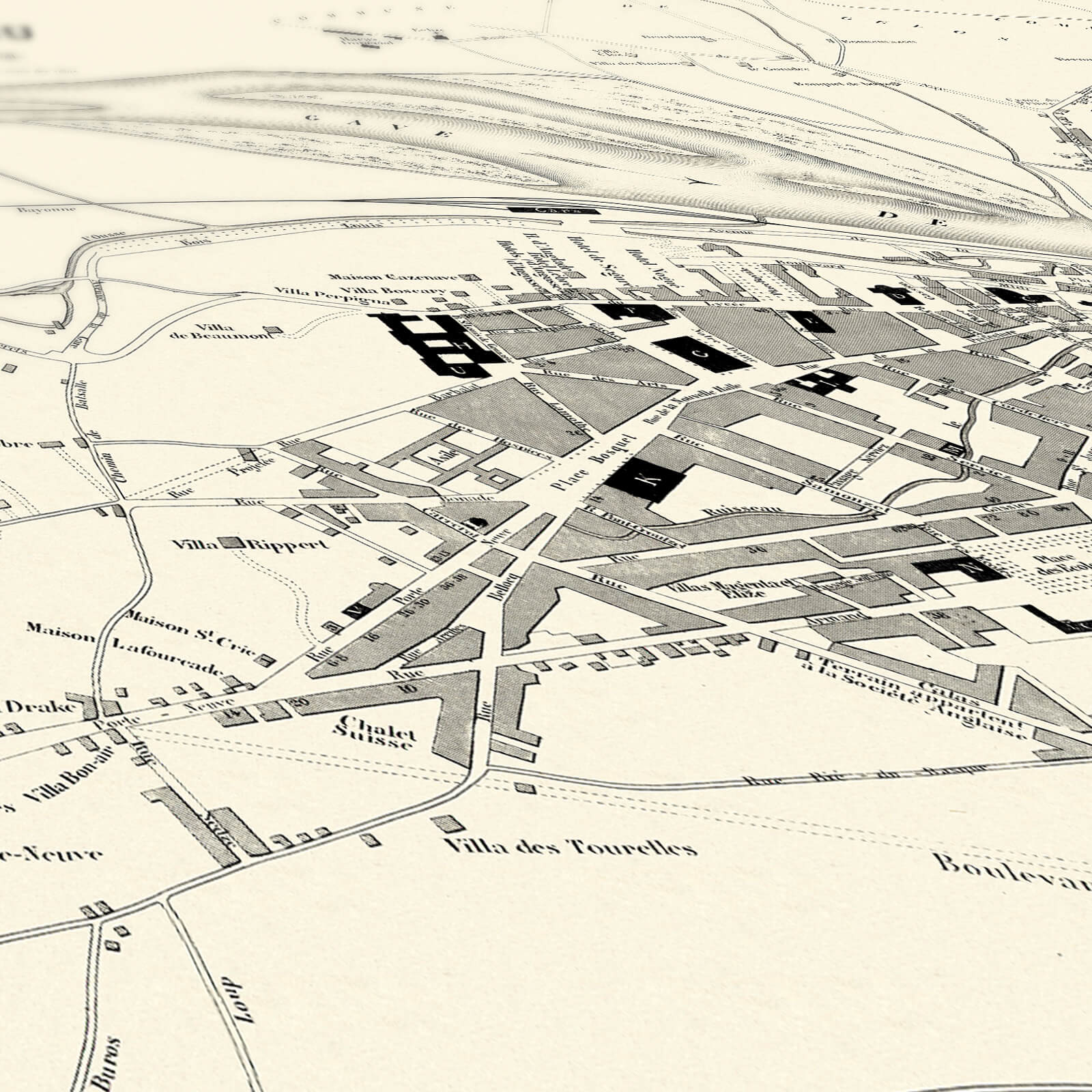 Vue sur les montagnes des Pyrénées depuis la ville de Pau au XIXème siècle ? Grâce à l'impression sur papier de création, l'aspect vintage de cette carte géographique ressort à travers le grain du support et le graphisme du visuel.