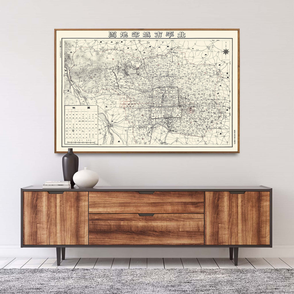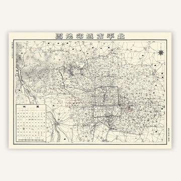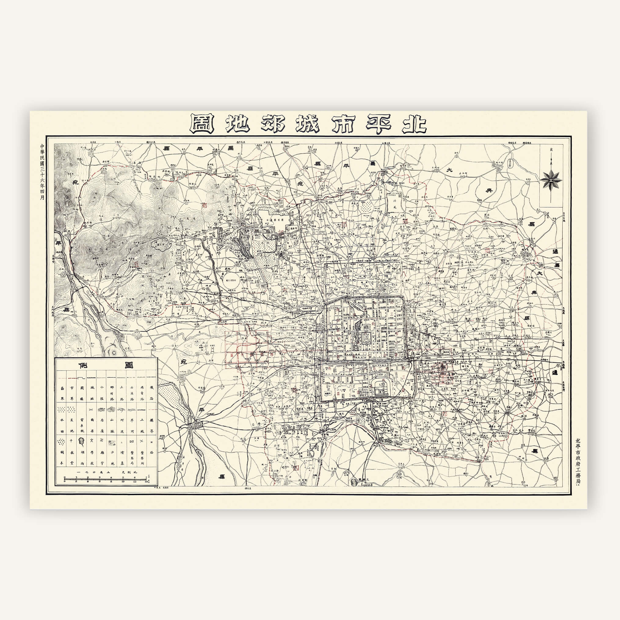 Rendez-vous dans le Pékin de 1947 ? Sur cette réédition d'une ancienne carte géographique, vous serez saisi par les détails des tracés. Les textes sont en chinois.