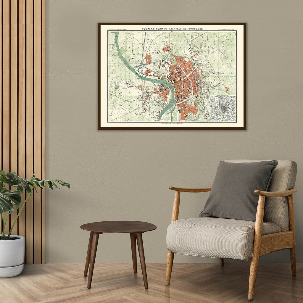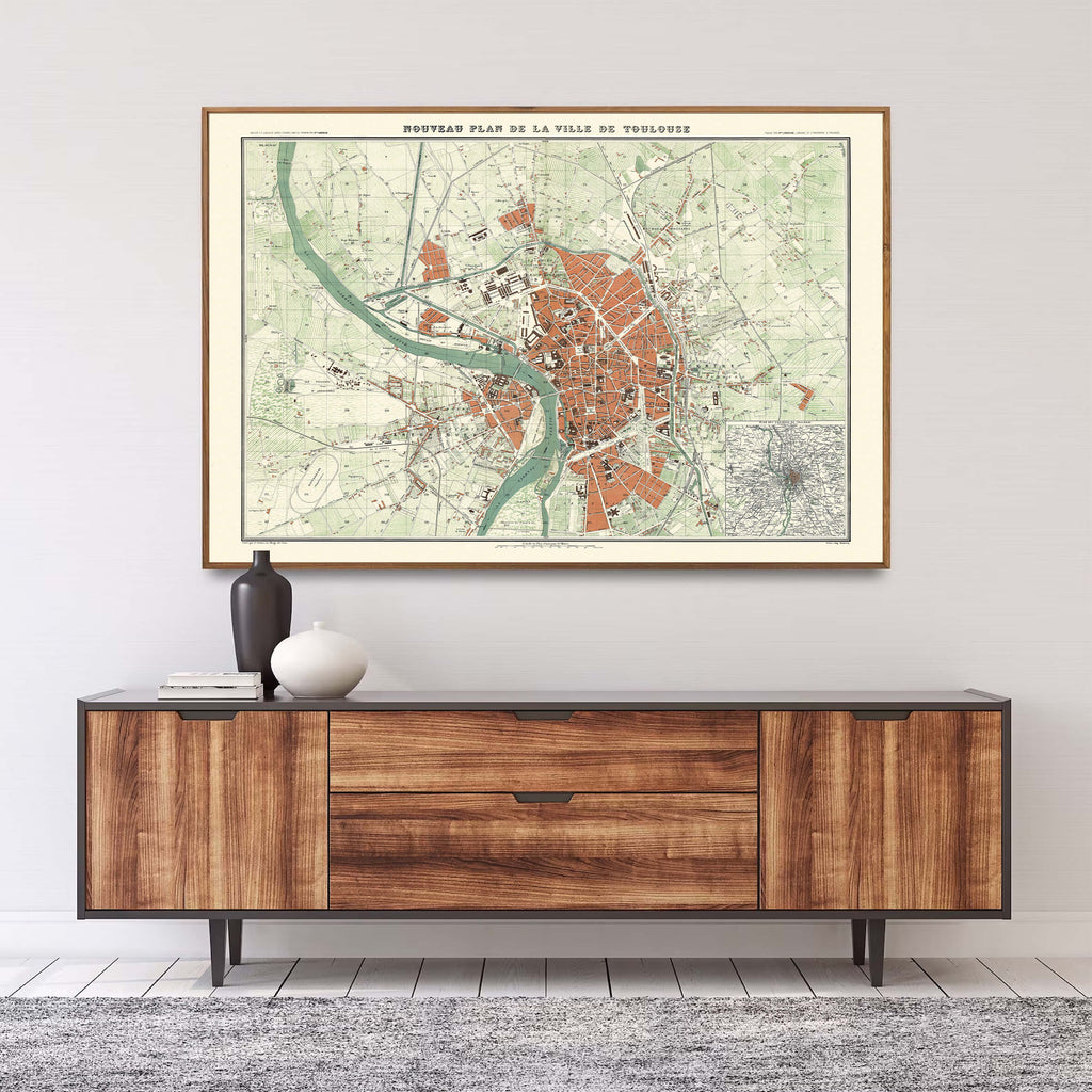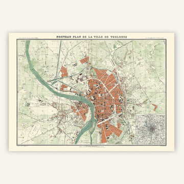 Parmi nos cartes vintage, voici une réédition d'un plan de la ville de Toulouse de 1882 ! Dans des tons ocre et vert pastel, cette carte géographique prend un style rétro tout en offrant une grande précision dans les détails.