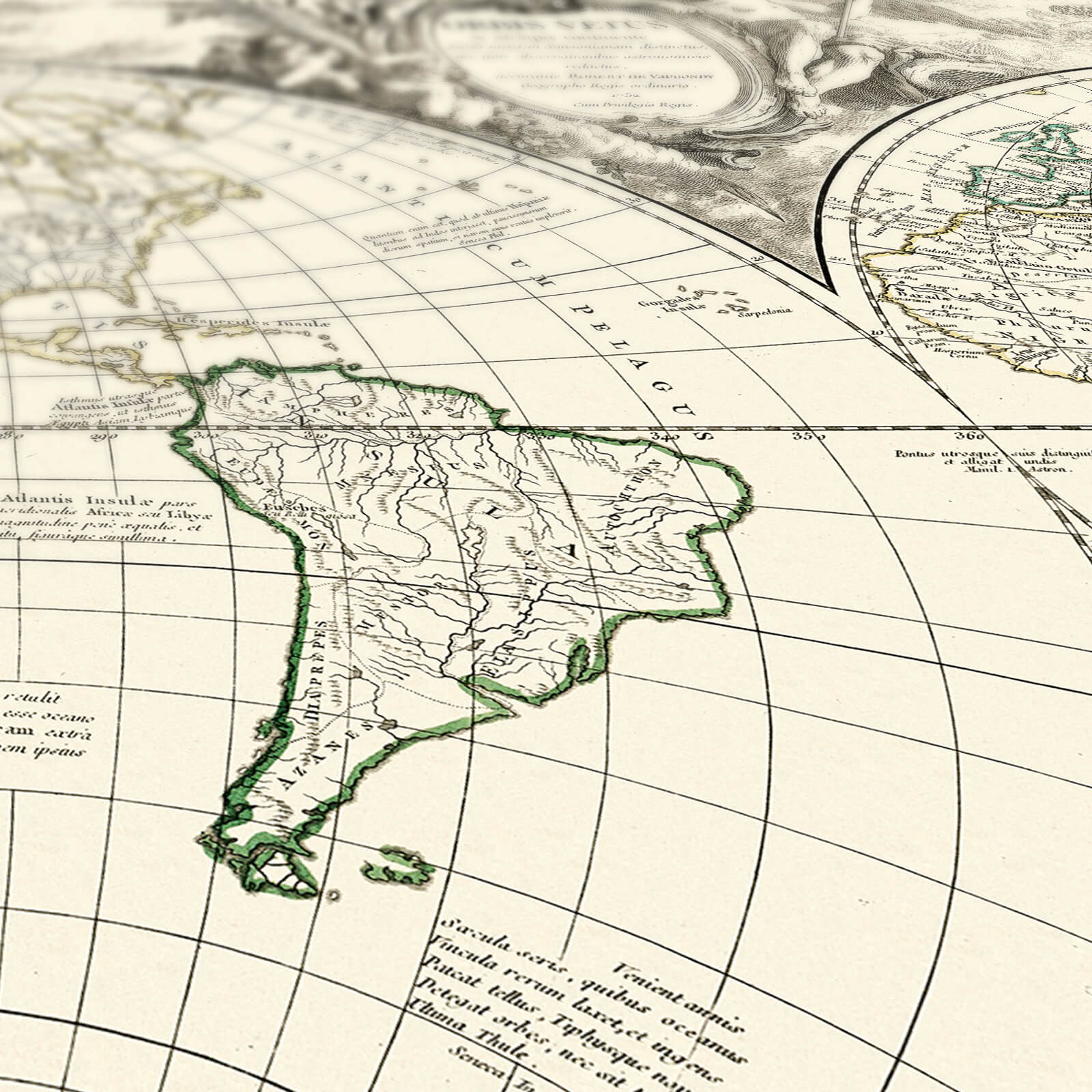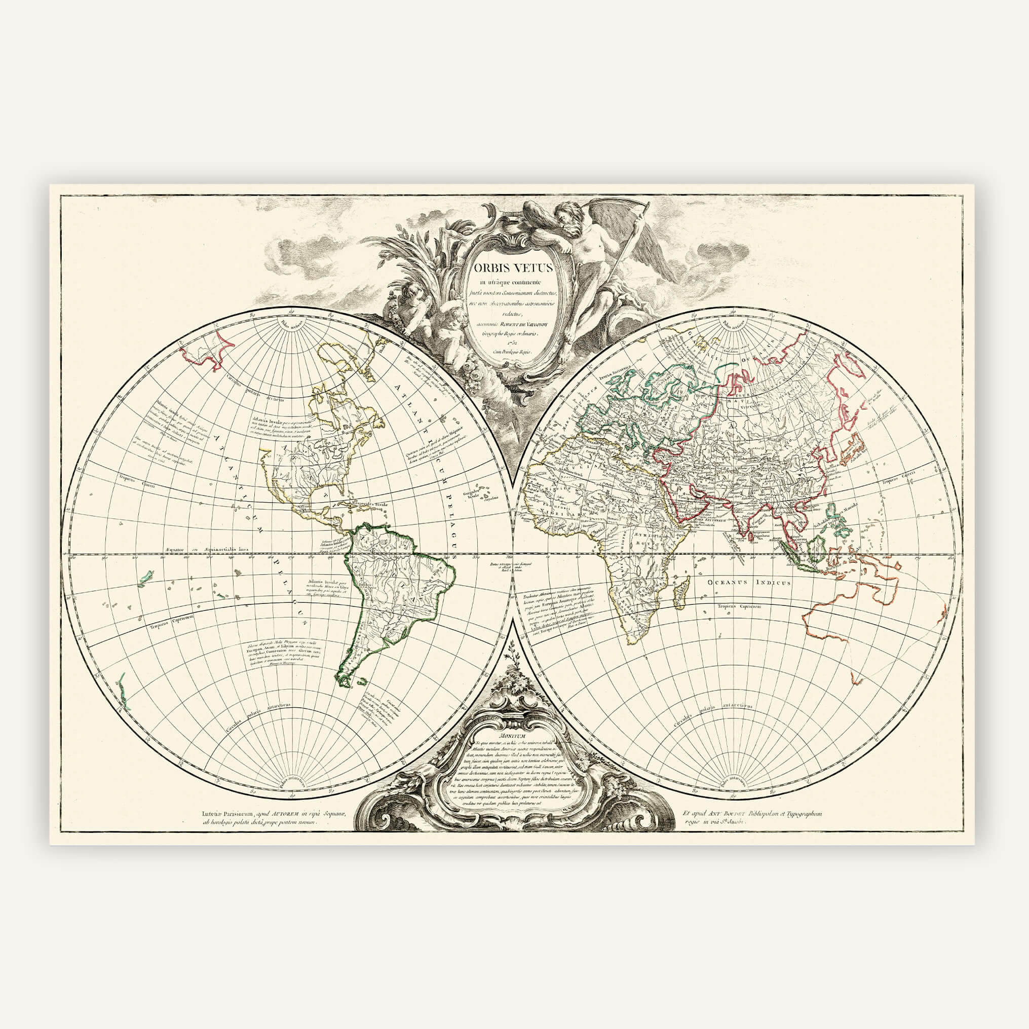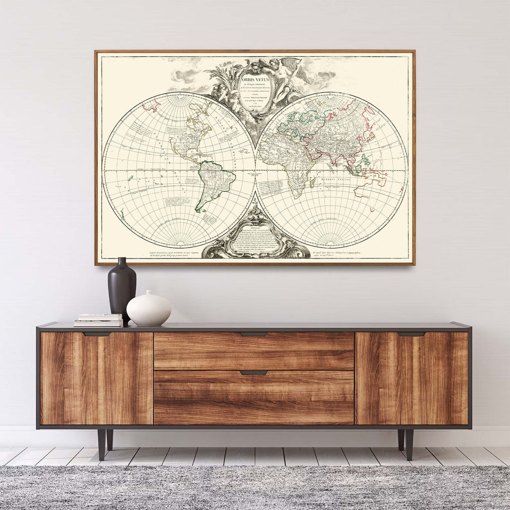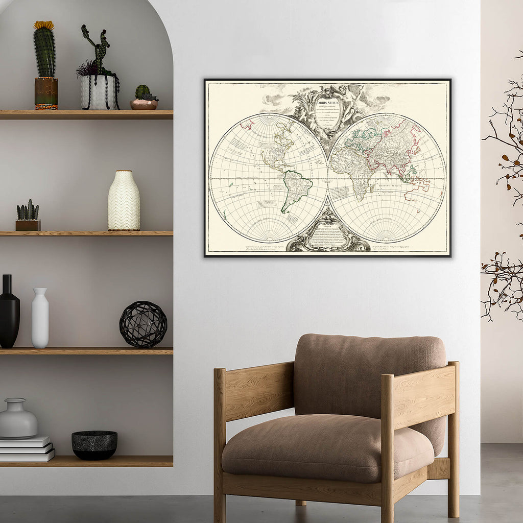 Découvrez notre élégante affiche décorative représentant un planisphère datant de 1752, finement illustré et annoté en latin.