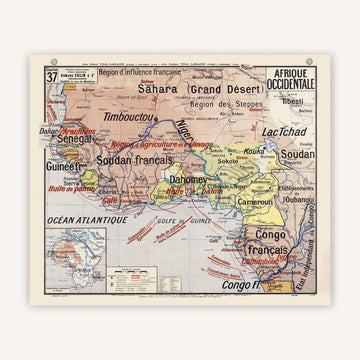 Découvrez notre rare et fascinante carte scolaire (n°37) de l'Afrique Occidentale, un témoignage cartographique essentiel de la période coloniale. Éditée par Armand Colin dans le cadre de l'Atlas Général Vidal-Lablache (dessinée par P. Vidal-Lablache et E. de Martonne), cette carte offre une représentation détaillée des territoires sous influence française et des richesses naturelles de la région.