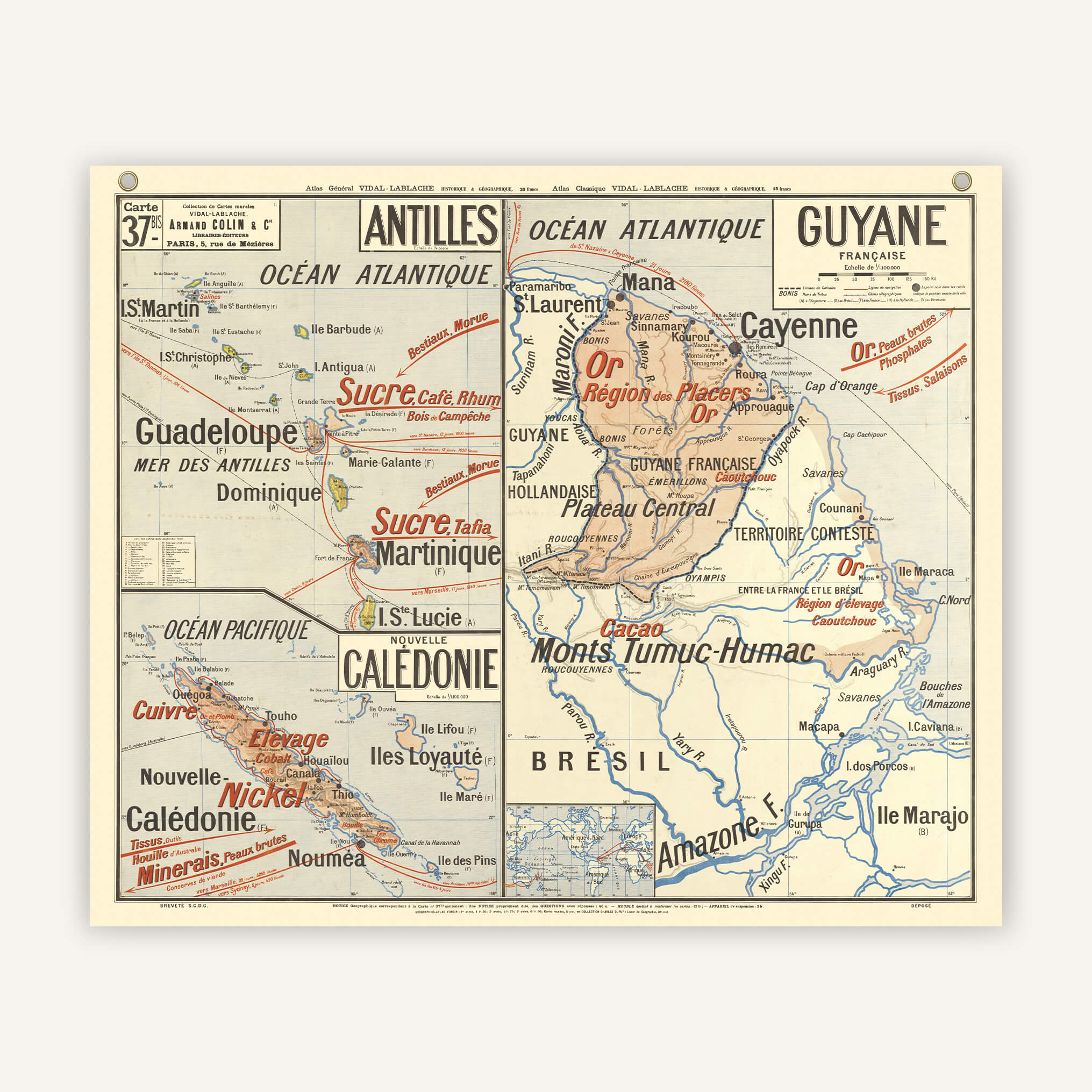 Cette carte, issue de la collection Armand Colin & Cie, était un outil pédagogique essentiel dans les écoles françaises de jadis. Elle offre un aperçu fascinant des territoires d'outre-mer français, tels qu'ils étaient représentés et enseignés à l'époque. Les détails des reliefs, des fleuves, des villes, mais aussi des ressources naturelles (sucres, cacao, minerais) mettent en lumière l'importance économique et stratégique de ces régions pour la France. C'est une véritable leçon d'histoire et de géographie encapsulée dans une seule image, témoignant de l'organisation et de la perception des possessions françaises lointaines.