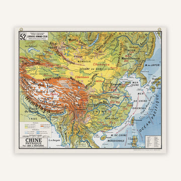 Plongez au cœur de l'Empire du Milieu avec notre superbe carte scolaire (n°52) de la Chine Physique. Éditée par la prestigieuse Librairie Armand Colin et conçue par E. de Martonne, une figure majeure de la géographie, cette carte offre une représentation détaillée et claire des caractéristiques géographiques de la Chine et de ses régions environnantes.