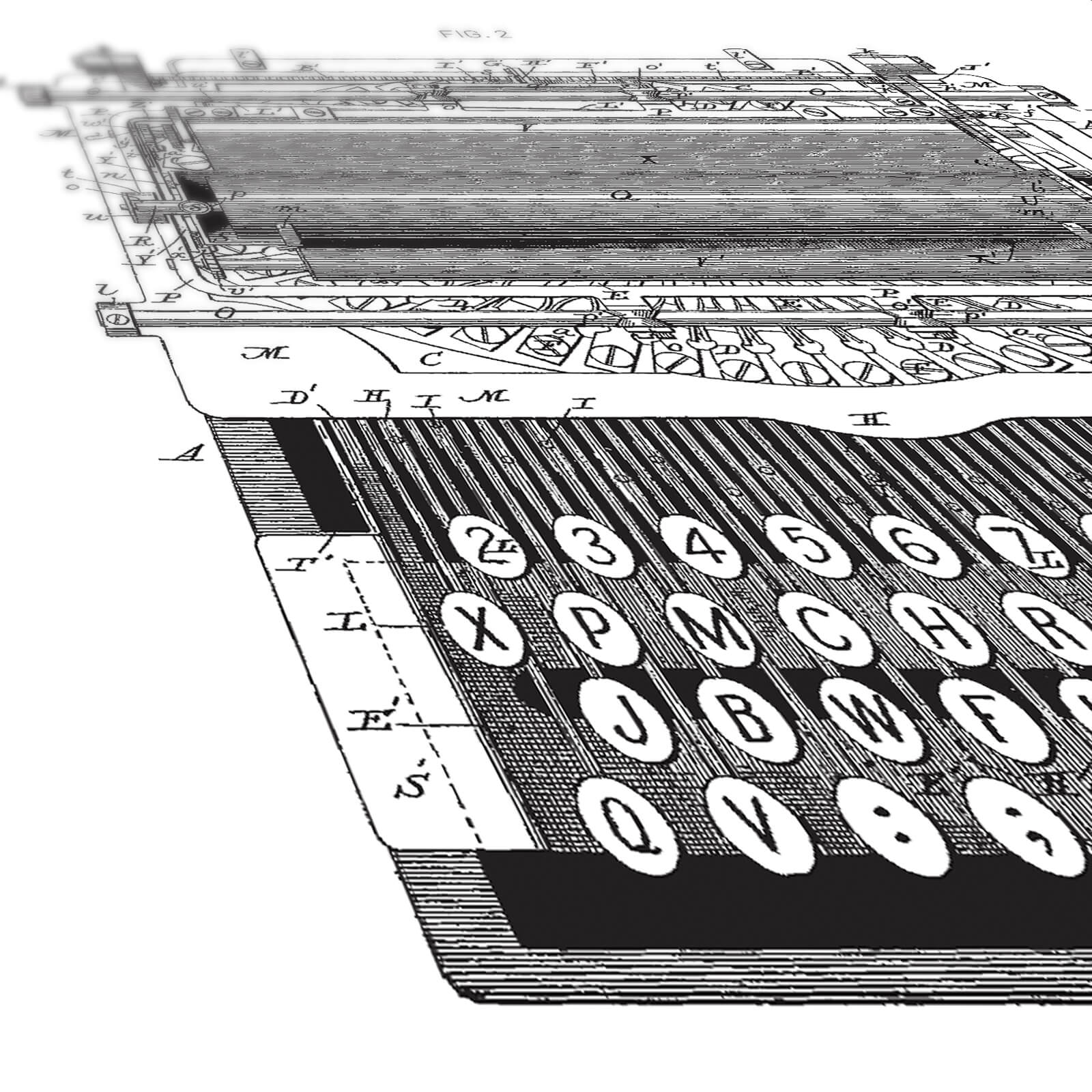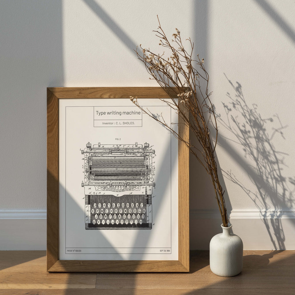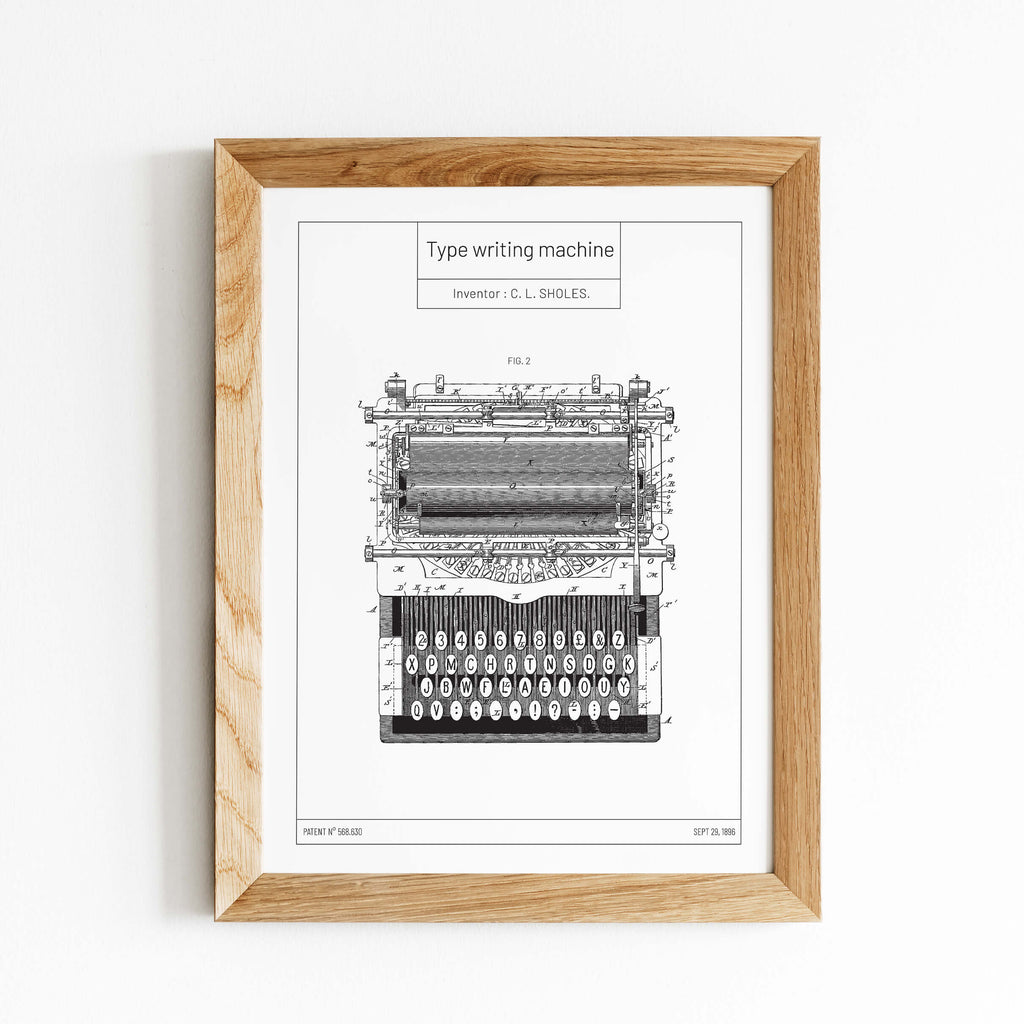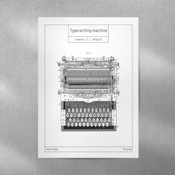 Cette affiche représente le dessin technique original du brevet de la machine à écrire, inventée par Christopher Latham Sholes et déposée en 1896. Véritable pionnier de l’écriture moderne, Sholes est également à l’origine du célèbre clavier QWERTY, encore utilisé sur nos ordinateurs aujourd’hui.