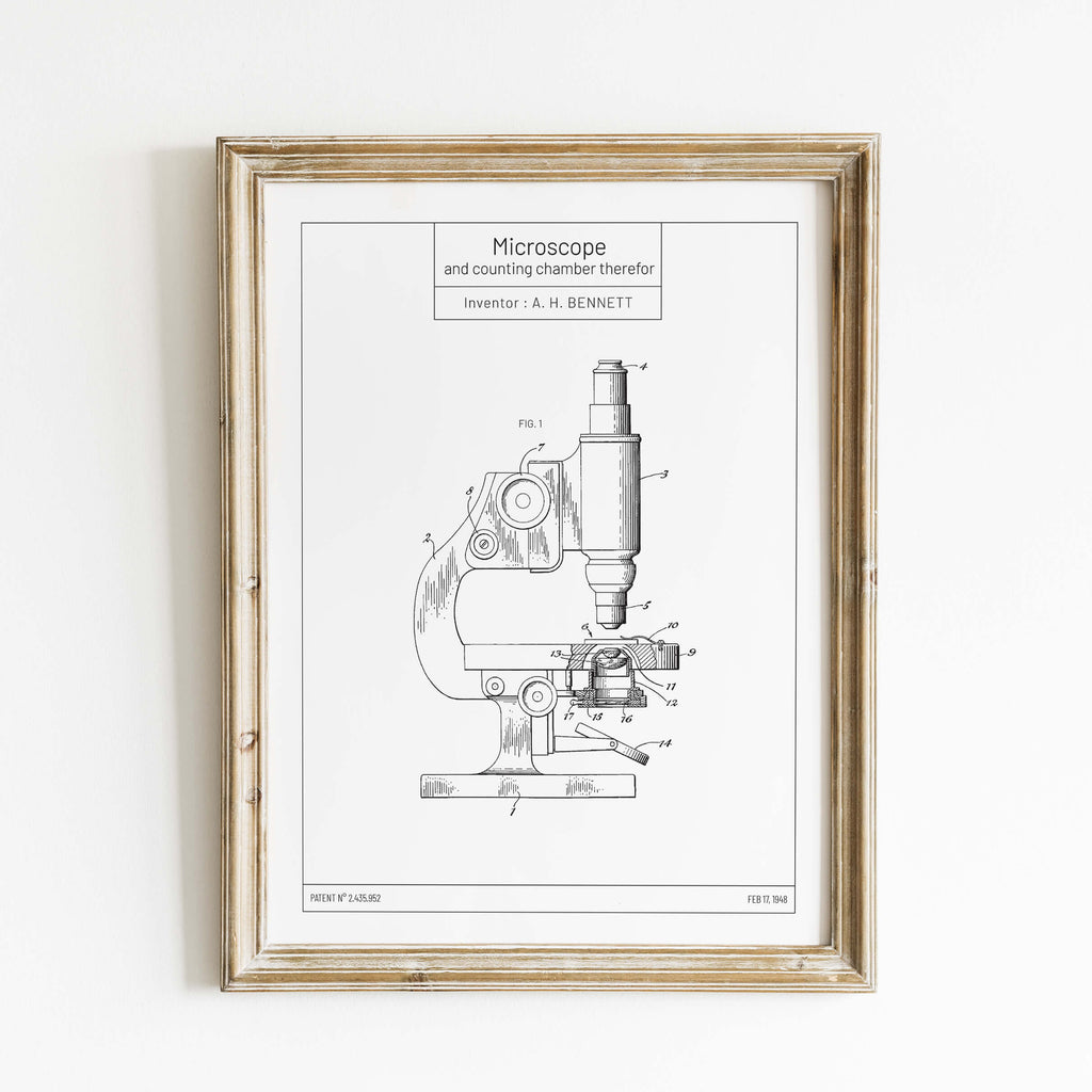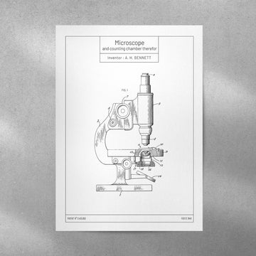 Cette affiche représente le dessin technique original du brevet d'un microscope et de sa chambre de comptage (Microscope and counting chamber therefor), inventé par A. H. Bennett et déposé le 12 février 1946 (Brevet N° 2.422.352). Pièce maîtresse de la recherche scientifique et médicale, cette invention a ouvert la porte à l'étude du monde de l'infiniment petit, transformant la biologie, la médecine et la chimie.