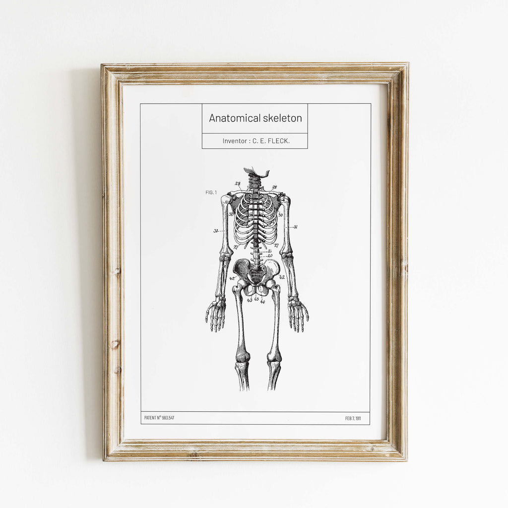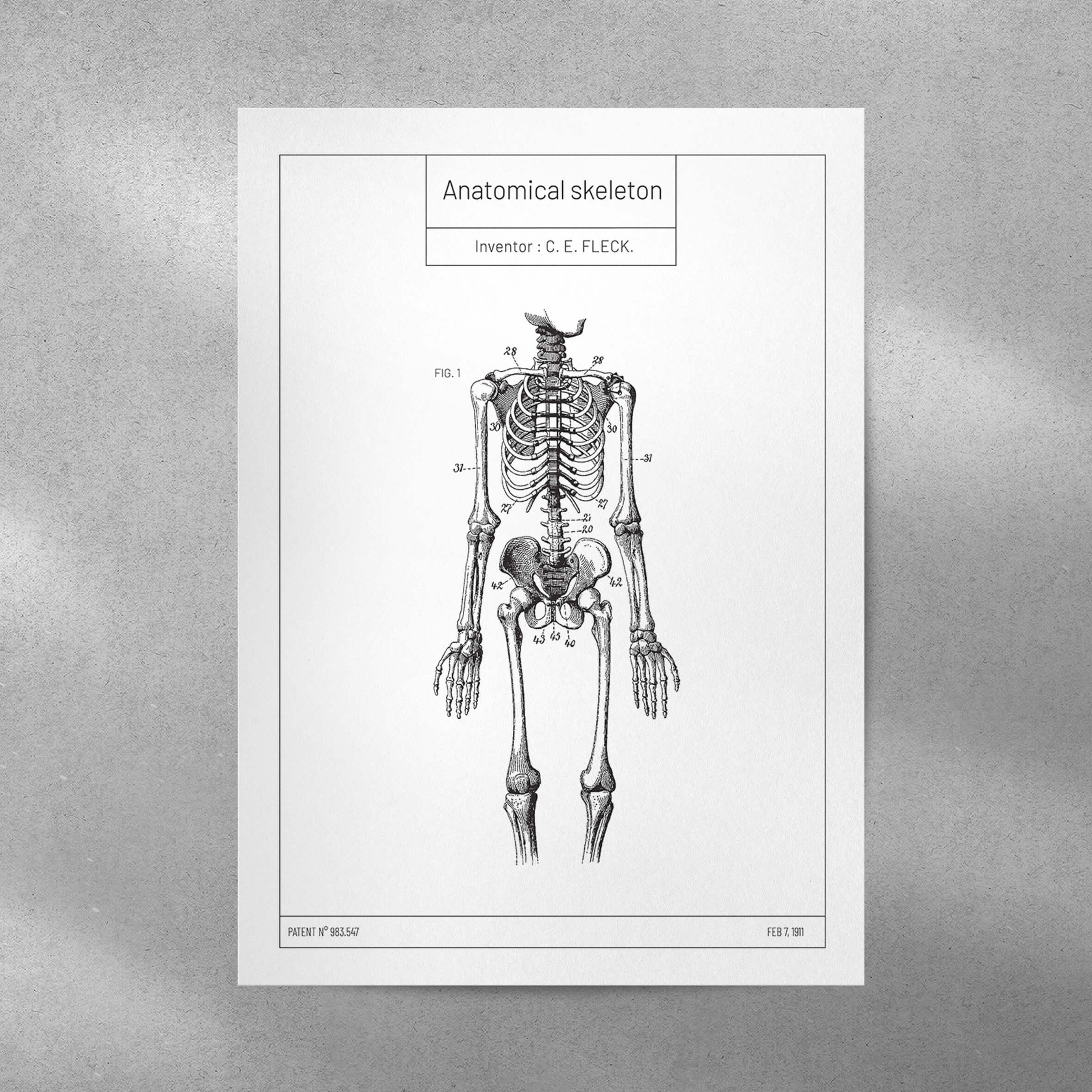 Cette affiche représente le dessin technique original du brevet d'un squelette anatomique, inventé par C. E. Fleck et déposé le 2 février 1981 (Brevet N° 982.542). Outil pédagogique fondamental, ce modèle est indispensable pour l'enseignement et l'étude de l'anatomie humaine, jouant un rôle crucial dans la formation des professionnels de la santé et la compréhension du corps.