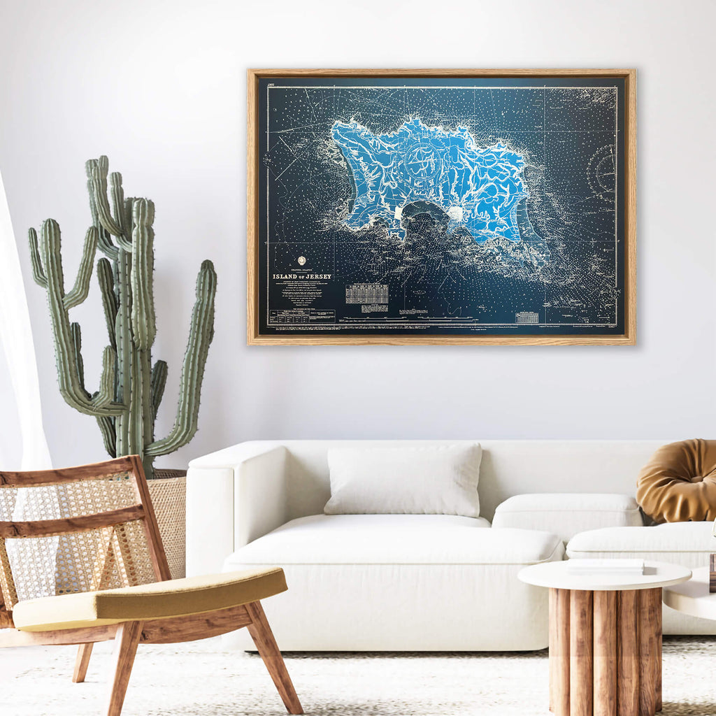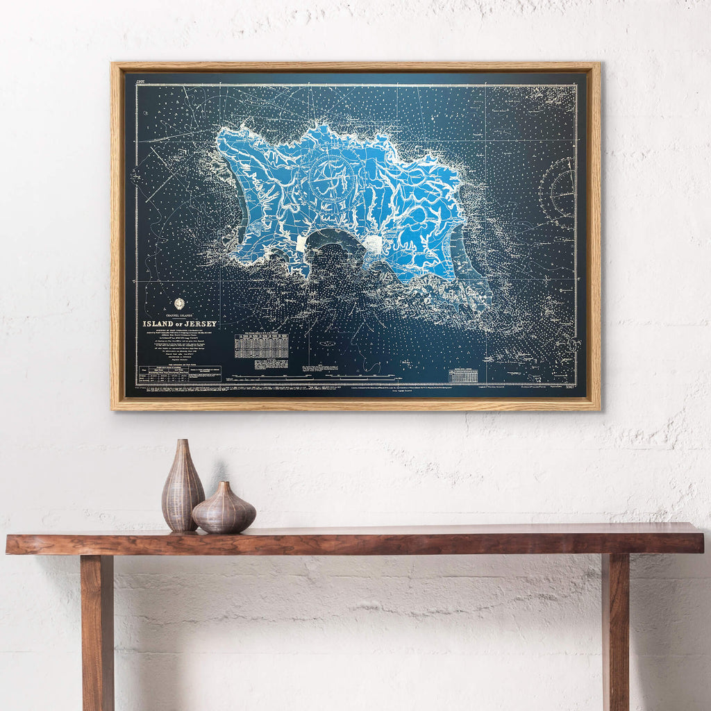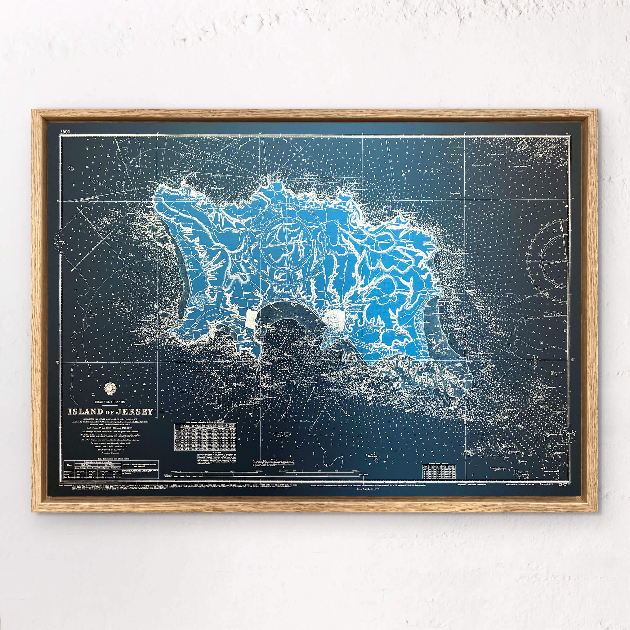 Chaque détail de la cartographie d’époque – contours côtiers, indications topographiques et typographie ancienne – est fidèlement reproduit, offrant non seulement un objet décoratif, mais aussi une fenêtre sur l’histoire maritime et culturelle de Jersey au début du XXᵉ siècle.