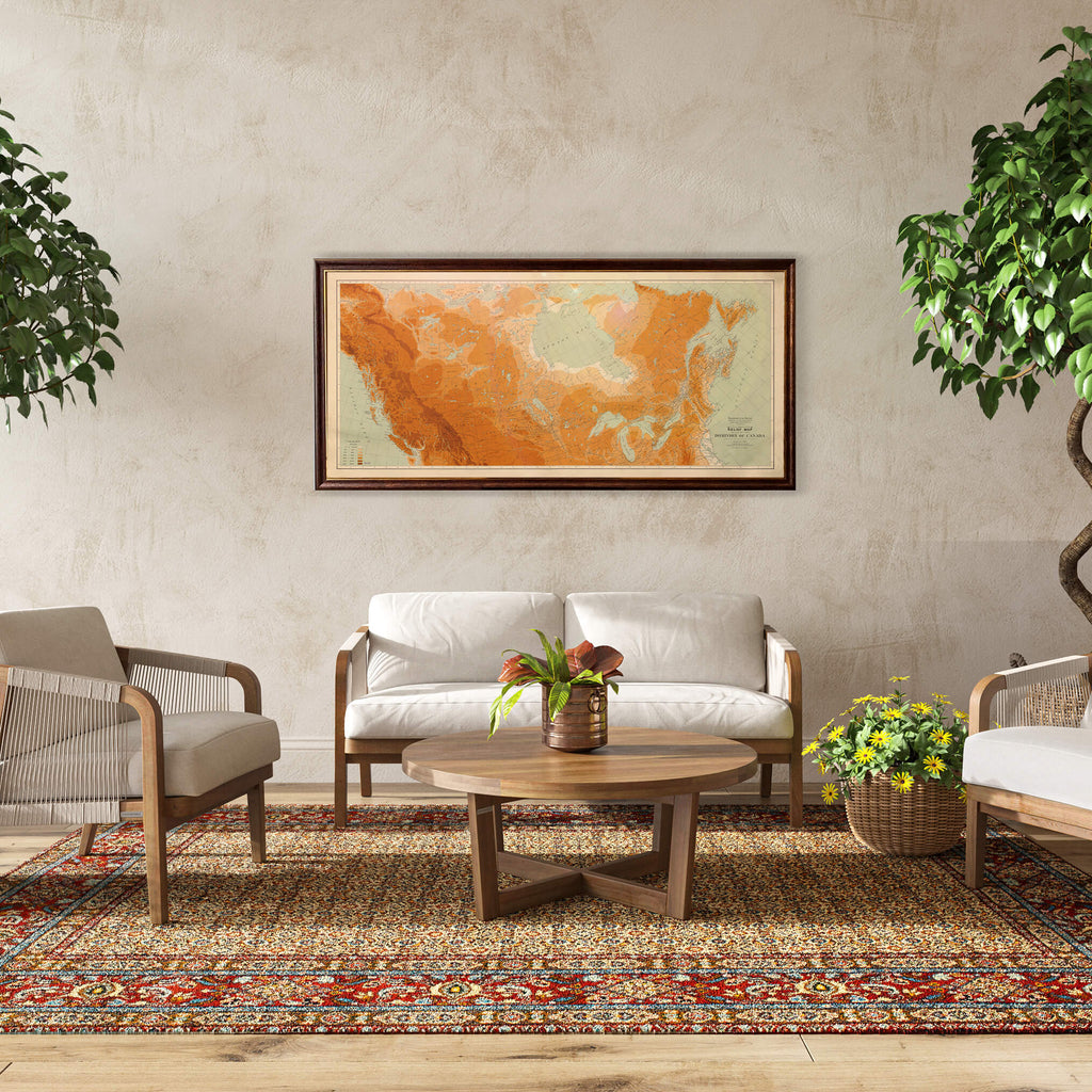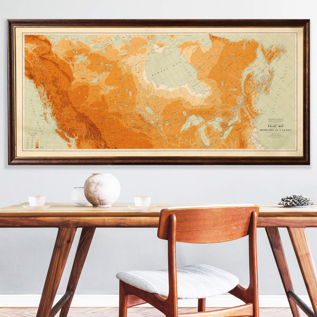 Découvrez cette carte géographique ancienne du Canada en relief et aux couleurs de l'automne sur cette affiche vintage.
