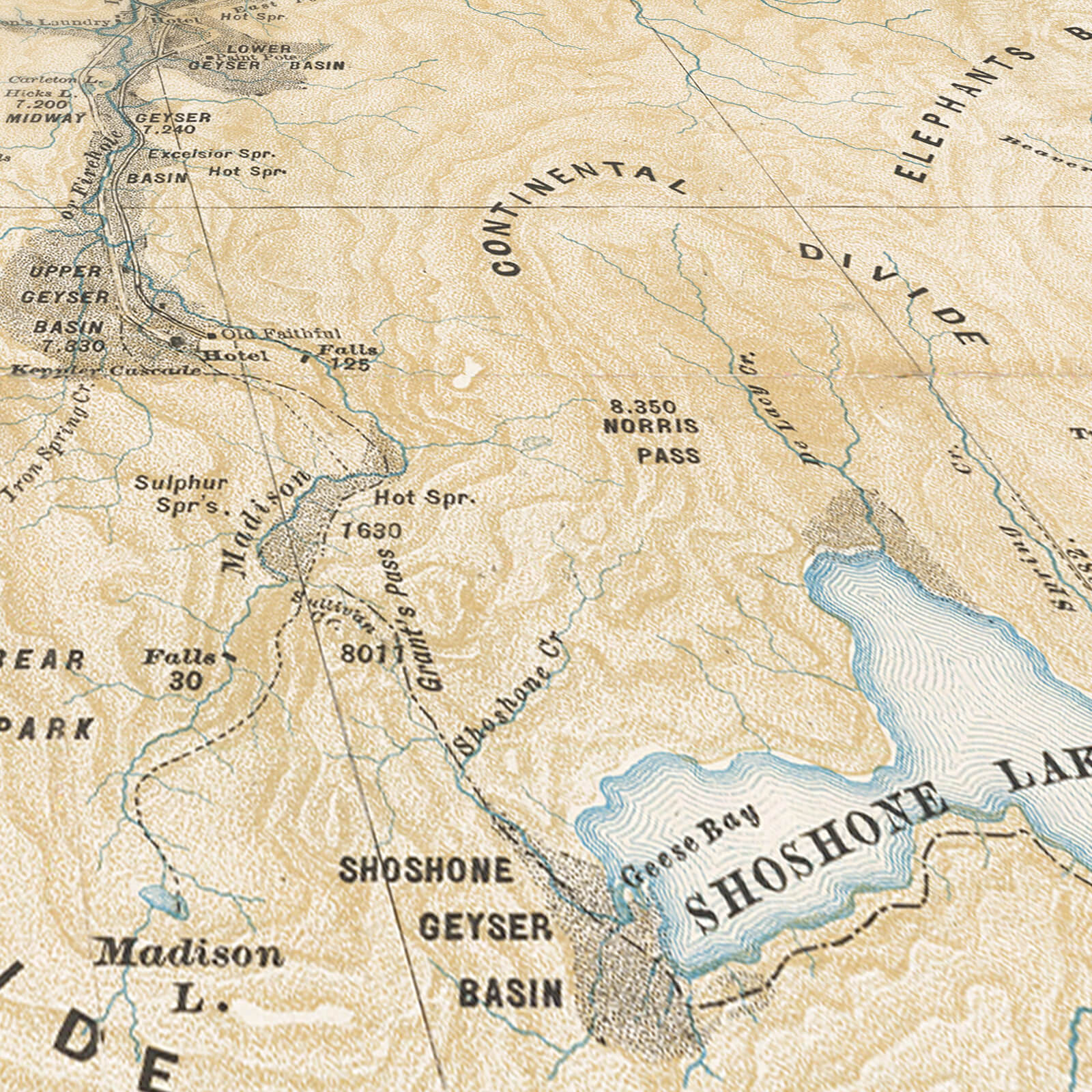 Elle offre un aperçu inestimable des premières explorations et levés topographiques dans ce territoire encore largement sauvage, révélant avec une grande précision l'étendue des lacs (comme le Lac Yellowstone), les caractéristiques géothermiques et le tracé naissant des routes et sentiers d'accès pour les visiteurs.
